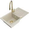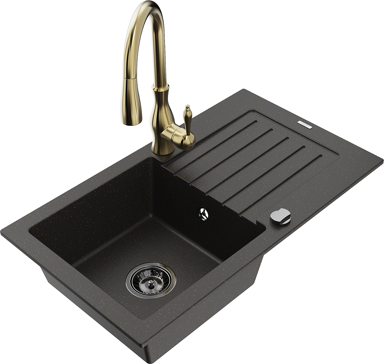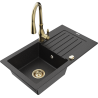 Mexen Pablo granitinė vienos kameros kriauklė su nusausintuvu ir virtuviniu maišytuvu Savita, juoda/auksinė metalinė