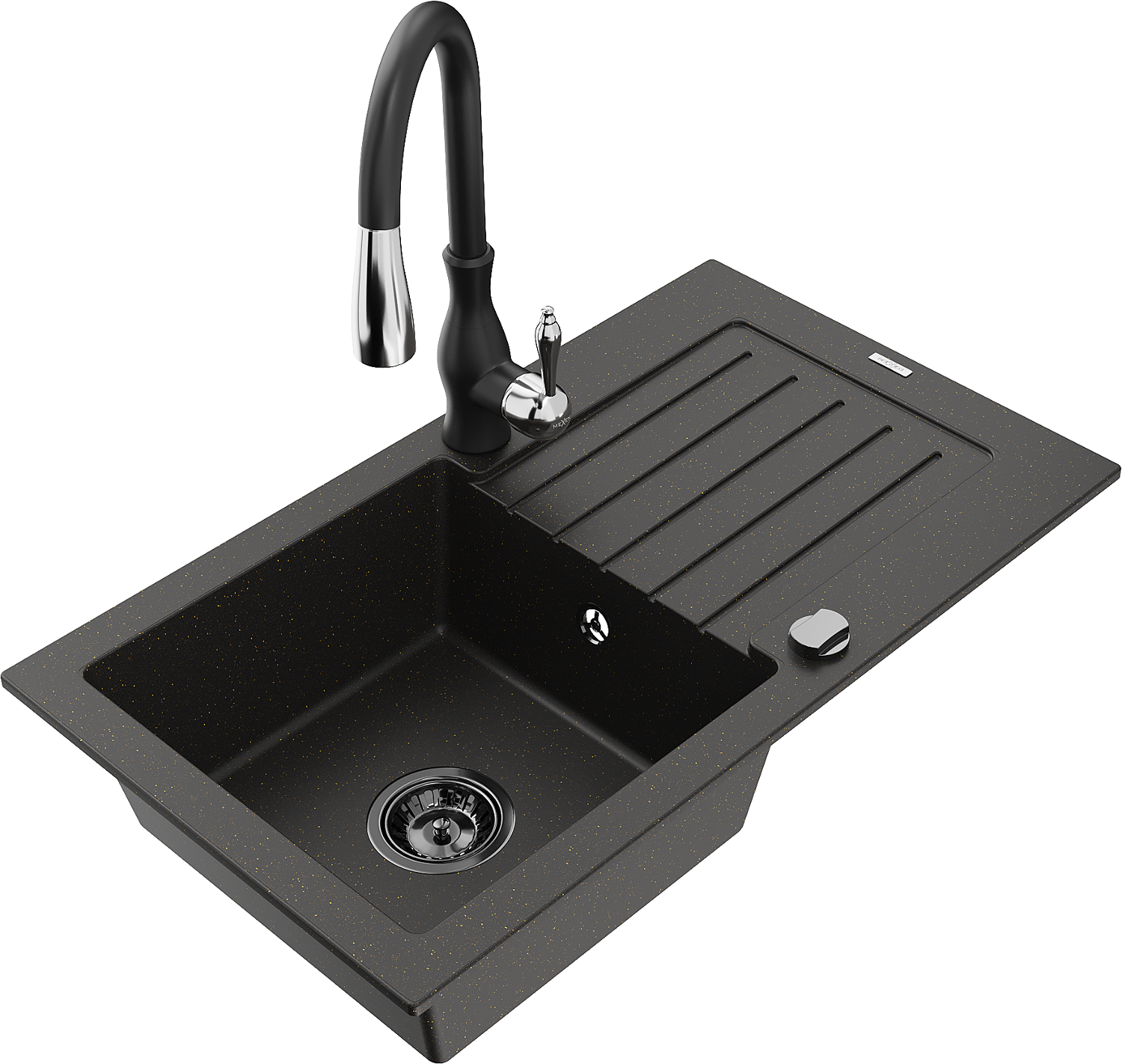 Mexen Pablo vienkamerinė akmens masės plautuvė su nusausinimo skydu ir virtuviniu maišytuvu Savita, juoda/auksinė metalo