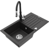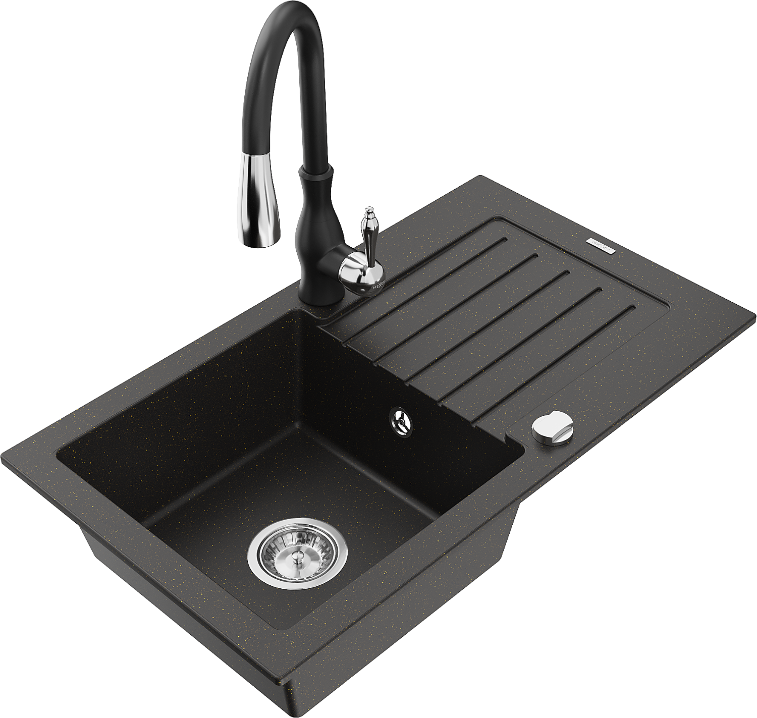 Mexen Pablo granitinė vienos kameros kriauklė su nuvarvėjimo paviršiumi ir virtuvės maišytuvu Savita, juoda/auksinė