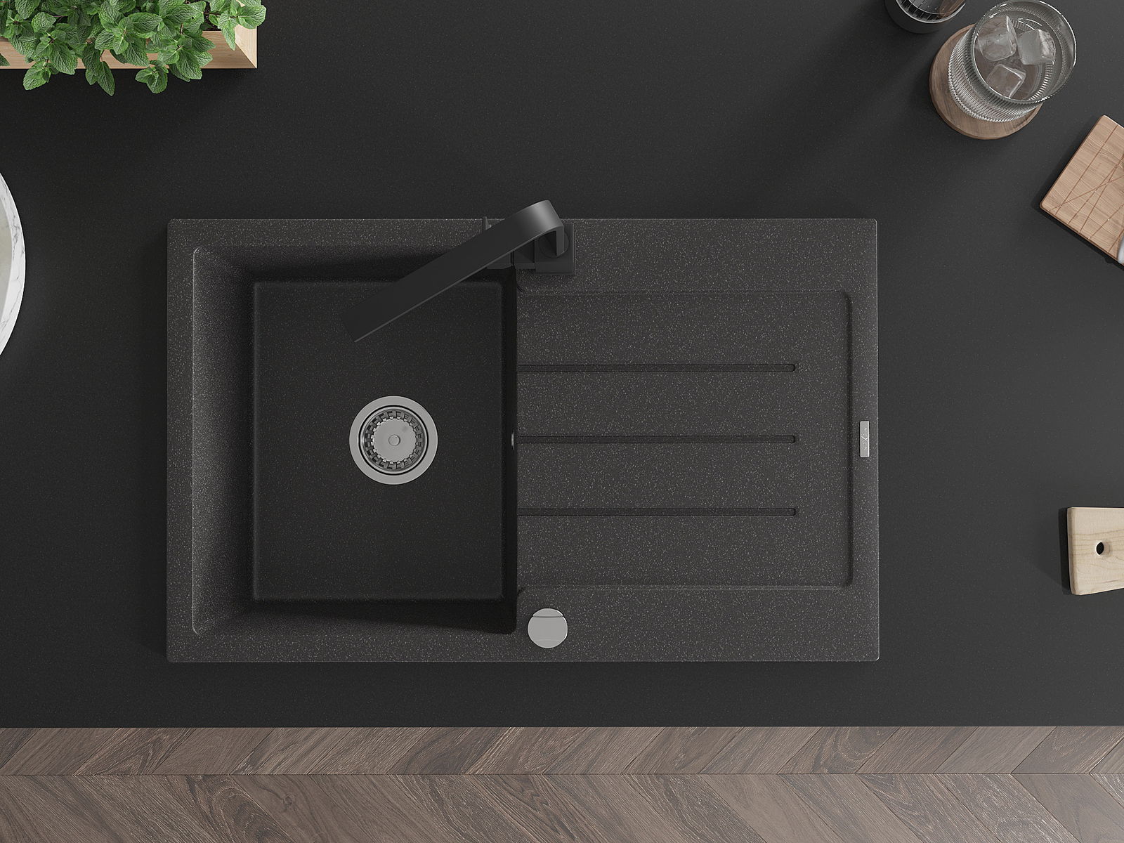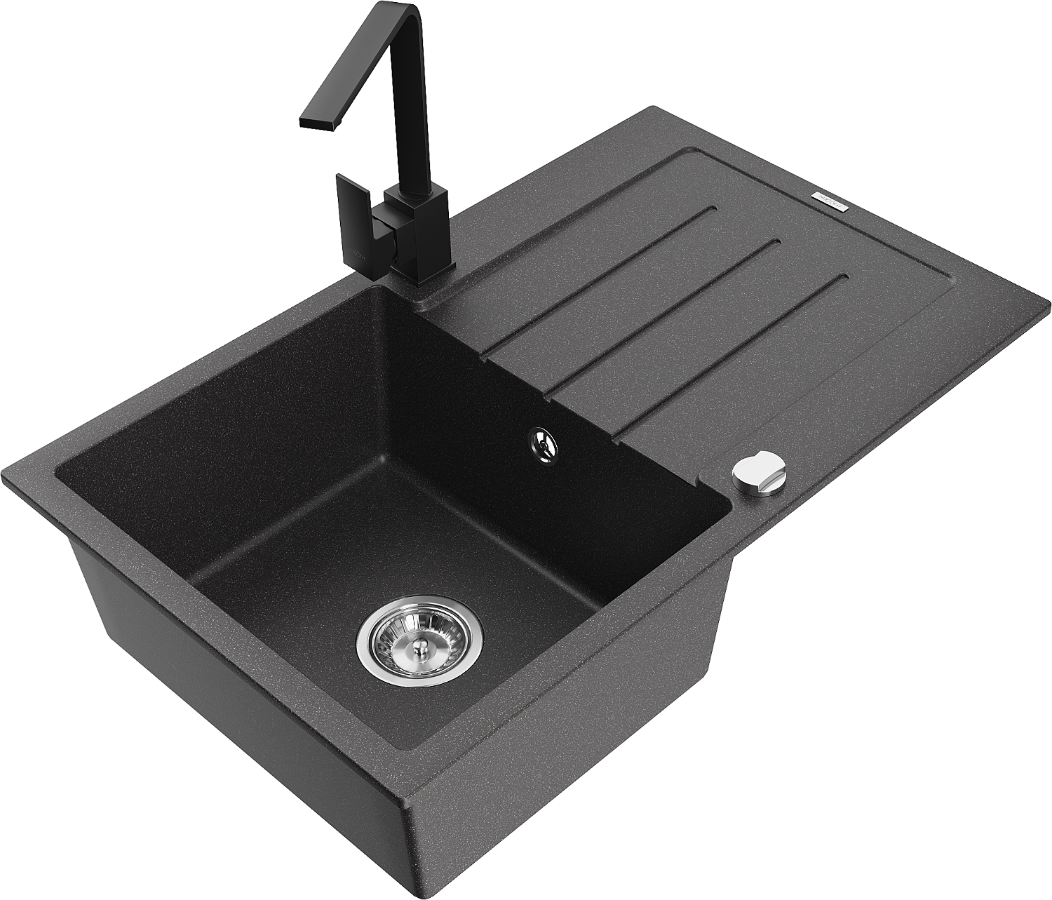 Mexen Bruno granitinė vienos kameros plautuvė su nutekamąja dalimi ir virtuviniu maišytuvu Rita, juodas su dėmėmis