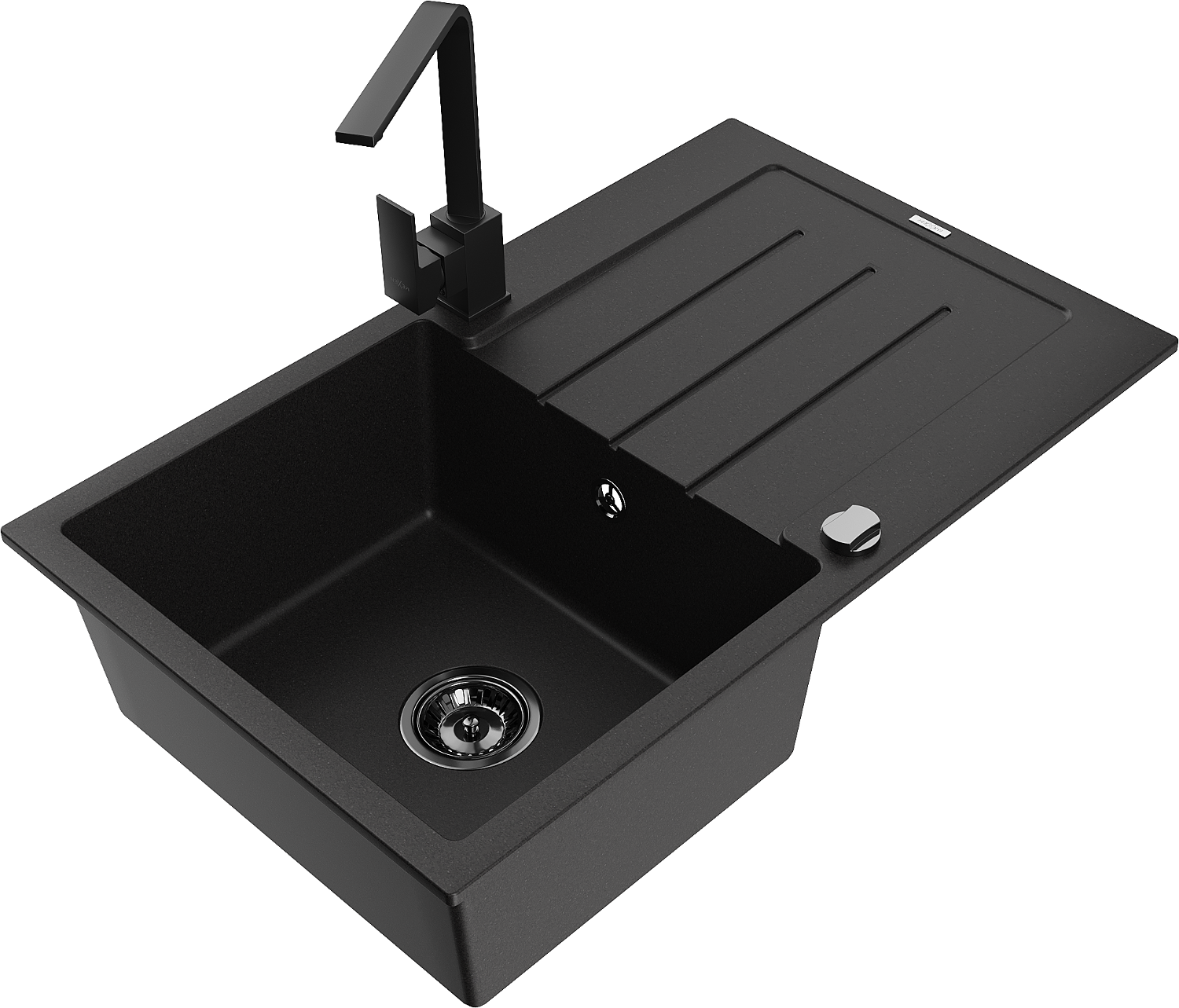 Mexen Bruno granito kriauklė 1-dubens su nusausintuvu ir virtuviniu maišytuvu Rita, juoda - 6513-77-670300-70-B