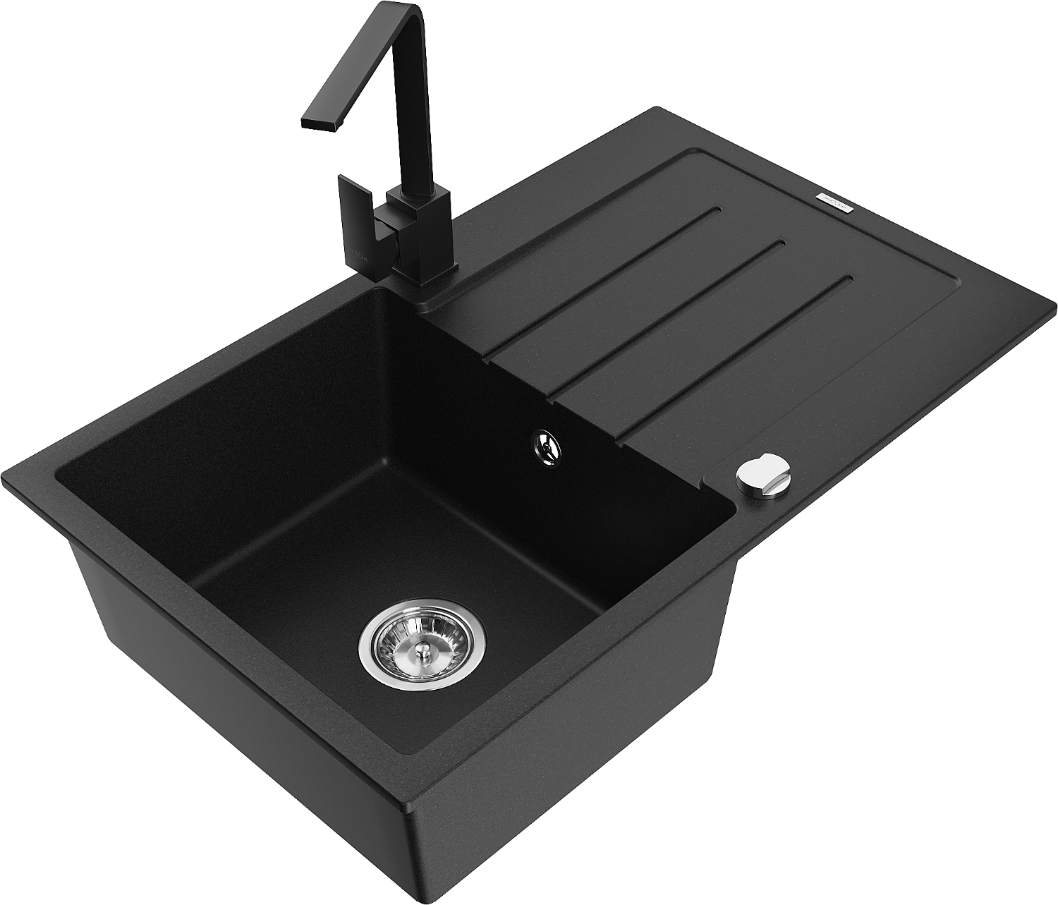 Mexen Bruno granito plautuvė su vienu dubeniu ir nutekėjimo lentyna bei virtuviniu maišytuvu Rita, juoda - 6513-77-670300-70