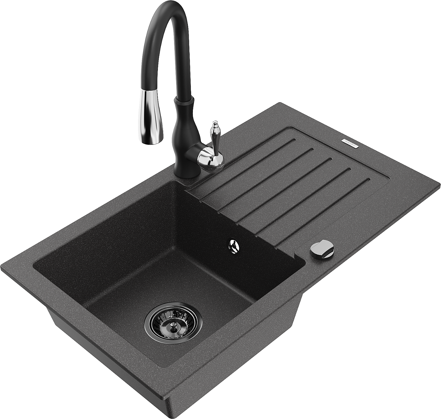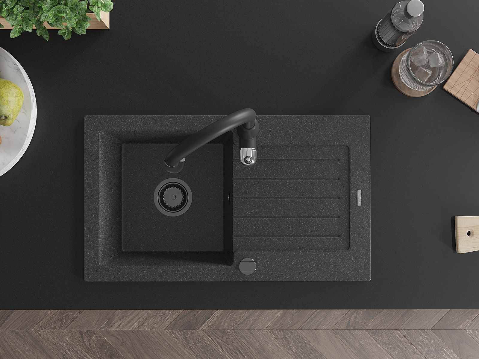 Mexen Pablo granito kriauklė su vienu dubeniu ir nutekėjimu bei virtuvės maišytuvu Savita, juoda dėmėta - 6510-76-672601-70-B