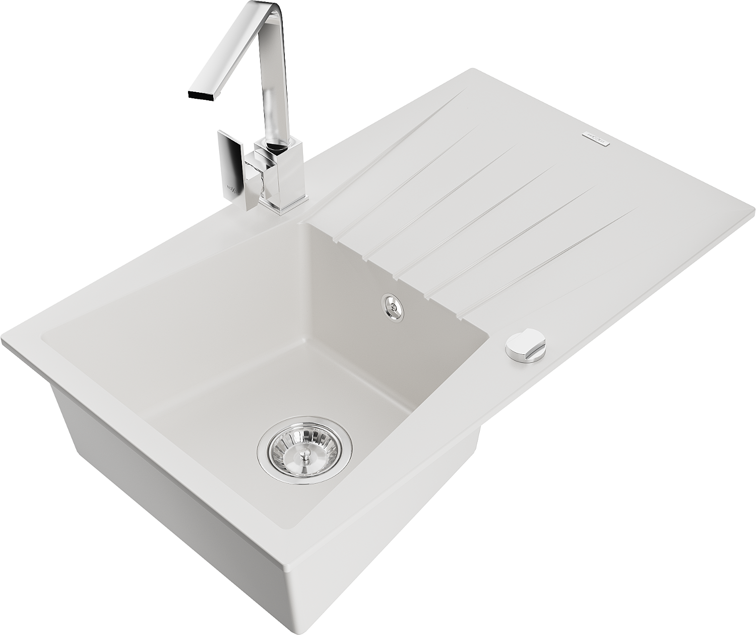 Mexen Cesar vienos dubenėlės sušlapinimo granito kriauklė su virtuviniu maišytuvu Rita, balta - 6514-20-670300-00