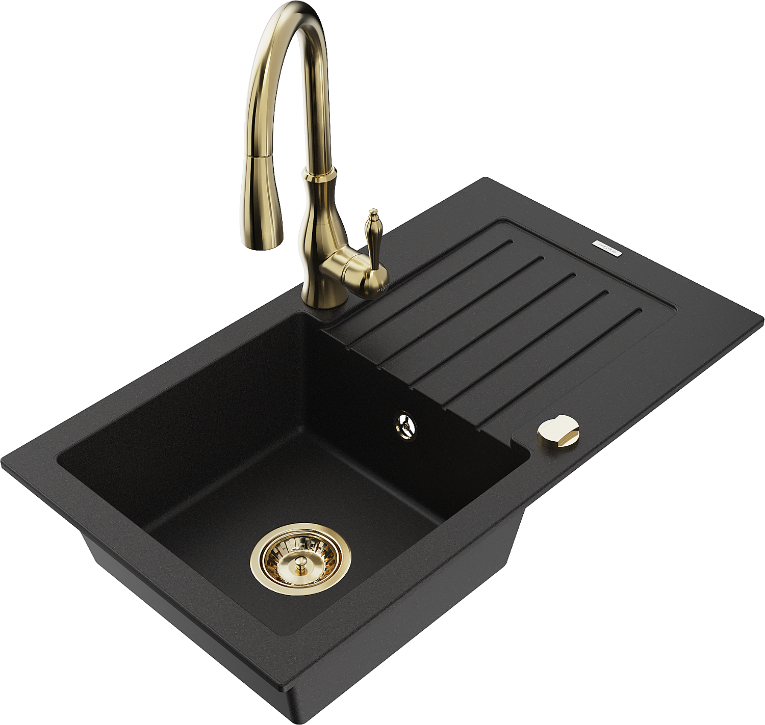 Mexen Pablo granitinis vienos kameros plautuvė su nutekėjimu ir virtuviniu maišytuvu Savita, juodas - 6510-77-672601-50