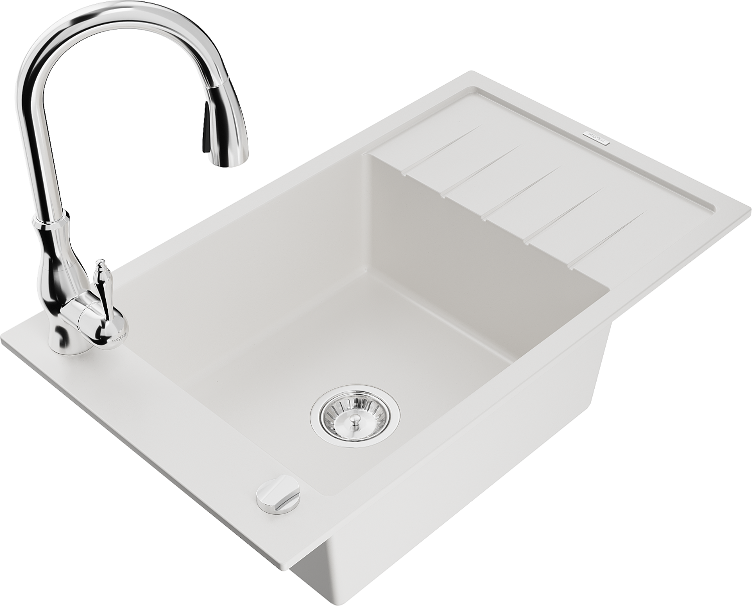 Mexen Elias granitinė vieno dubens kriauklė su nusausintuvu ir virtuvinis maišytuvas Savita, balta - 6511-20-672601-00