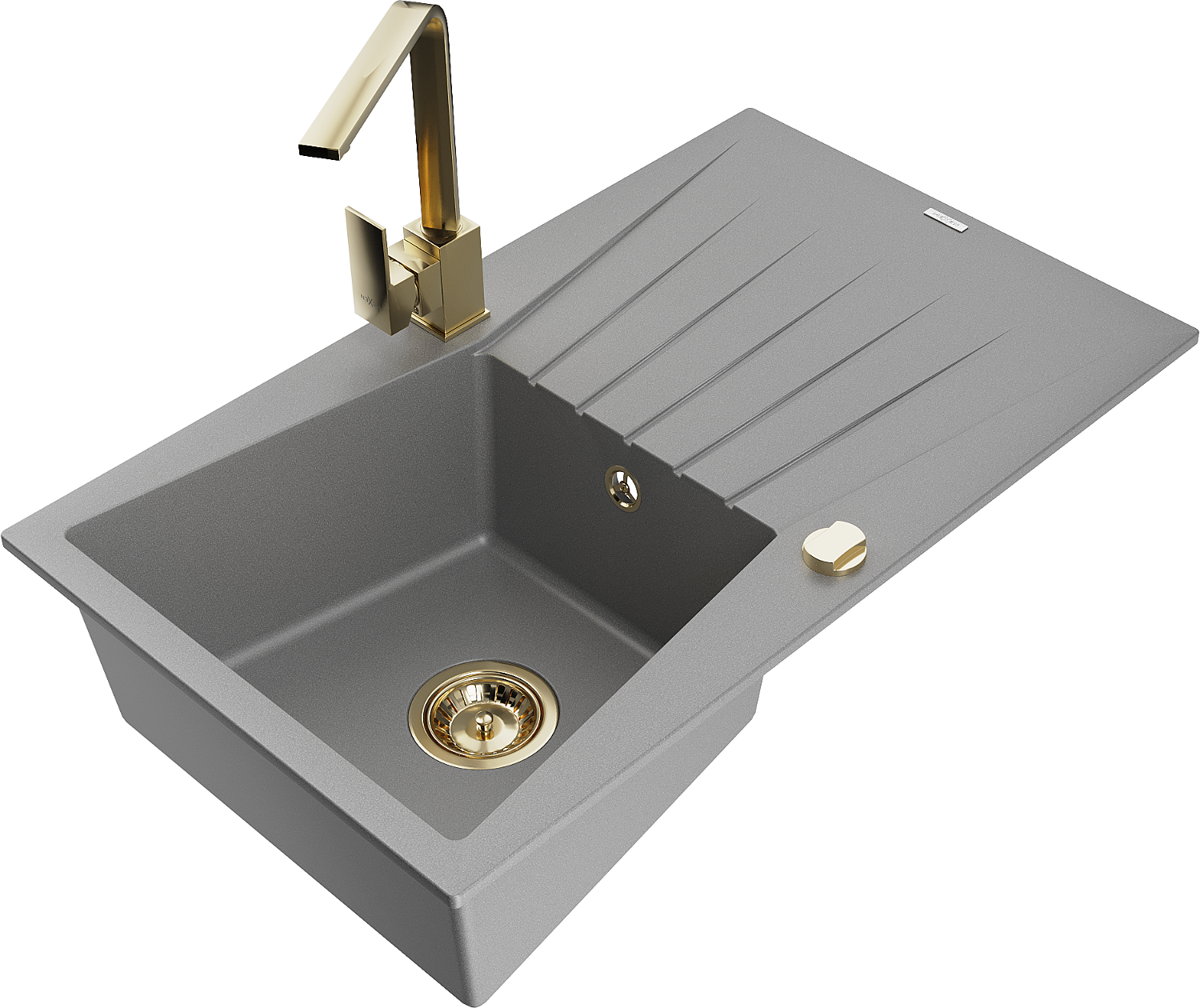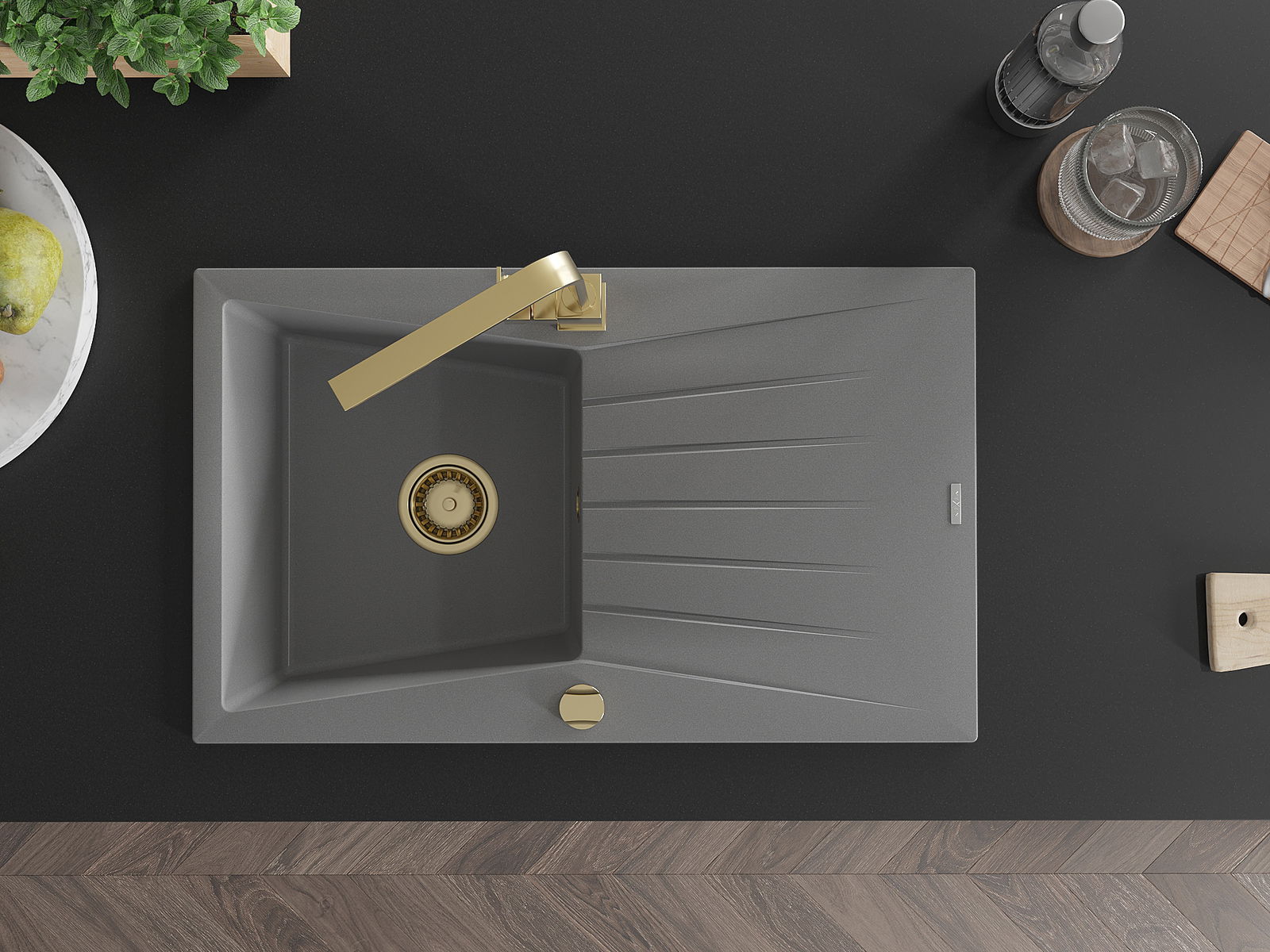 Mexen Cesar granitinis plautuvės su viena kamera ir nuvarvėjimo zona, su virtuviniu maišytuvu Rita, pilkas - 6514-71-670300-50