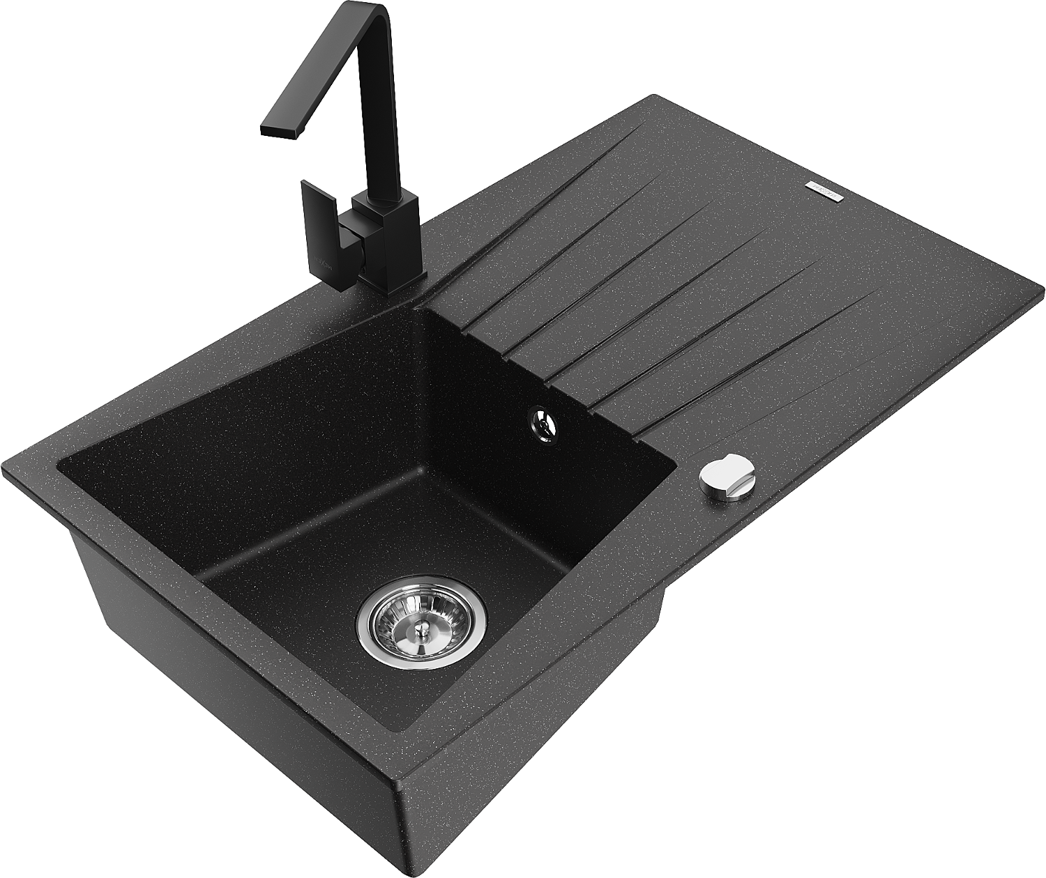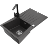 Mexen Cesar 1-ųjų kamerų granito plautuvė su nuvarvėtoju ir virtuvės maišytuvu Rita, juoda/sidabro metaliko