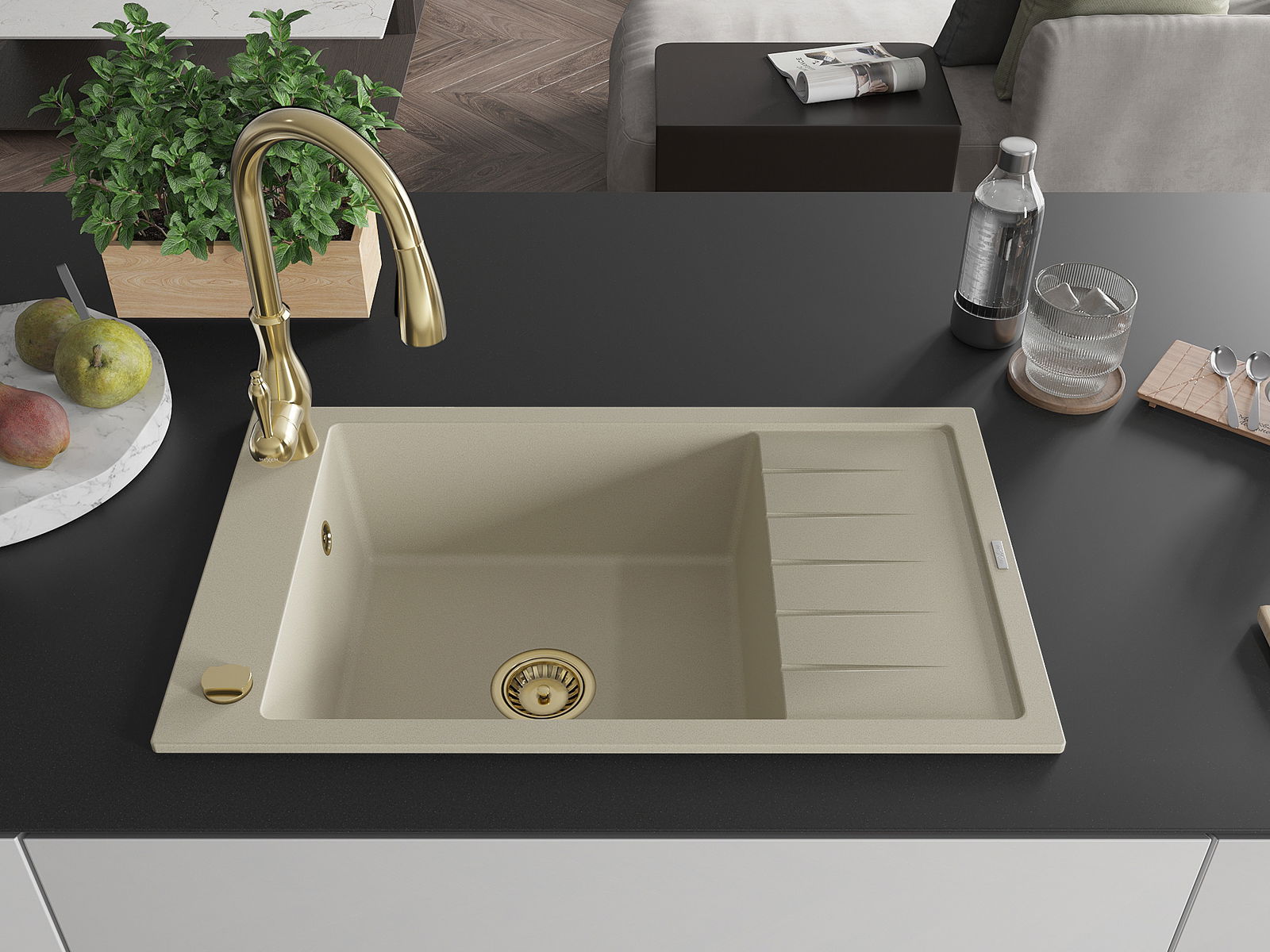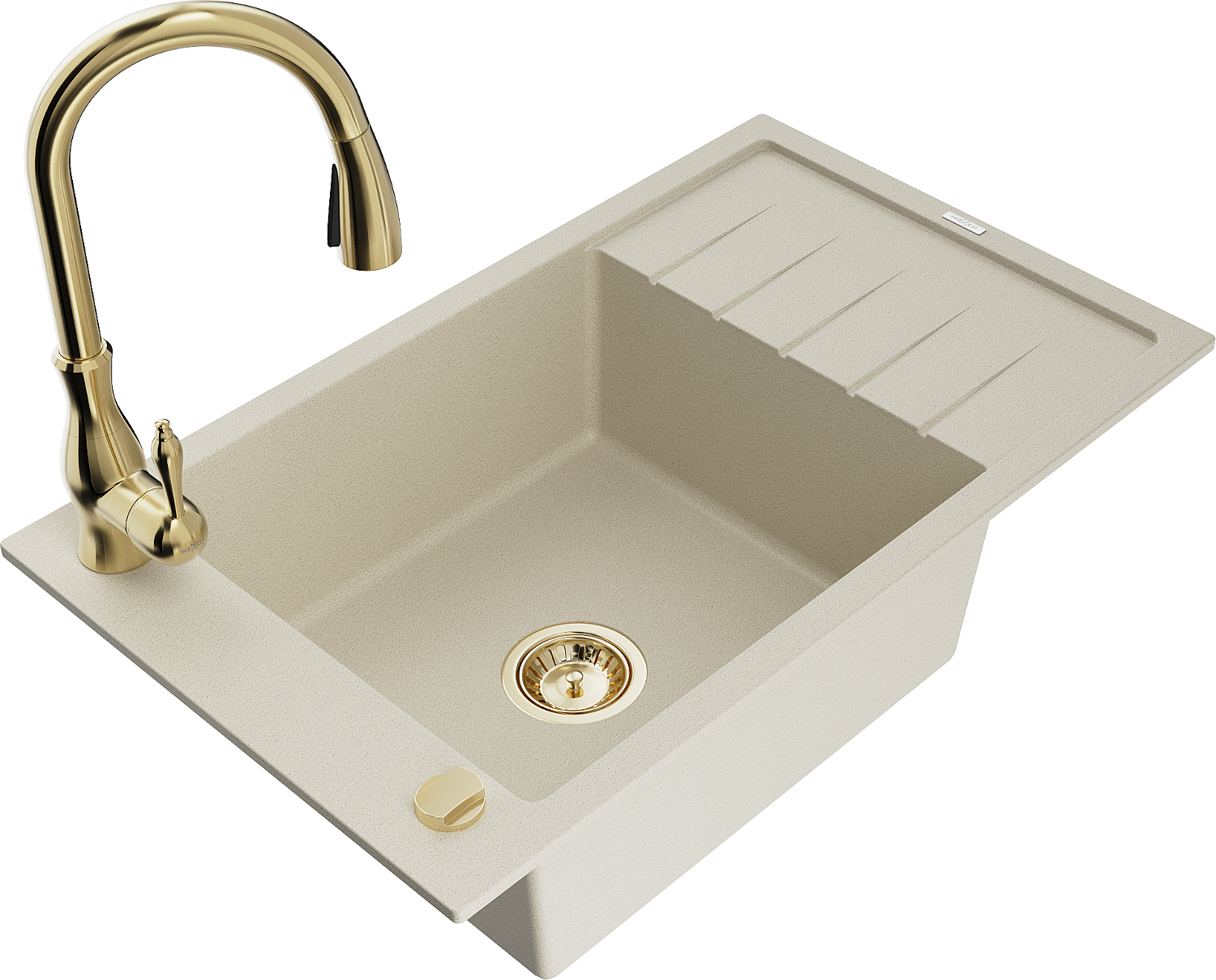 Mexen Elias granito plautuvė 1 skyrius su varvekliu ir virtuvinis maišytuvas Savita, smėlio spalvos - 6511-69-672601-50