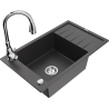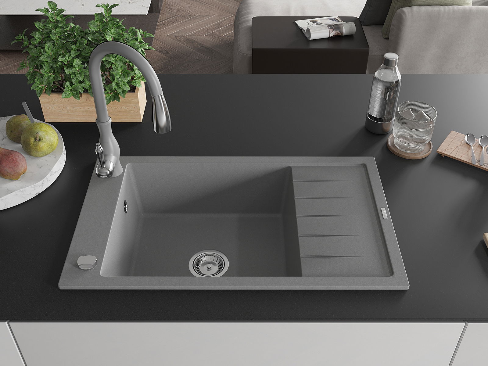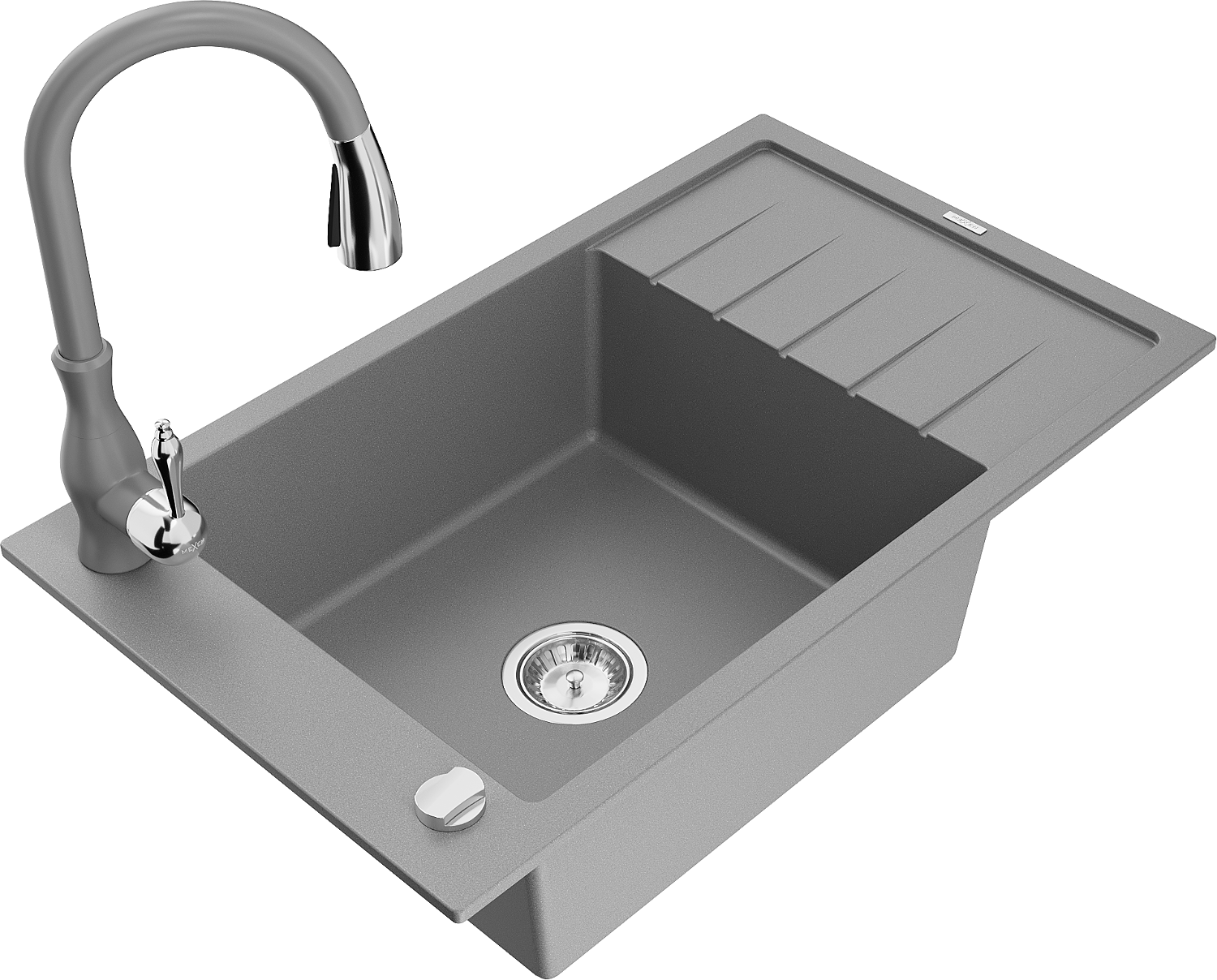 Mexen Elias 1 kamerėlių granito plautuvė su nutekamuoliu ir virtuviniu maišytuvu Savita, pilkas - 6511-71-672601-71