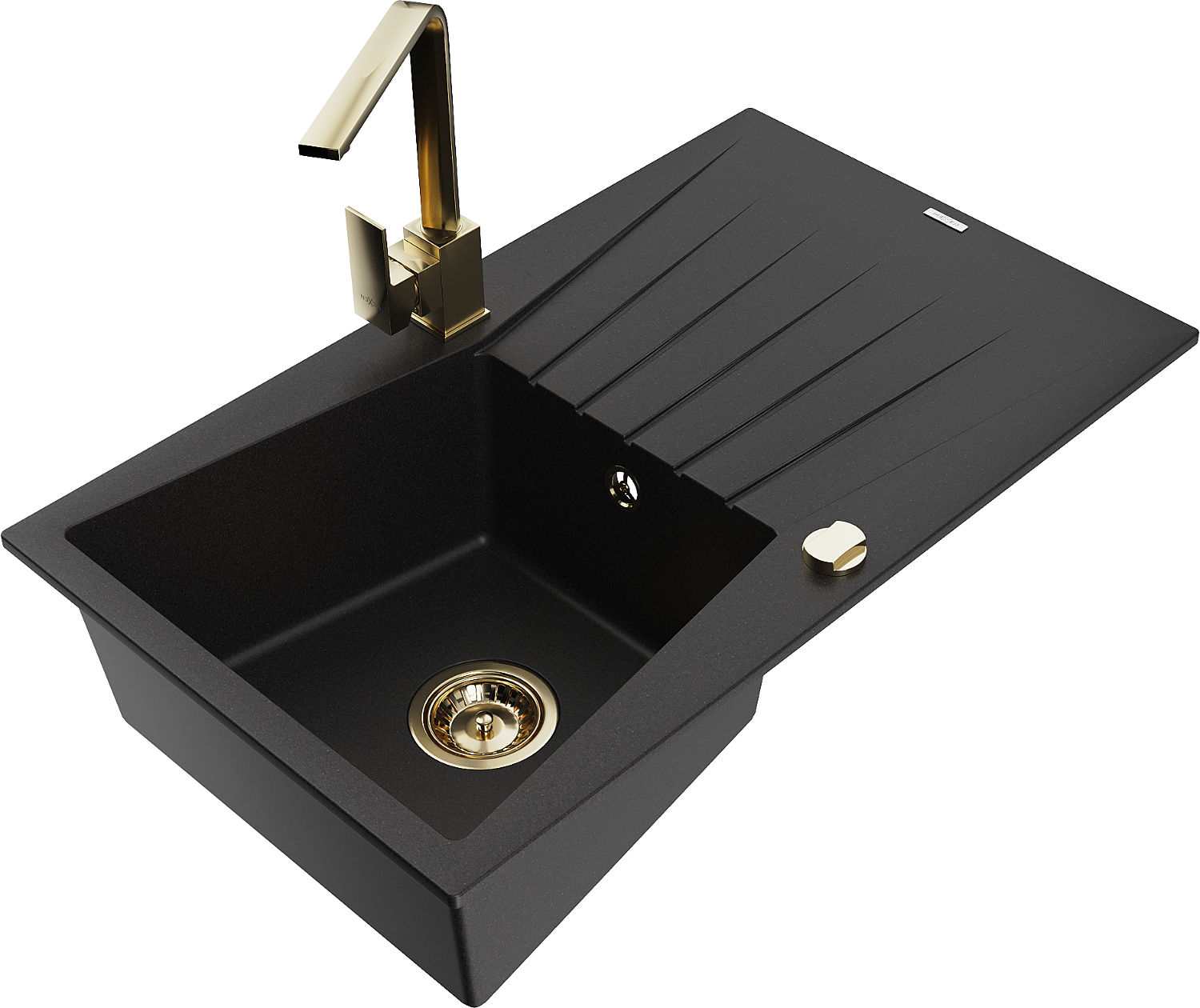 Mexen Cesar vienos kameros granito plautuvė su nutekėju ir virtuviniu maišytuvu Rita, juoda - 6514-77-670300-50