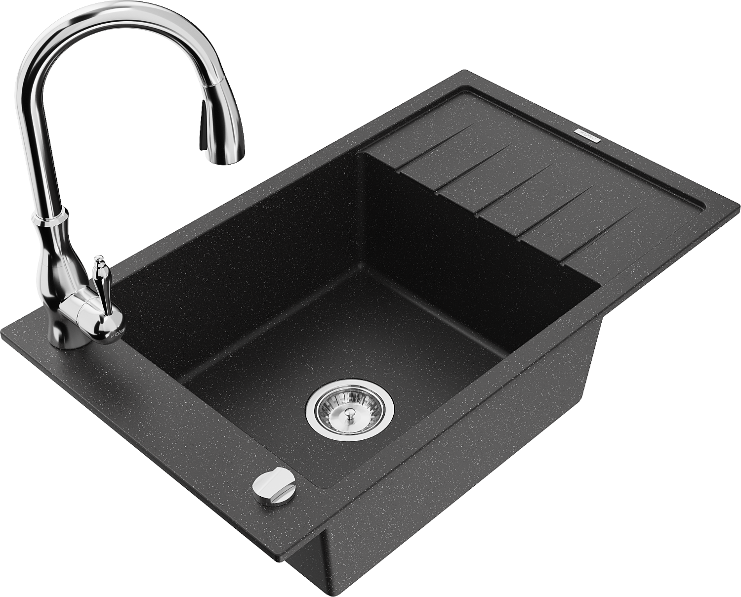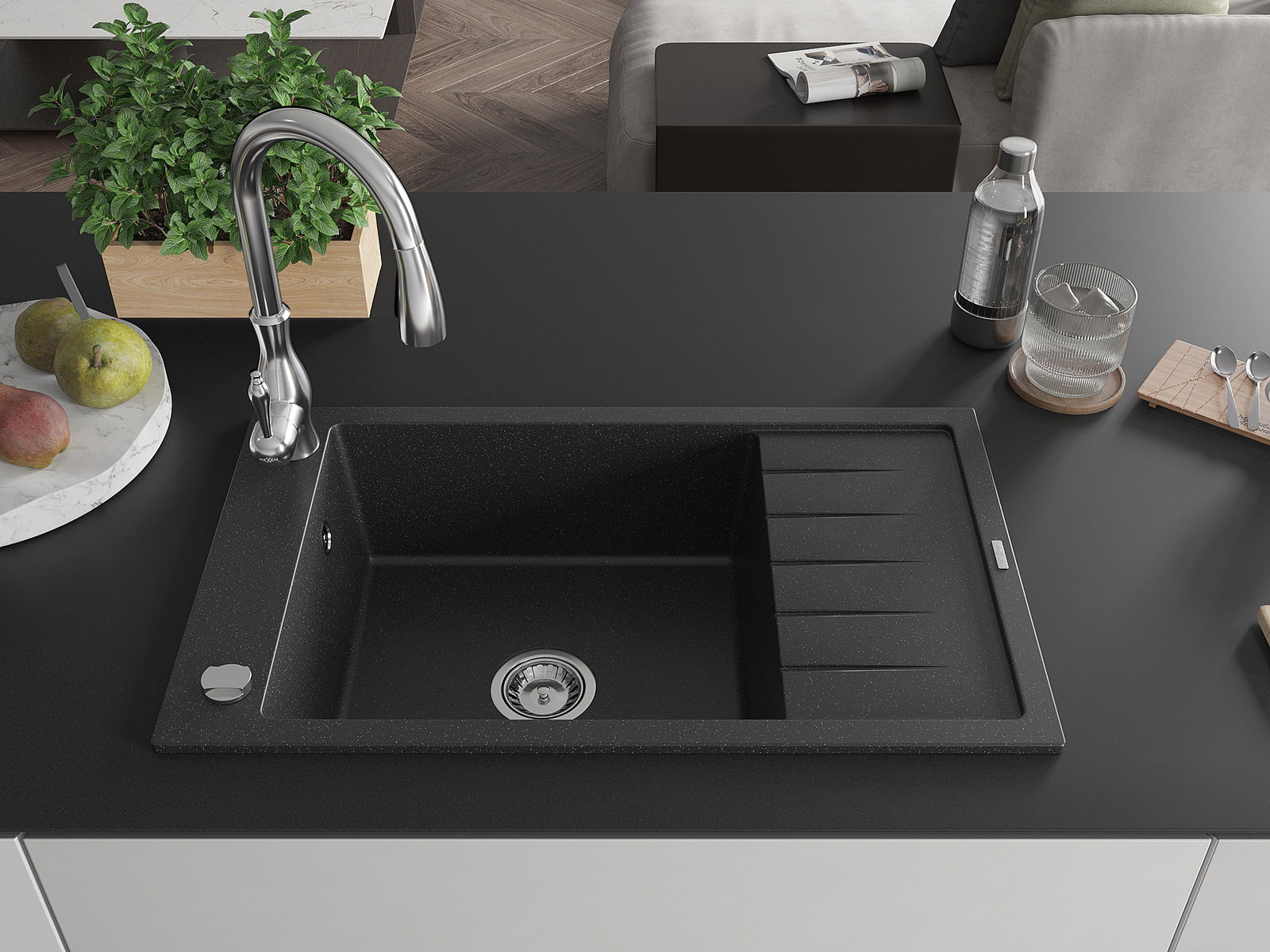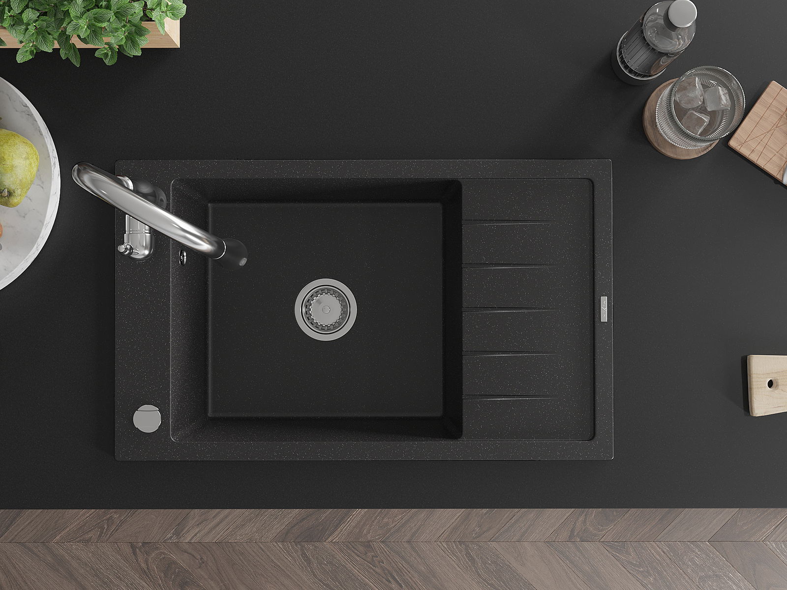 Mexen Elias granitinė vienos kameros plautuvė su nusausinimo vieta ir virtuviniu maišytuvu Savita, juoda/sidabrinė metaliko
