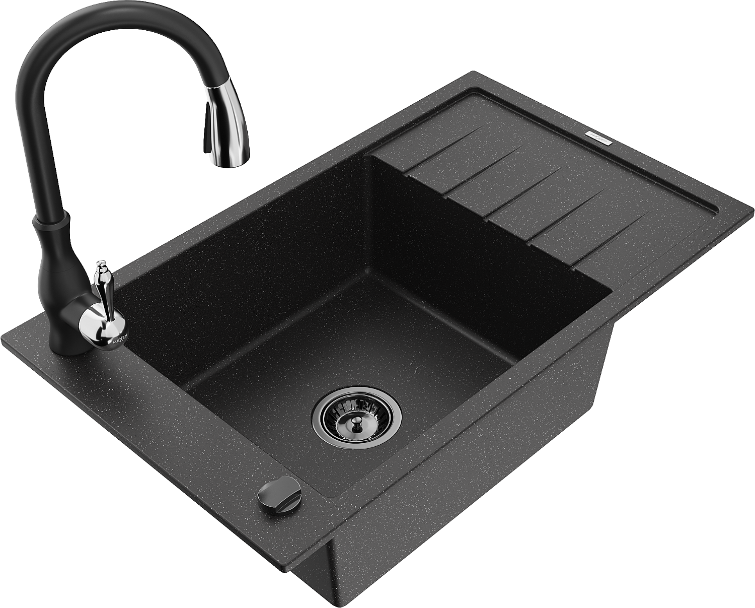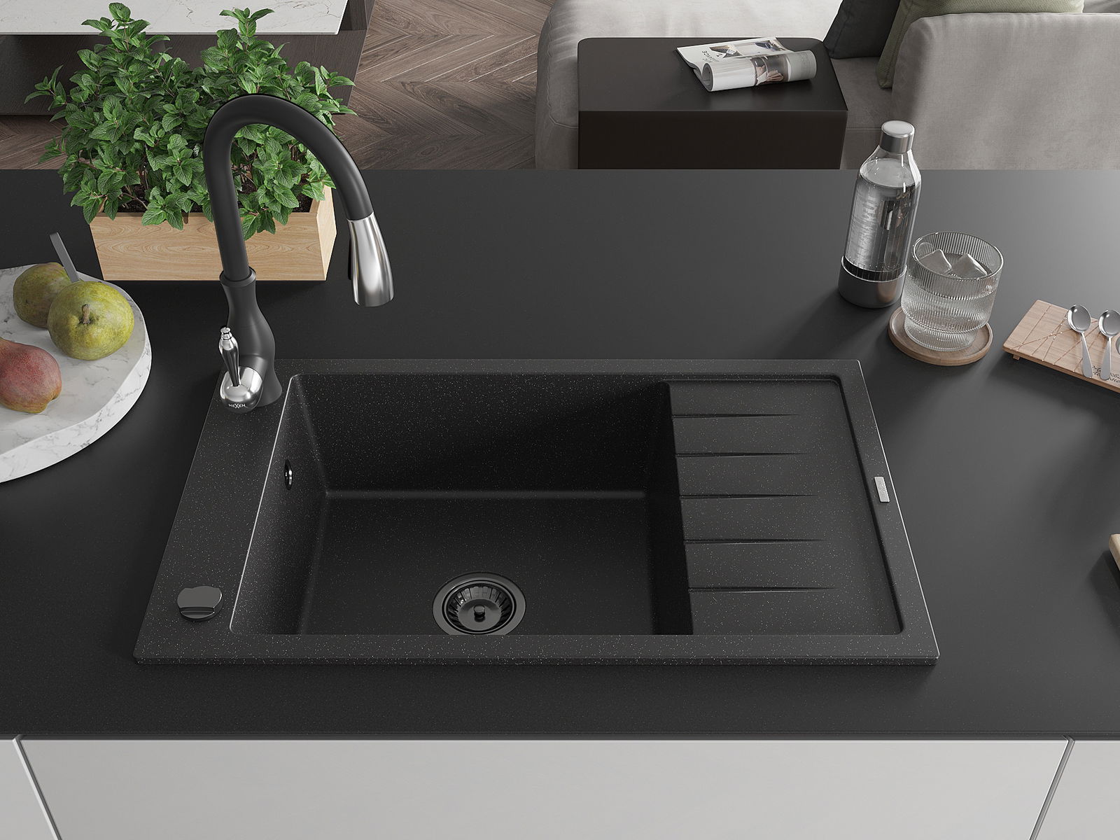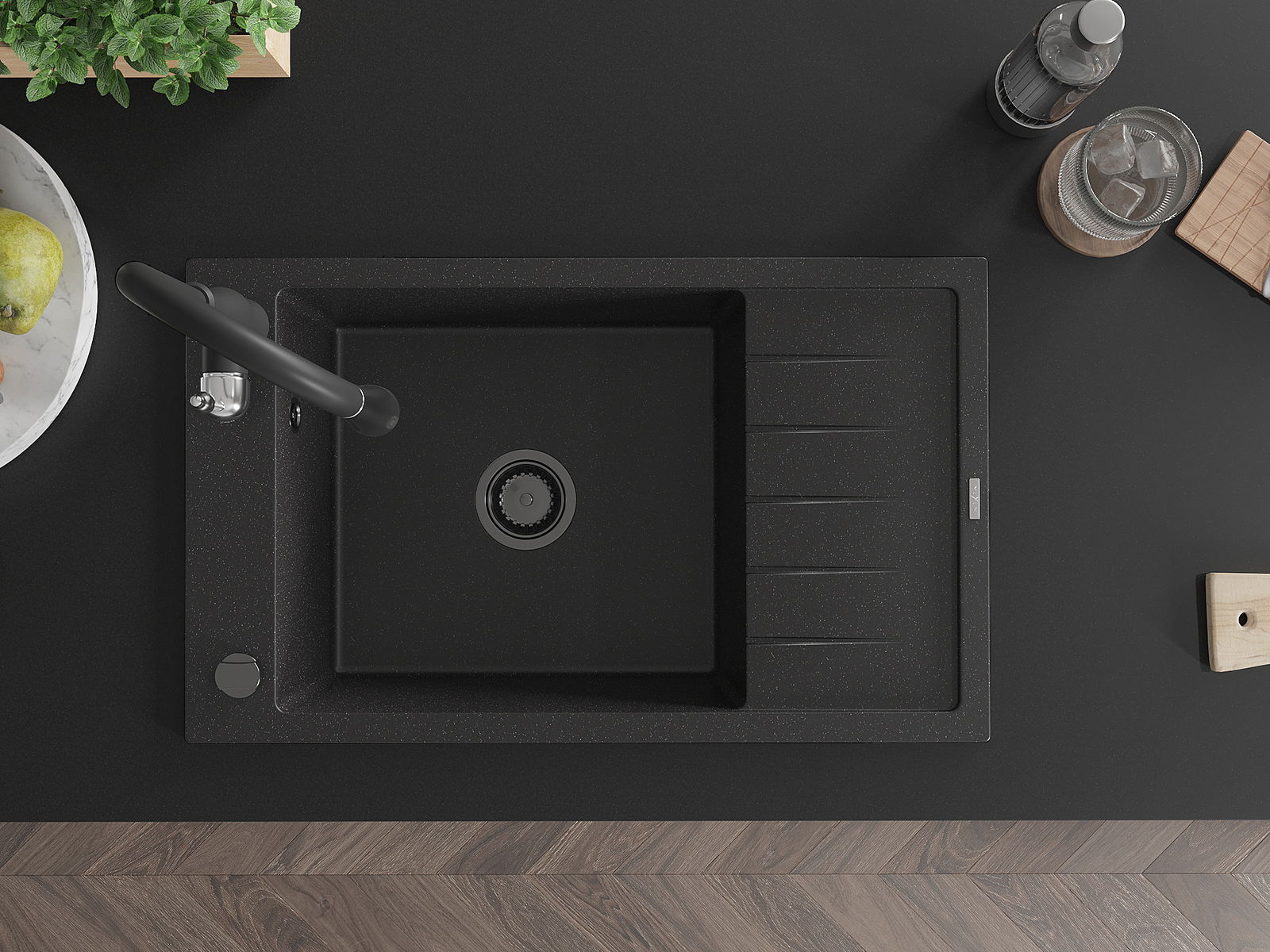 Mexen Elias granitinė virtuvės kriauklė su viena kamera, varvekliu ir virtuvės maišytuvu Savita, juodas/sidabrinis
