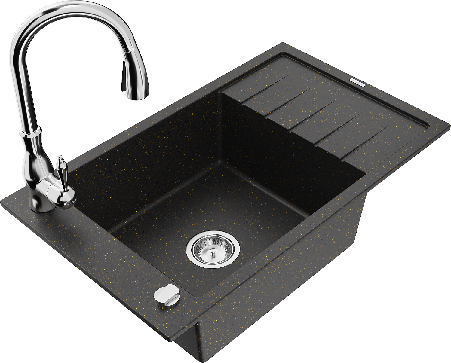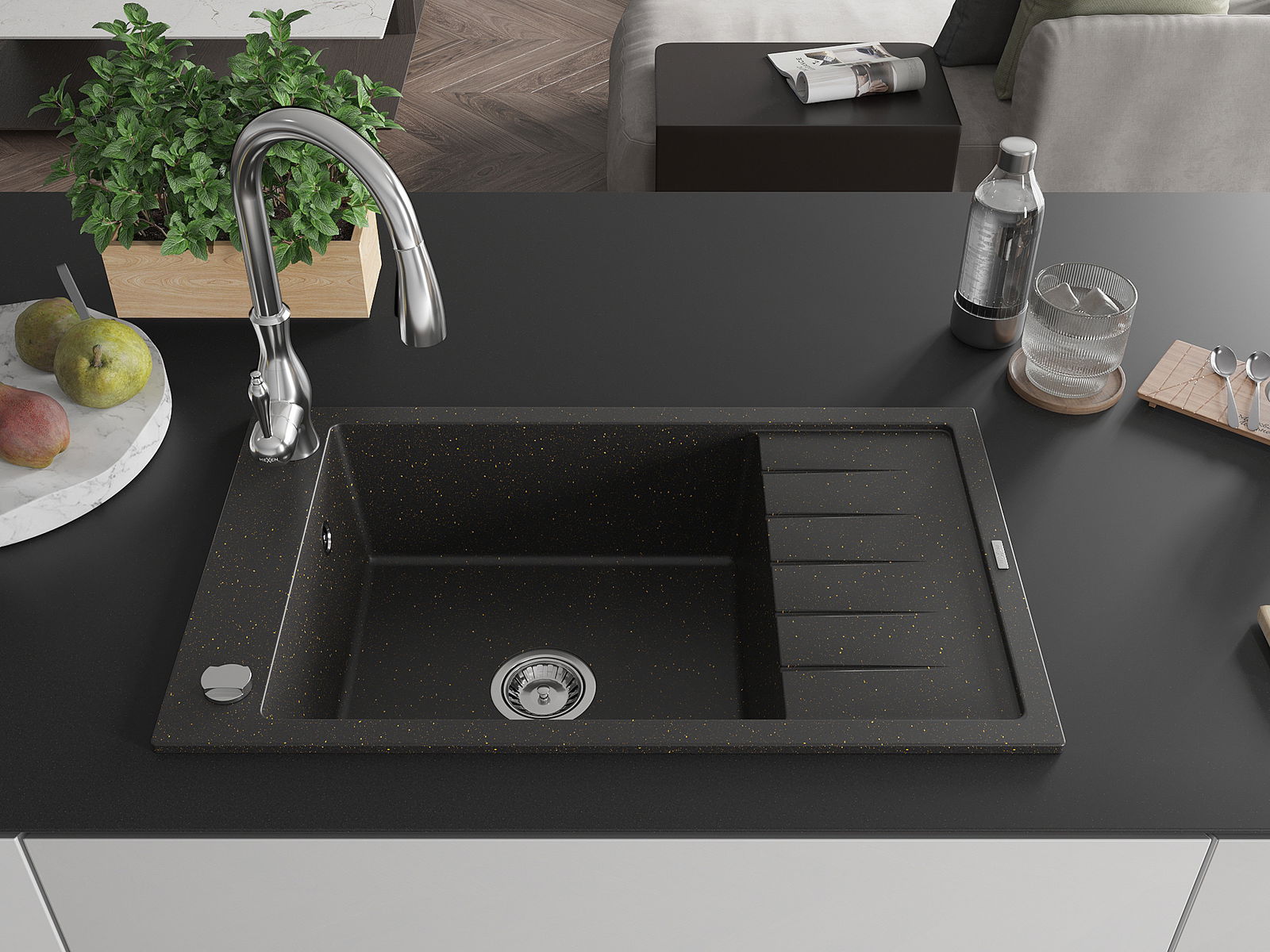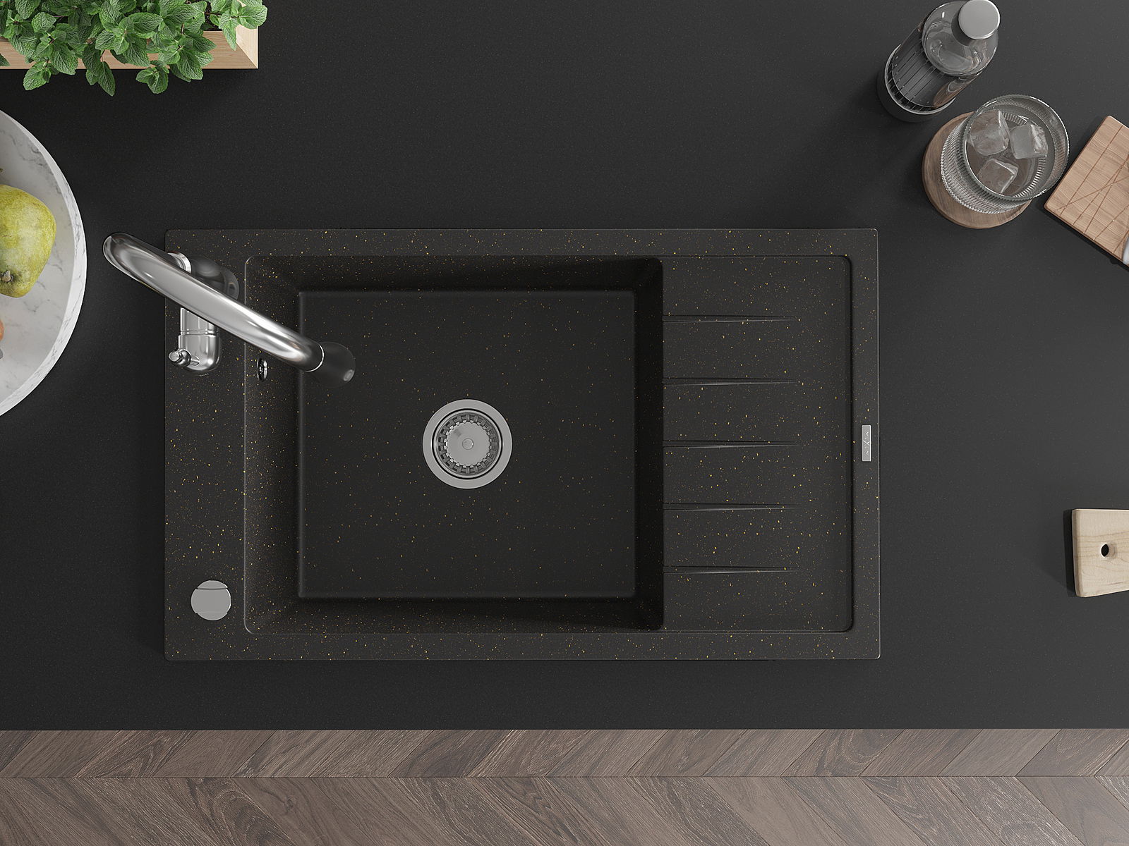 Mexen Elias granitinė vienos kameros kriauklė su nusausintuvu ir virtuvės maišytuvu Savita, juodas/auksinis metalikas