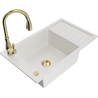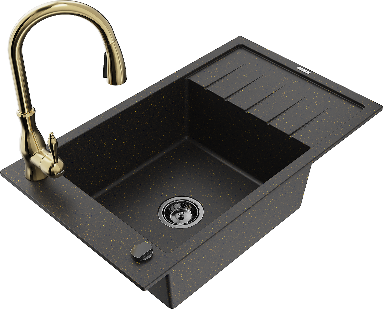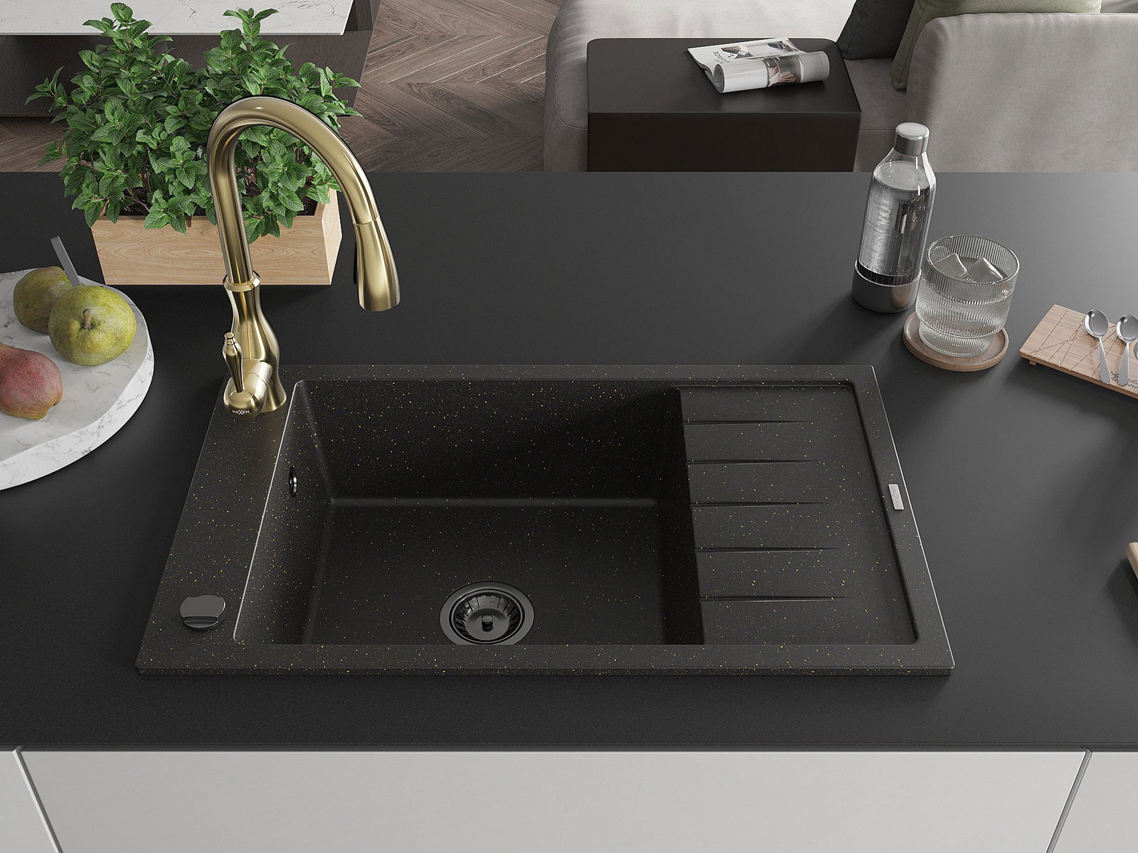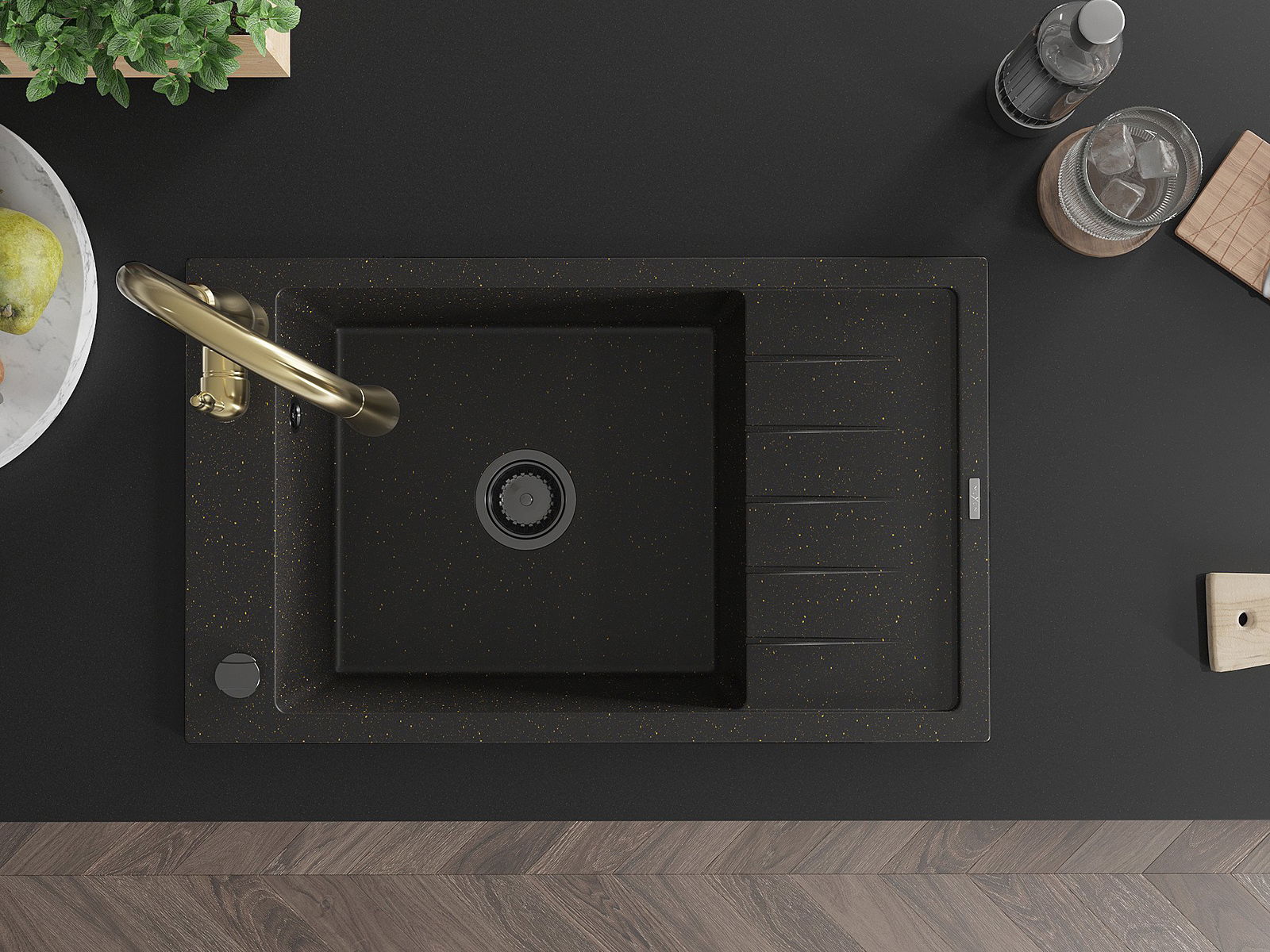 Mexen Elias granitinė vieno dubens plautuvė su nusausinimo lentyna ir virtuviniu maišytuvu Savita, juoda/auksinė metalik