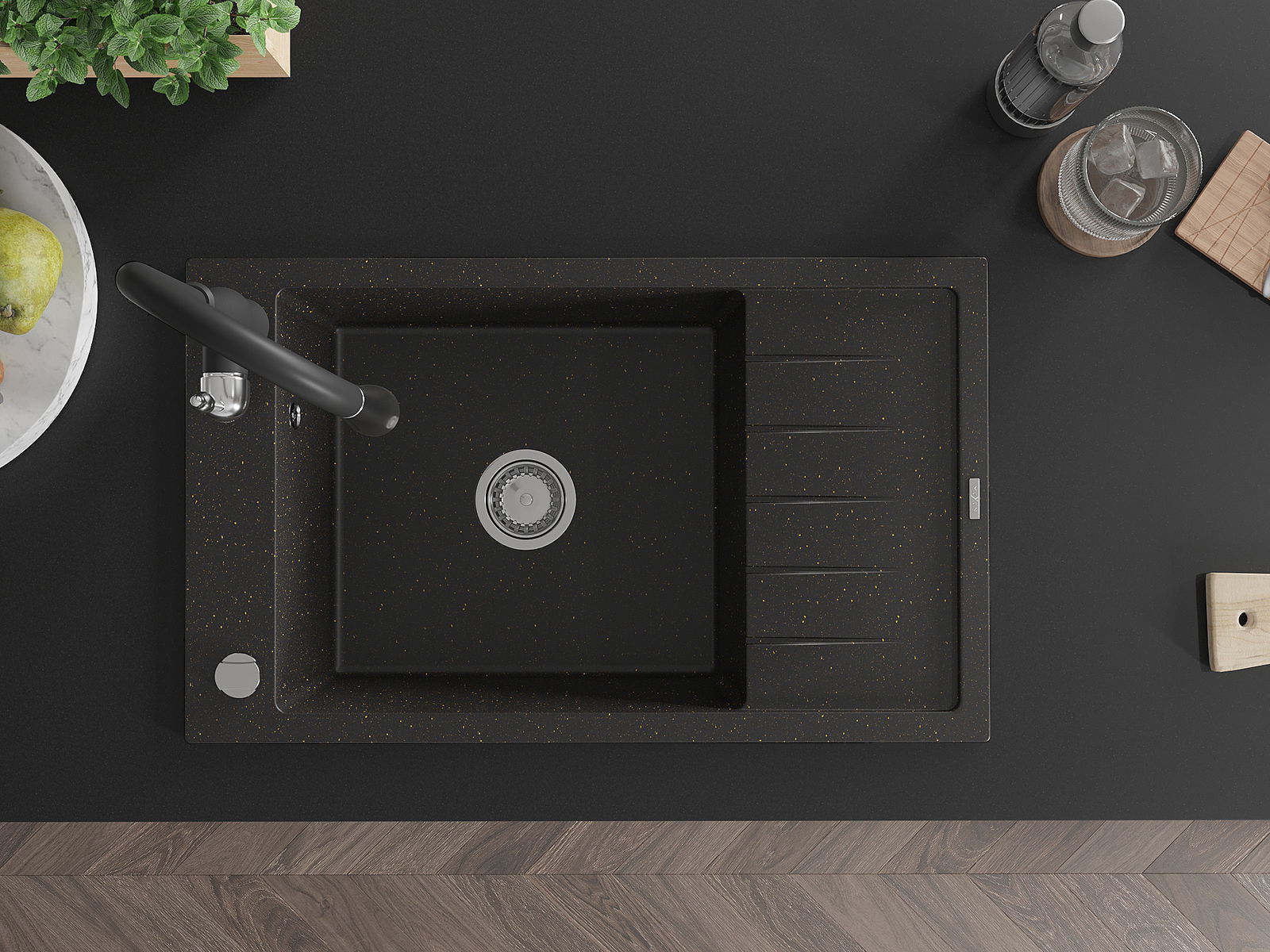 Mexen Elias vienos kameros granitinis virtuvės kriauklė su nusausintuvu ir virtuvės maišytuvu Savita, juoda/auksinė metalo