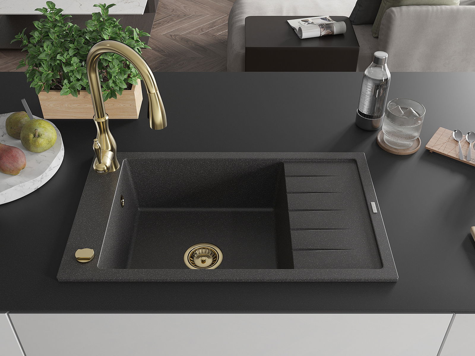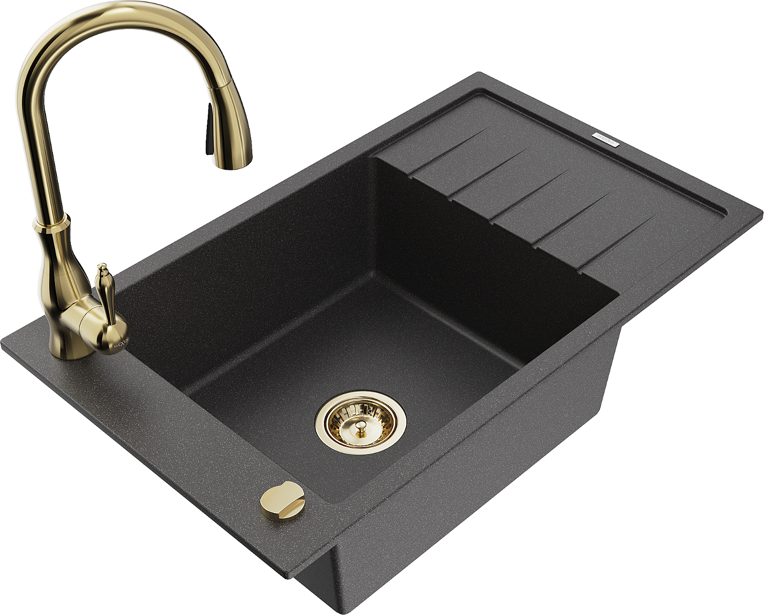 Mexen Elias granitinė vieno dubens kriauklė su nuvarvėtu ir Savita virtuviniu maišytuvu, juodas dėmėtas - 6511-76-672601-50