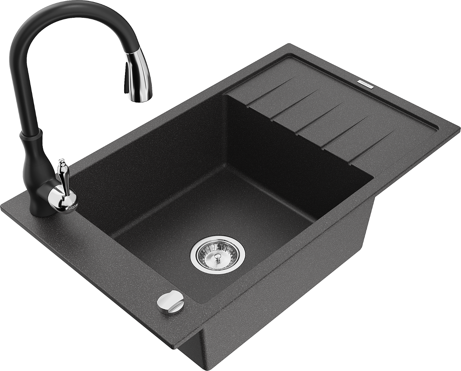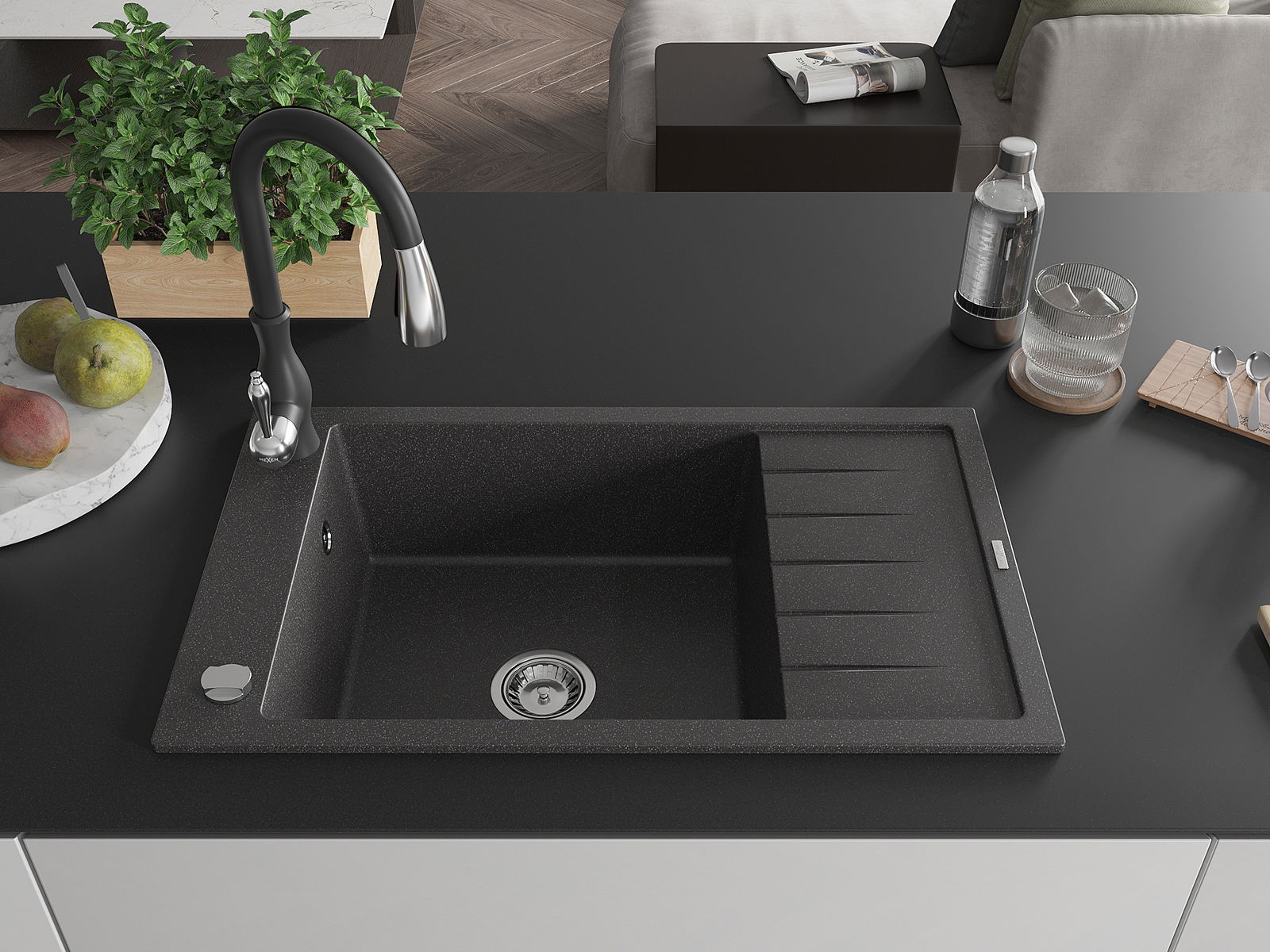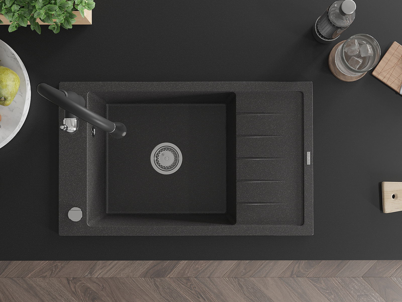 Mexen Elias granitinė plautuvė su 1 skyriumi, džiovykla ir virtuviniu maišytuvu Savita, juoda taškuota - 6511-76-672601-70