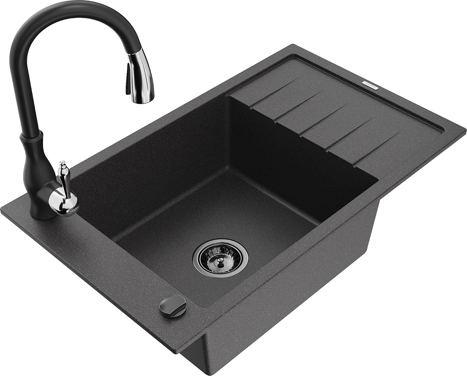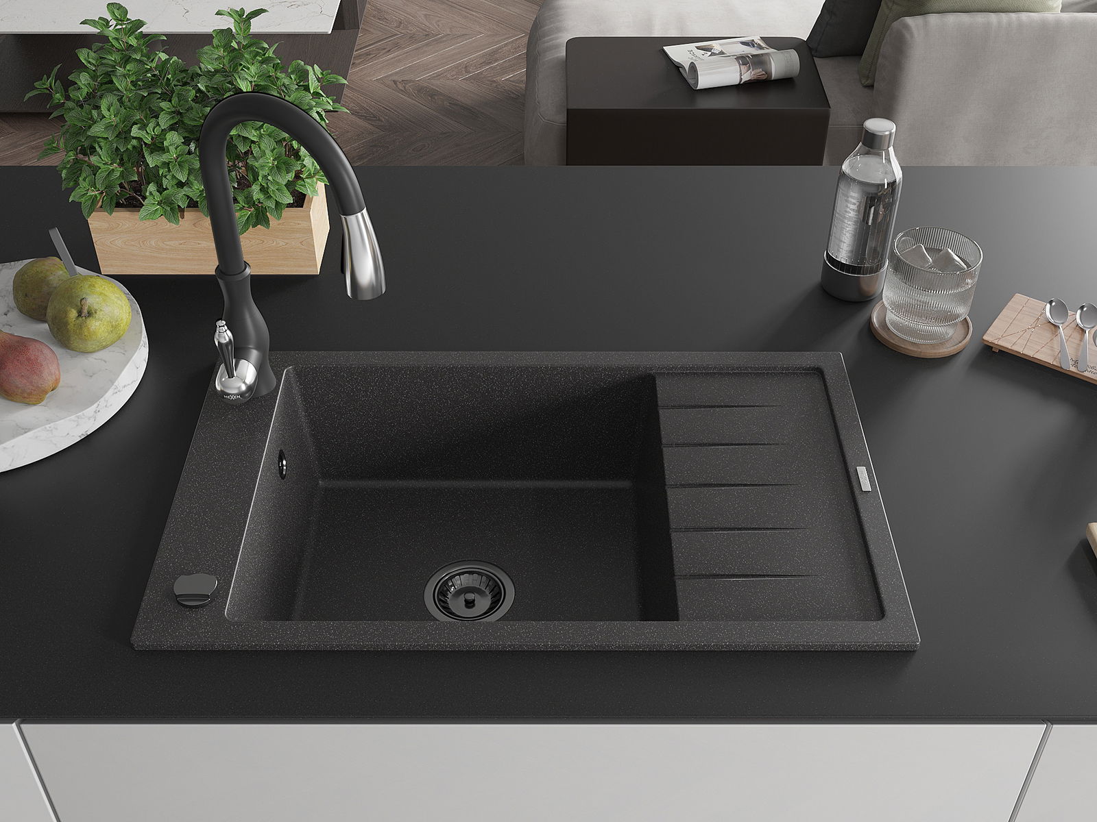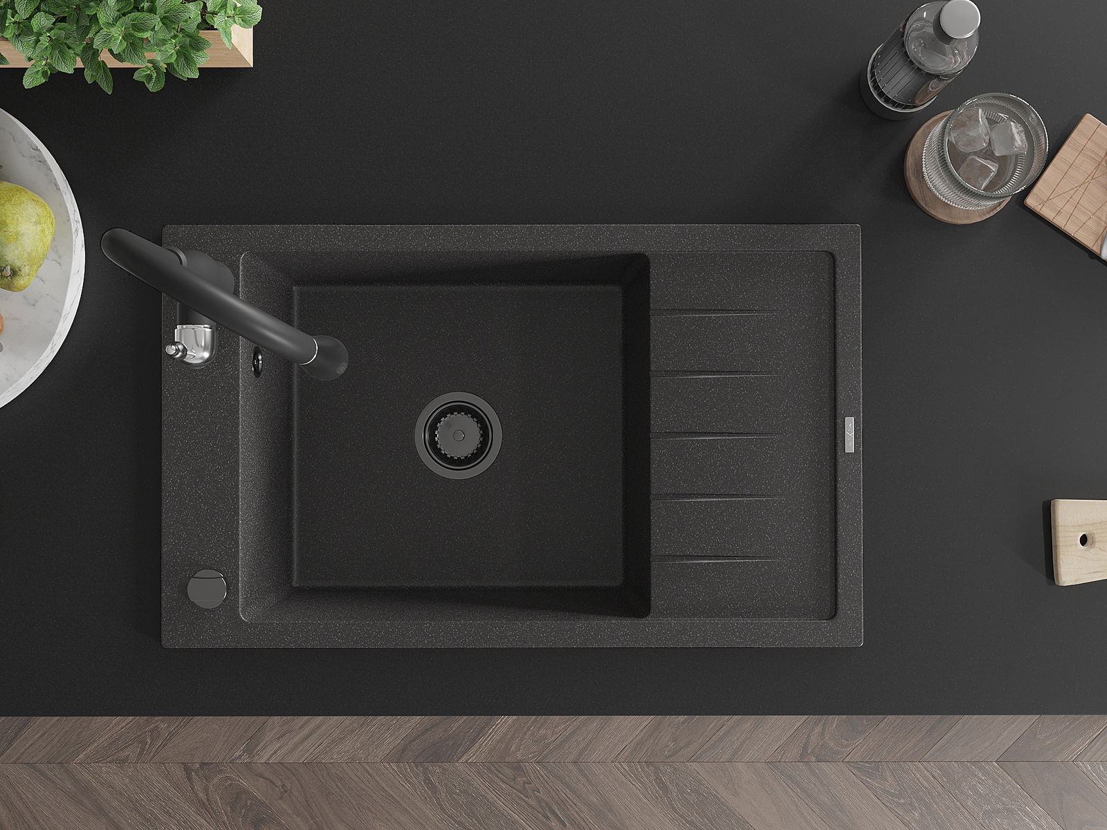 Mexen Elias granitinė vienos plautuvės plautuvė su nuvarvėjimo plokštele ir virtuvės maišytuvu Savita, juodas taškuotas