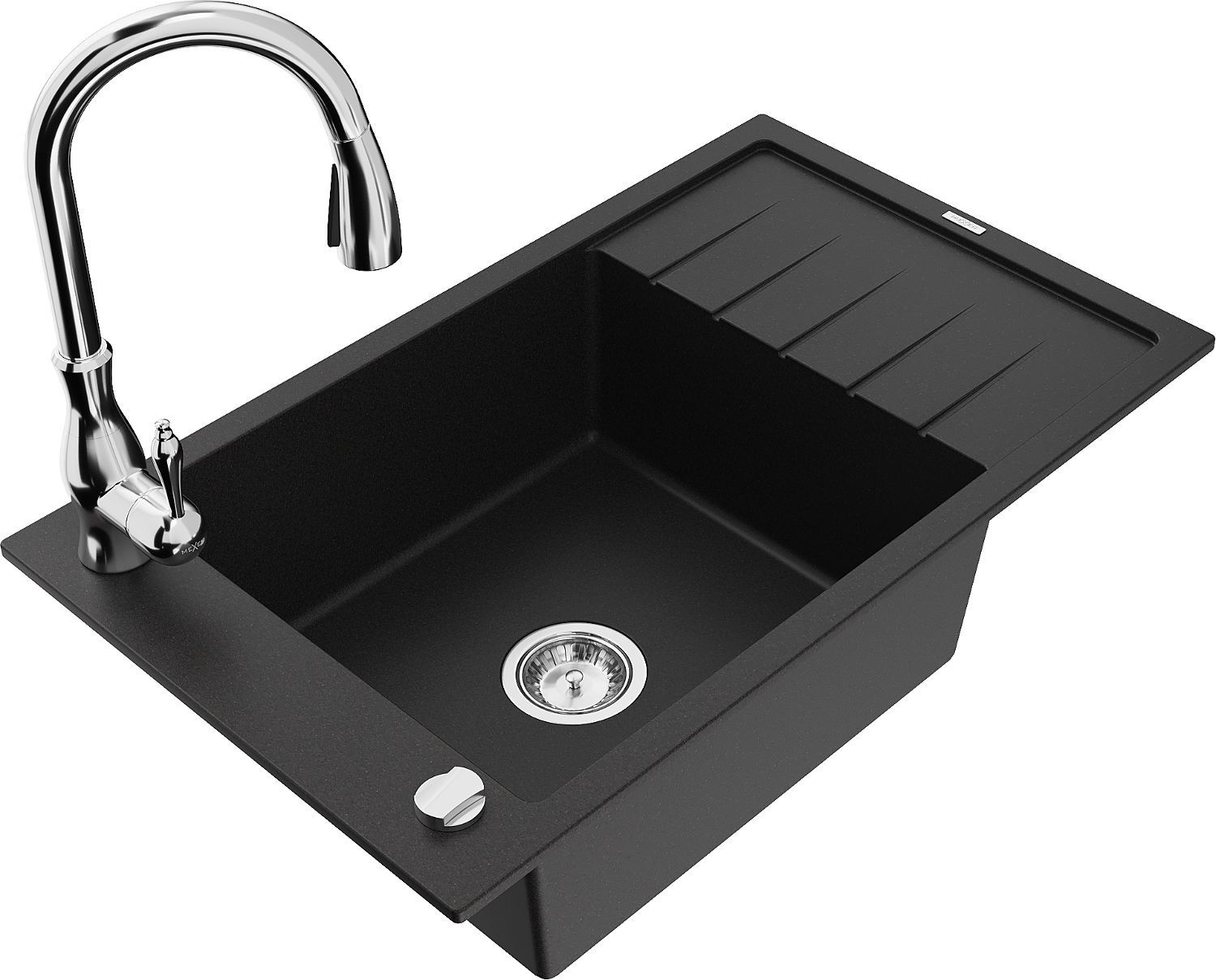 Mexen Elias granito kriauklė su nuvarvėjimo lentyna ir virtuviniu maišytuvu Savita, juoda - 6511-77-672601-00