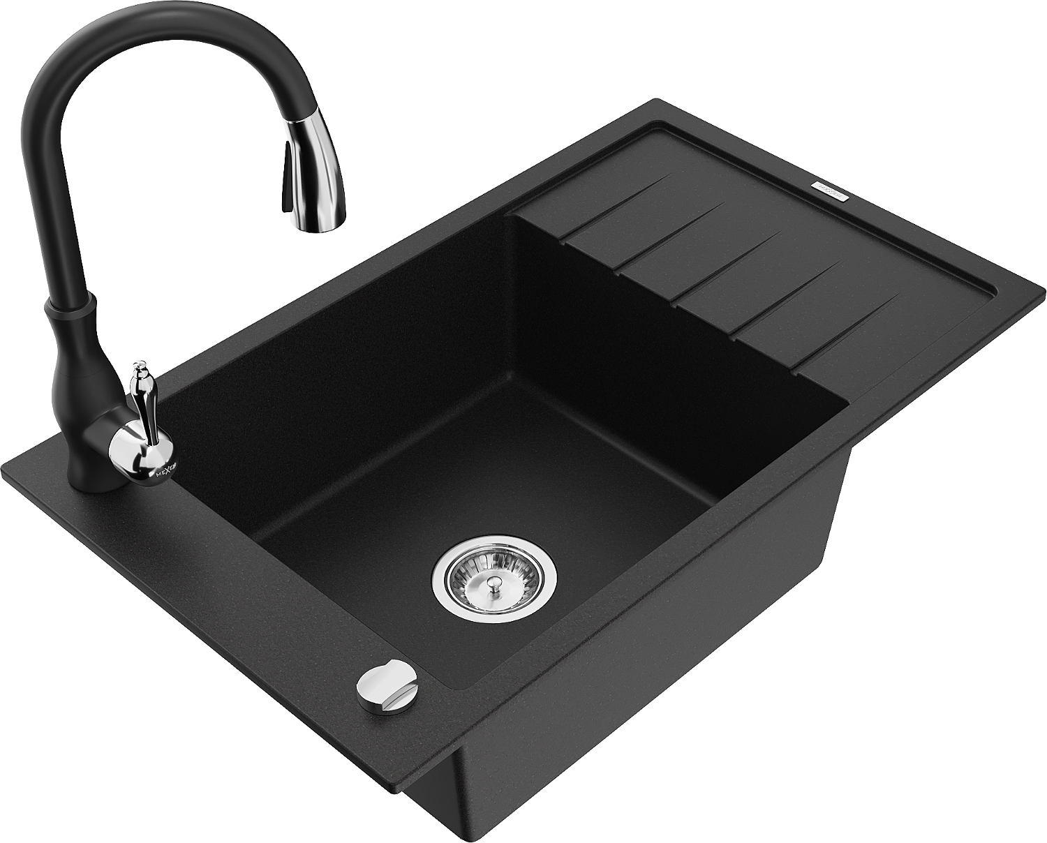 Mexen Elias granito plautuvė 1 kamerų su nusausinimo lentynėle ir virtuviniu maišytuvu Savita, juoda - 6511-77-672601-70