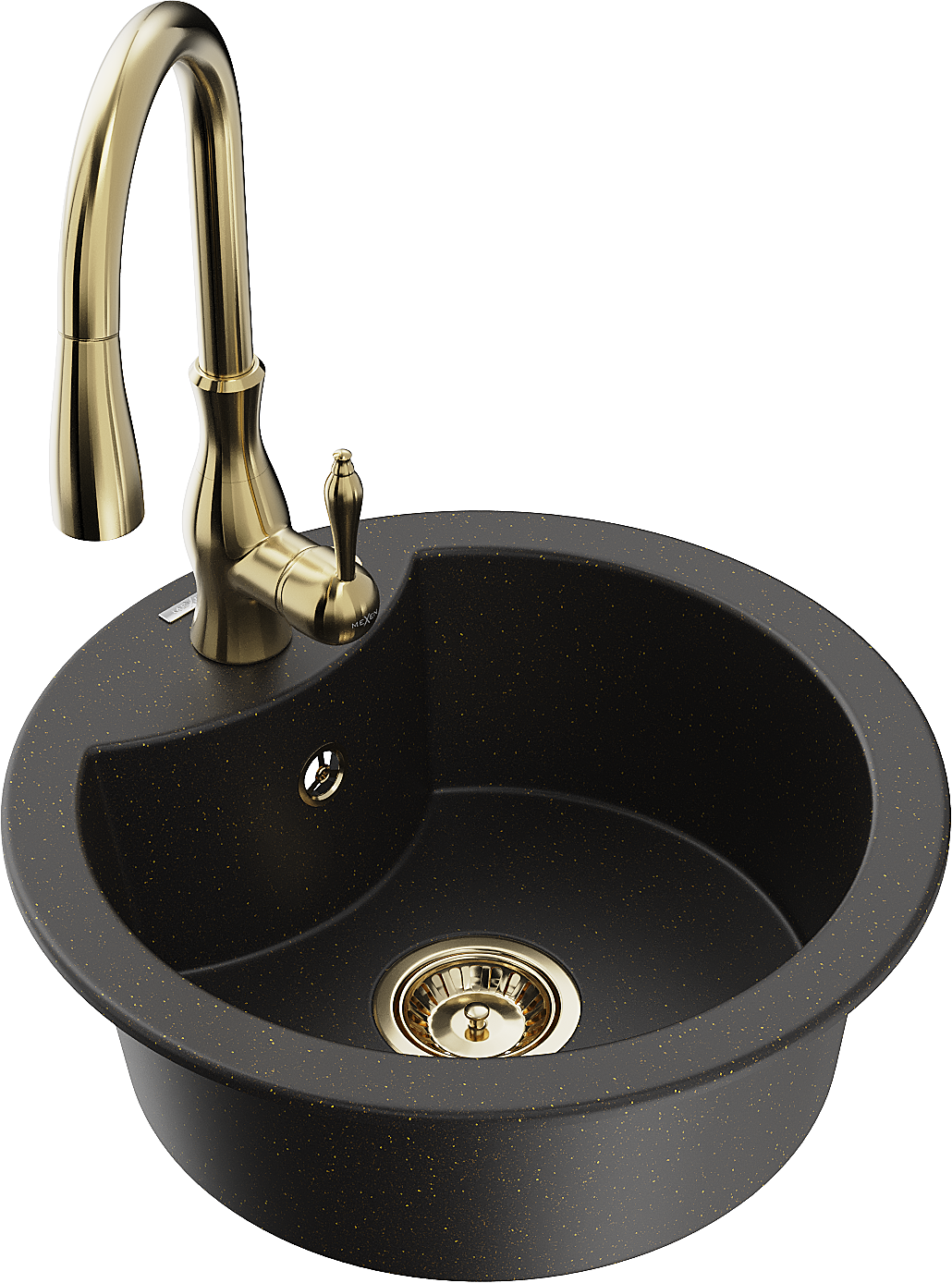 Mexen Diego granitinis vienos dubenės kriauklė su virtuviniu maišytuvu Savita, juoda/auksinis metalikas - 6512-75-672601-50