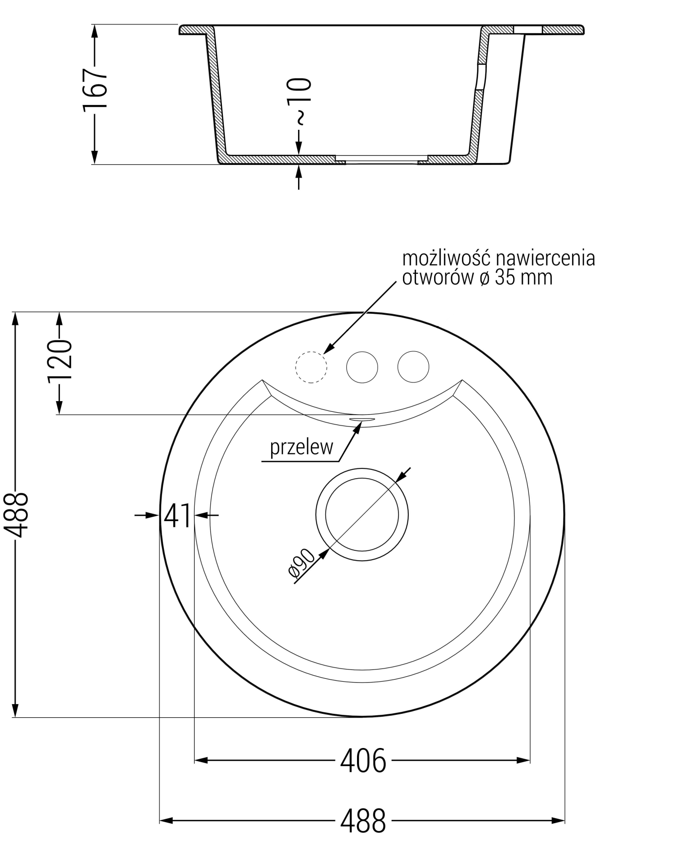 Kriauklė turi išfrezuotą angą, kurios skersmuo 35 mm, kad būtų galima savarankiškai išmušti. Ją galima panaudoti, pvz., montuojant skysto muilo dozatorių, kuris pašalins plastikinių butelių buvimą virtuvėje ir suteiks jai elegantišką apdailą.