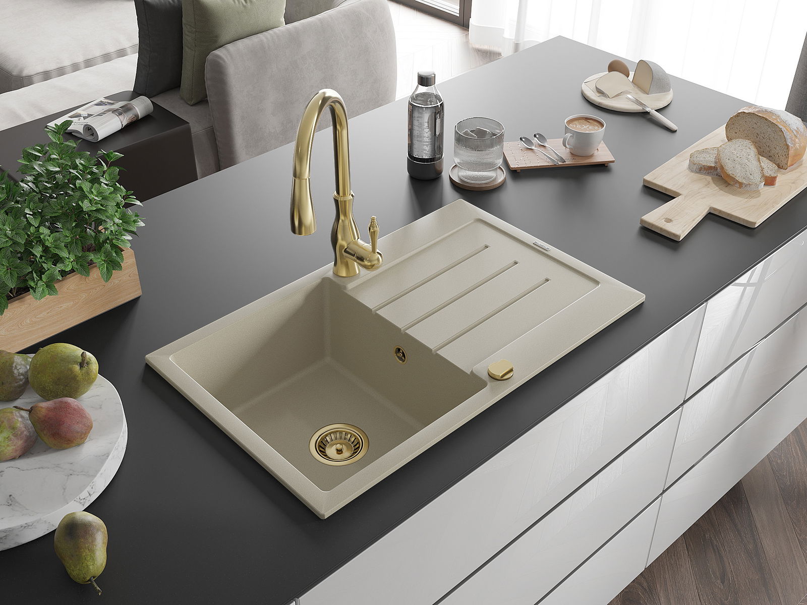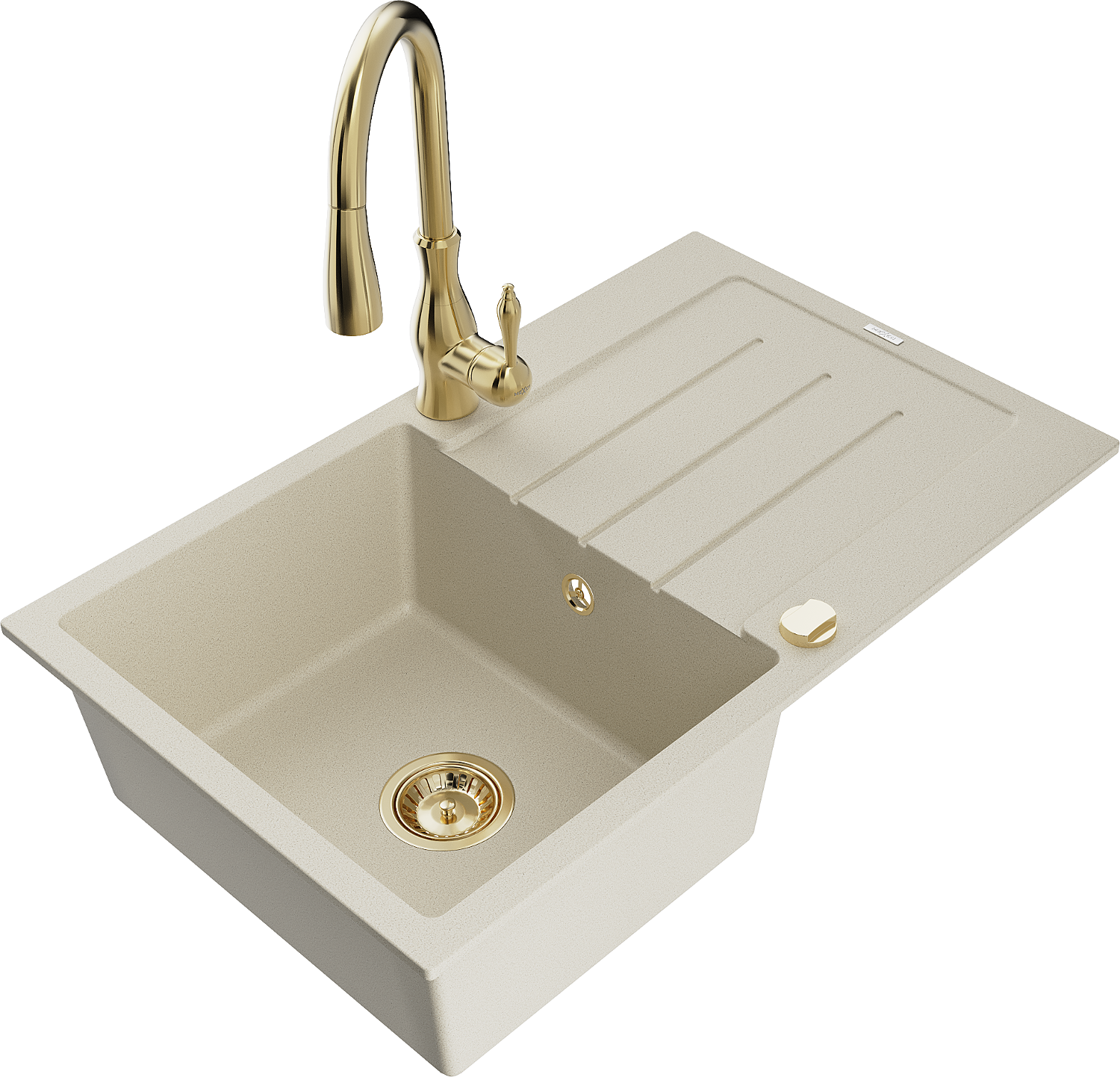 Mexen Bruno granito plautuvė su viena kamera ir nutekėjimu bei virtuvės maišytuvu Savita, smėlio spalvos - 6513-69-672601-50