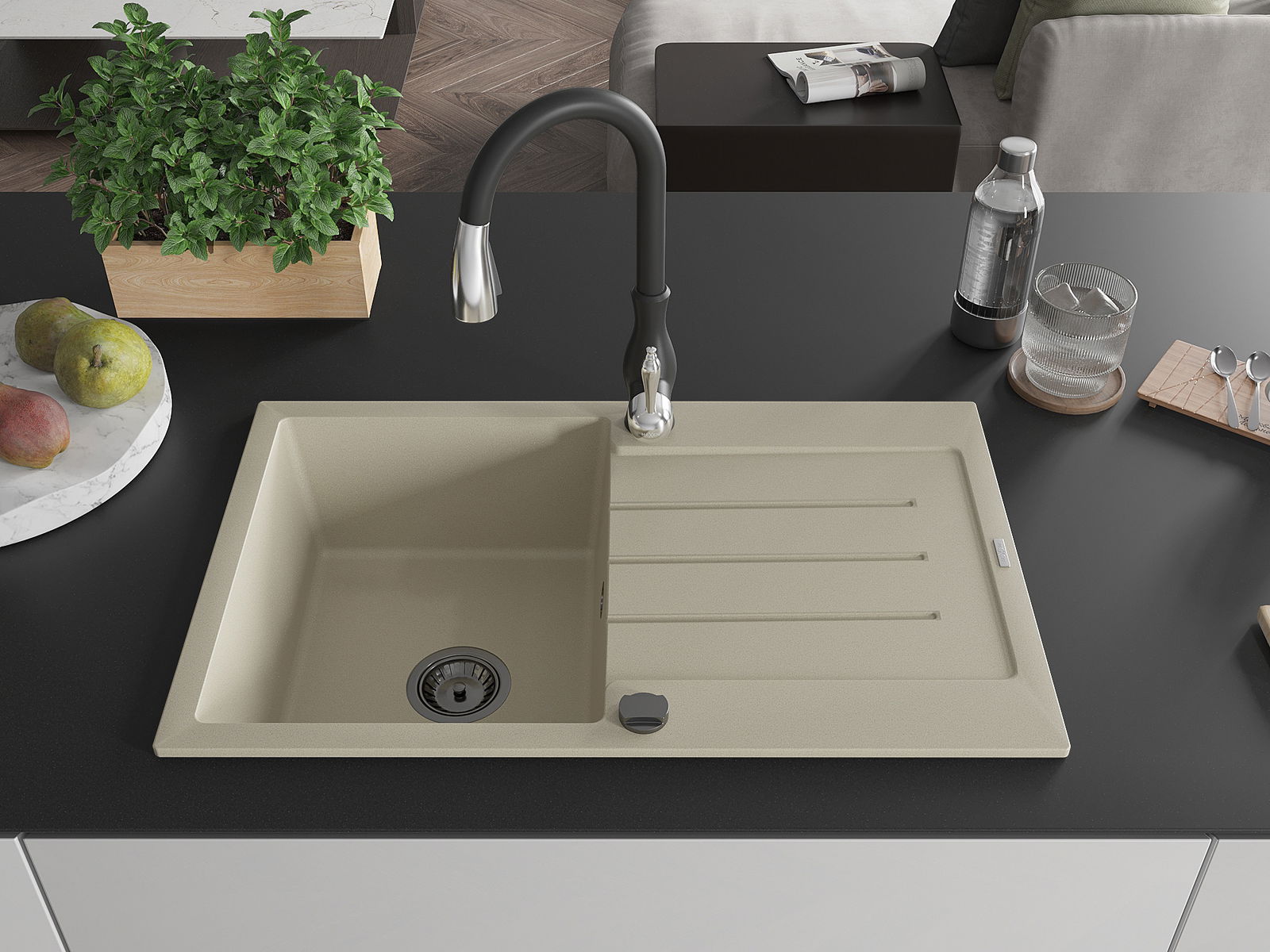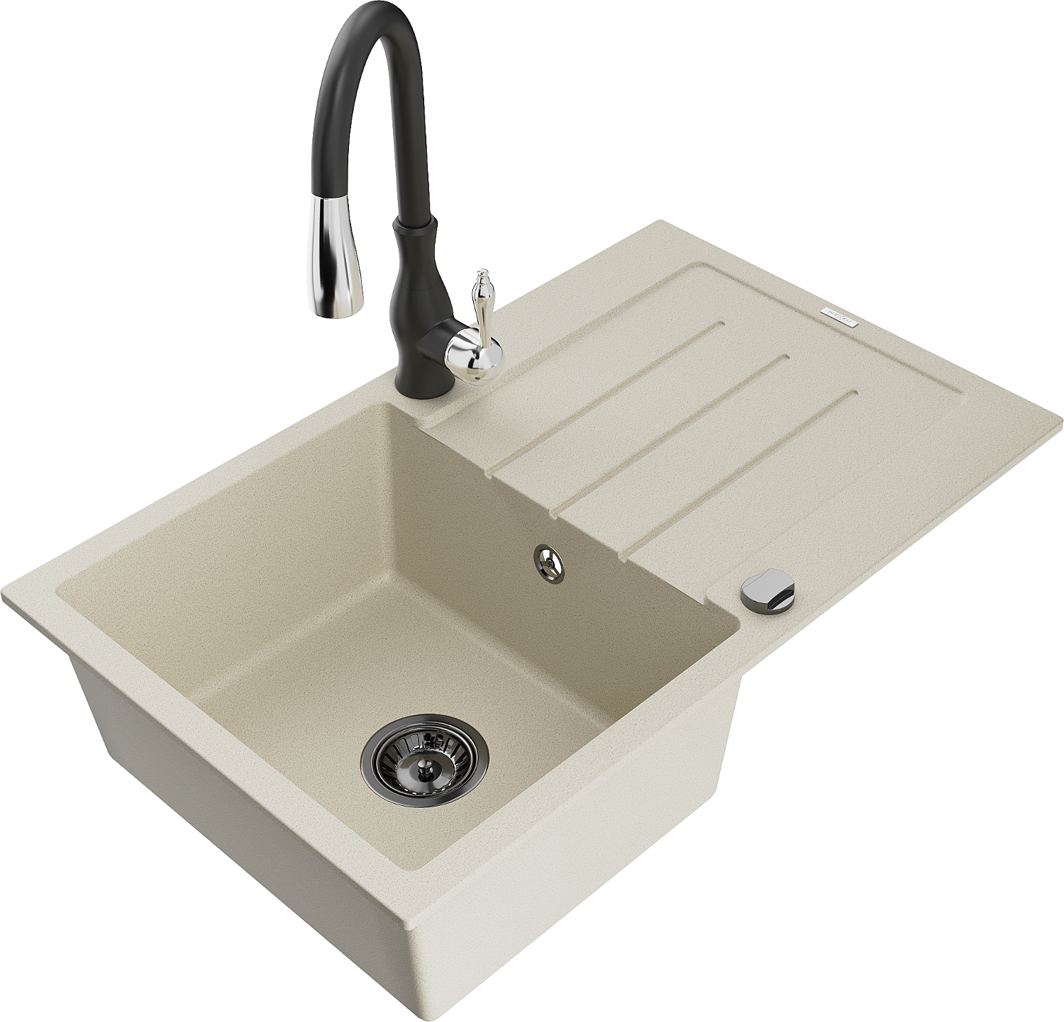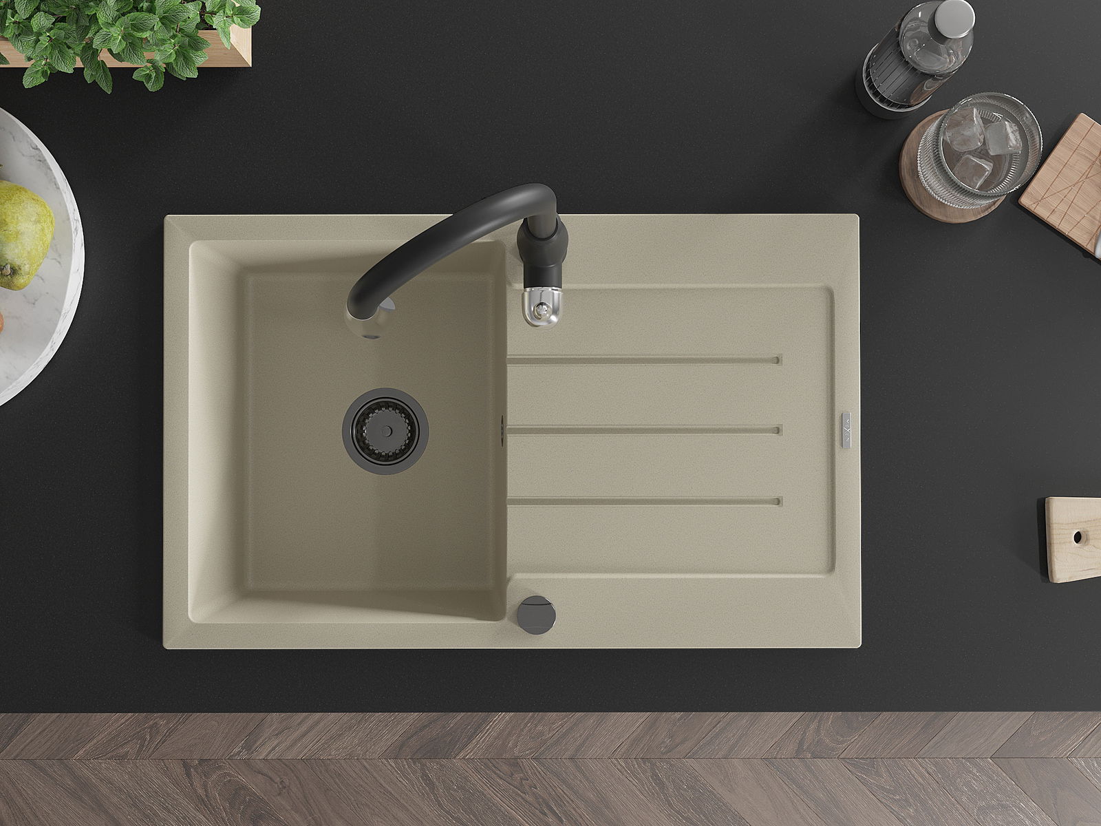 Mexen Bruno granitinė vienos kameros plautuvė su nutekėjimo ir virtuviniu čiaupu Savita, smėlio spalvos - 6513-69-672601-70