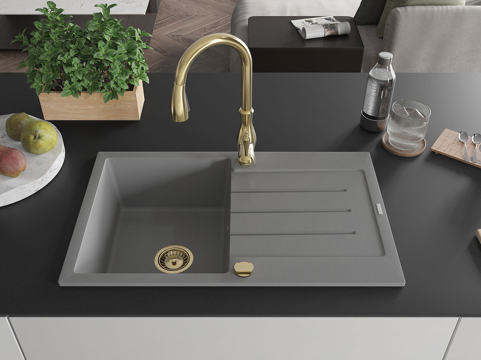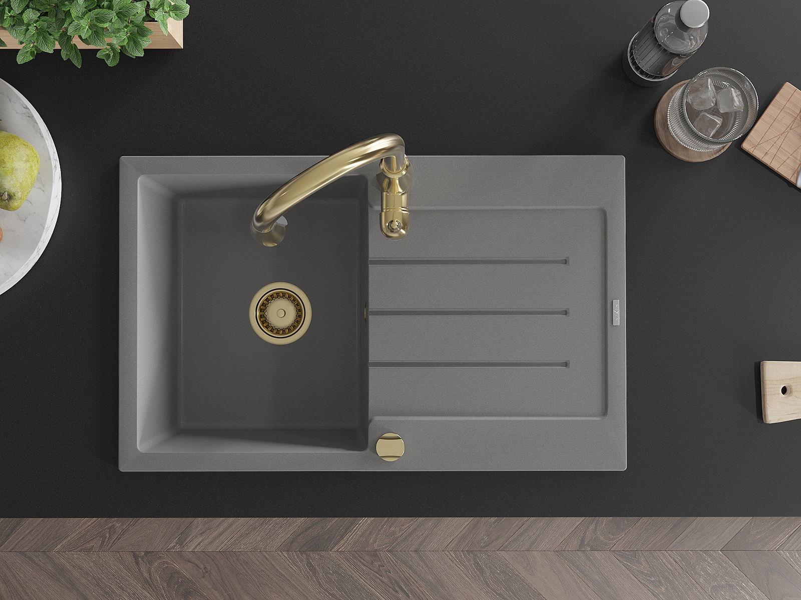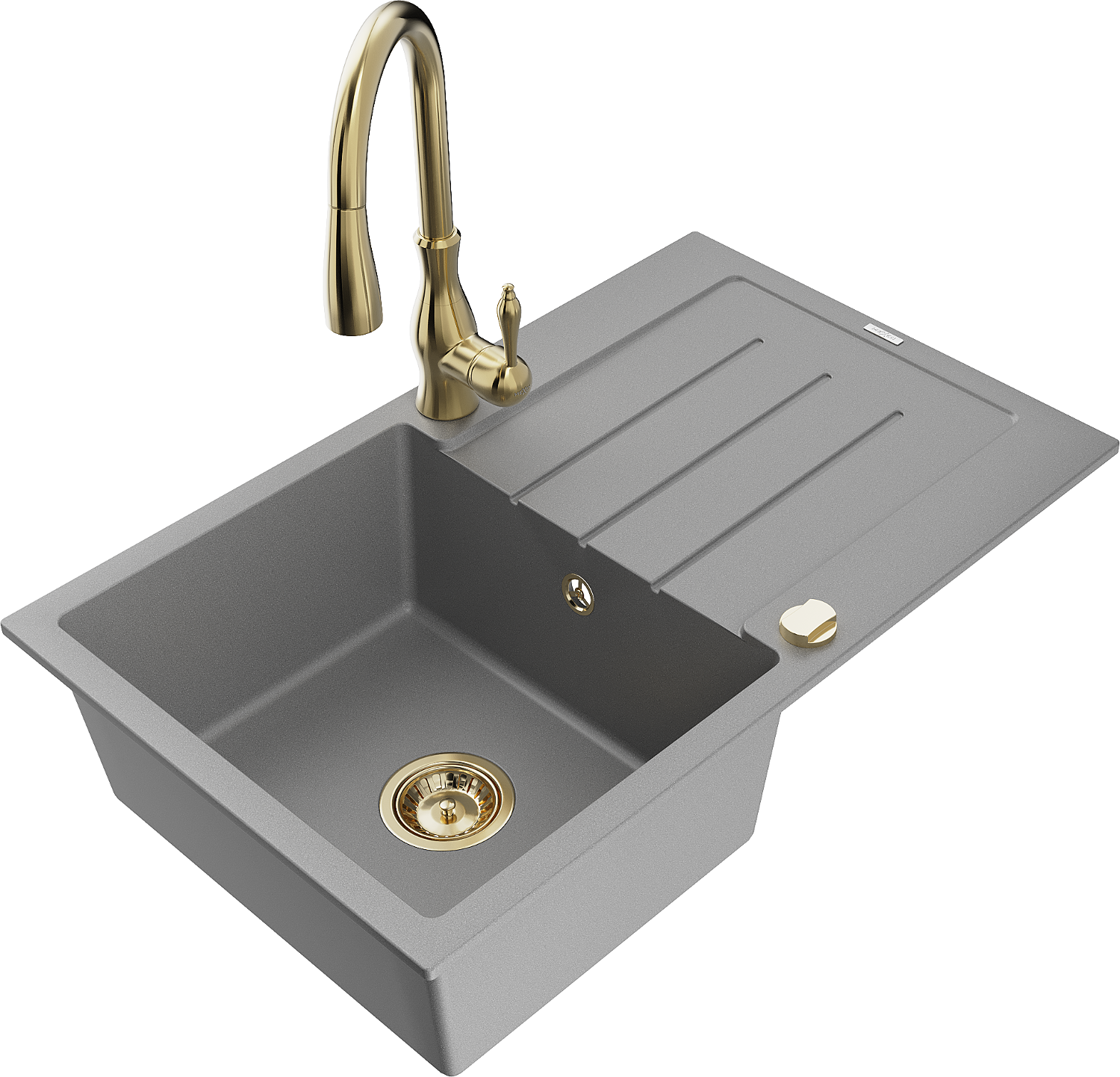 Mexen Bruno vienos kameros granitinė plautuvė su nutekamuoju indu ir Savita virtuviniu maišytuvu, pilka - 6513-71-672601-50