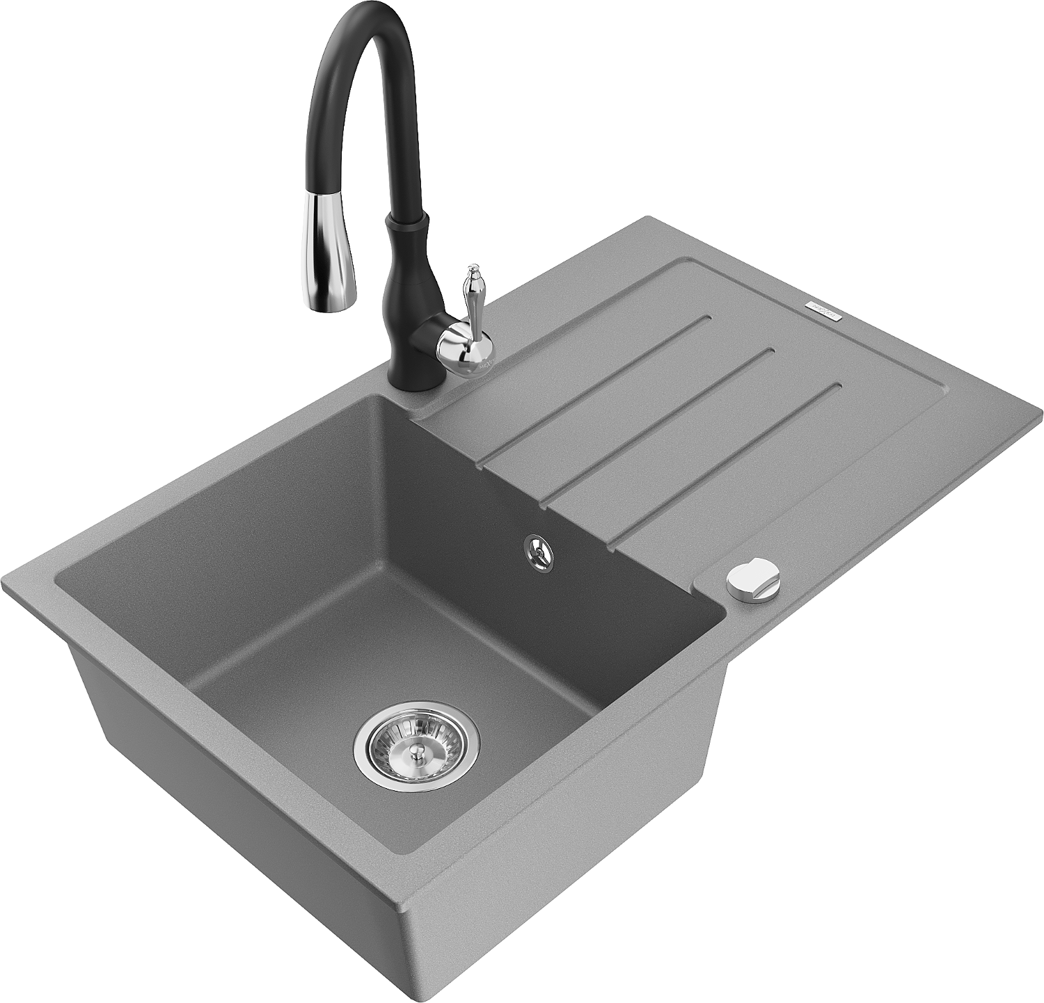 Mexen Bruno granitinis plautuvės komplektas su nutekėjimo indeliu ir virtuvės maišytuvu Savita, pilkas - 6513-71-672601-70