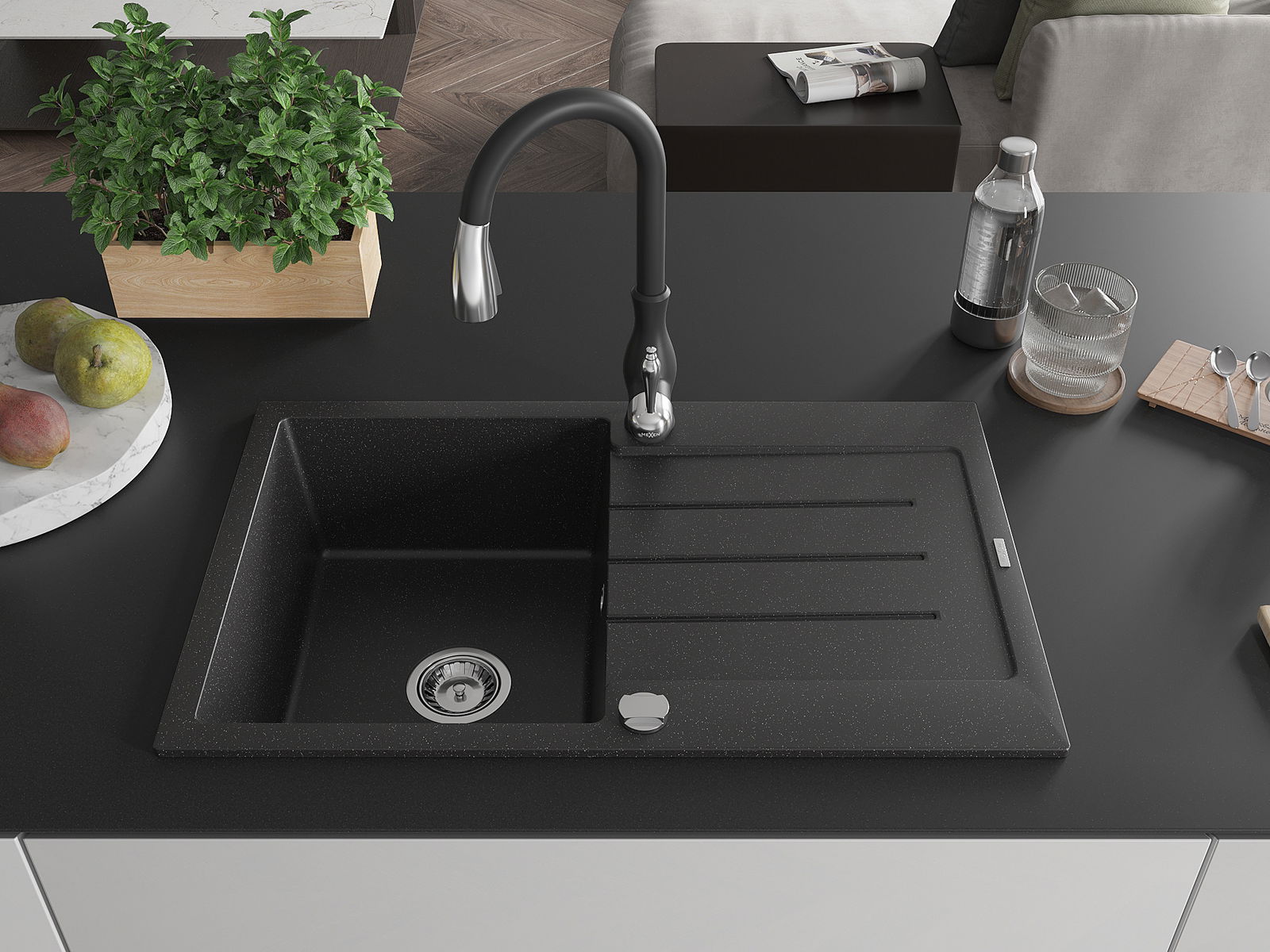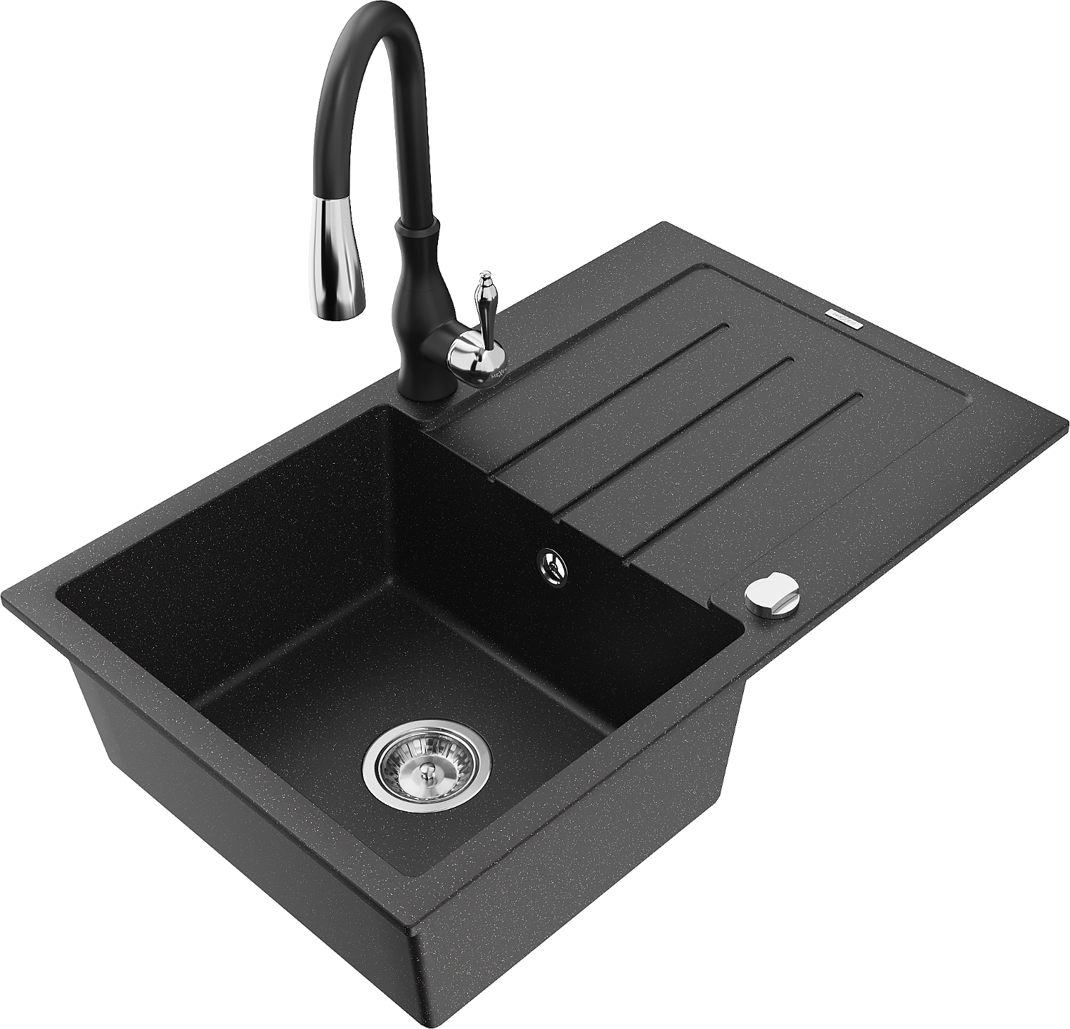 Mexen Bruno granitinė virtuvės kriauklė su vienu skyriumi, su lašėjimo plokšte ir virtuvės maišytuvu Savita,