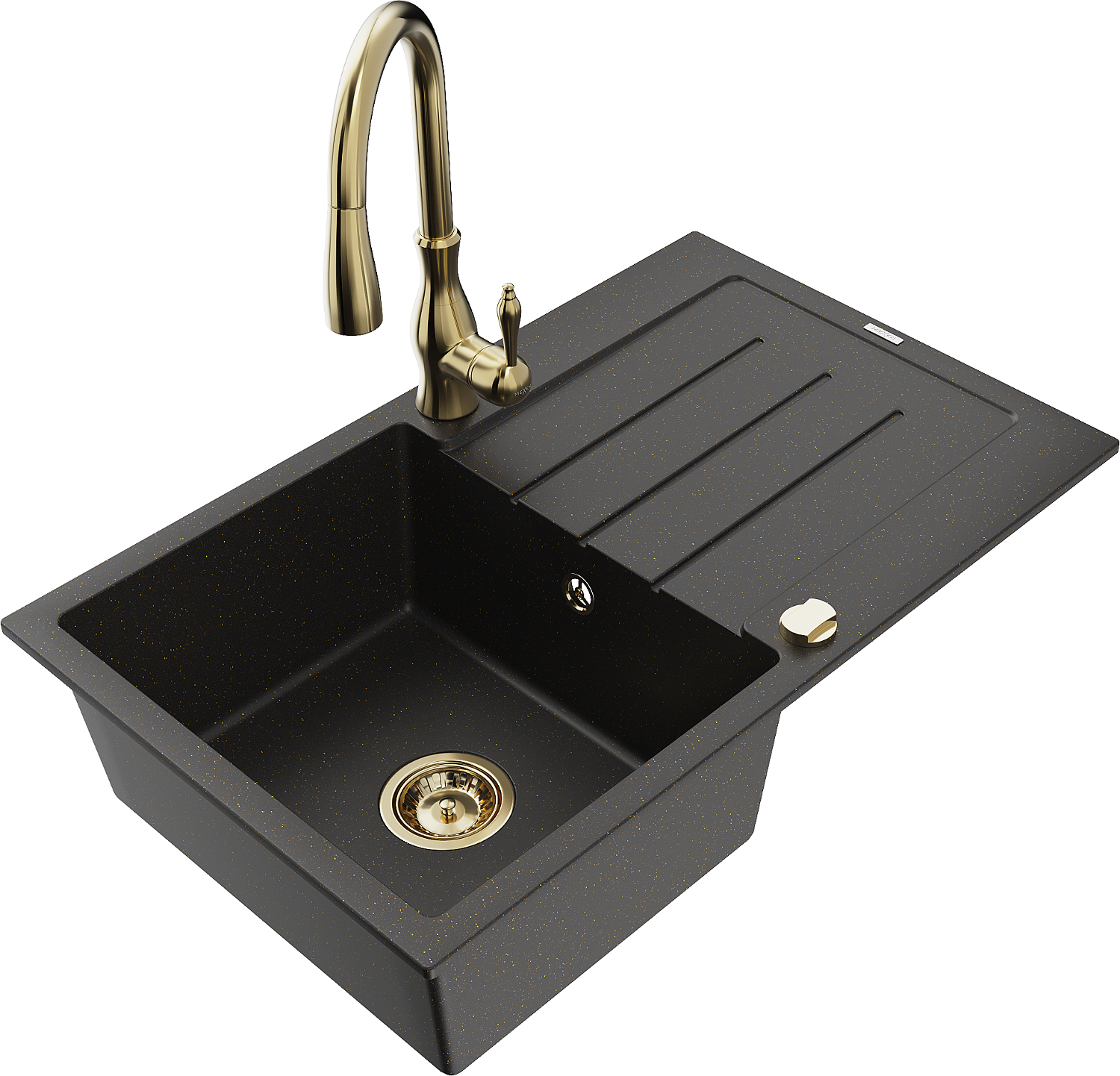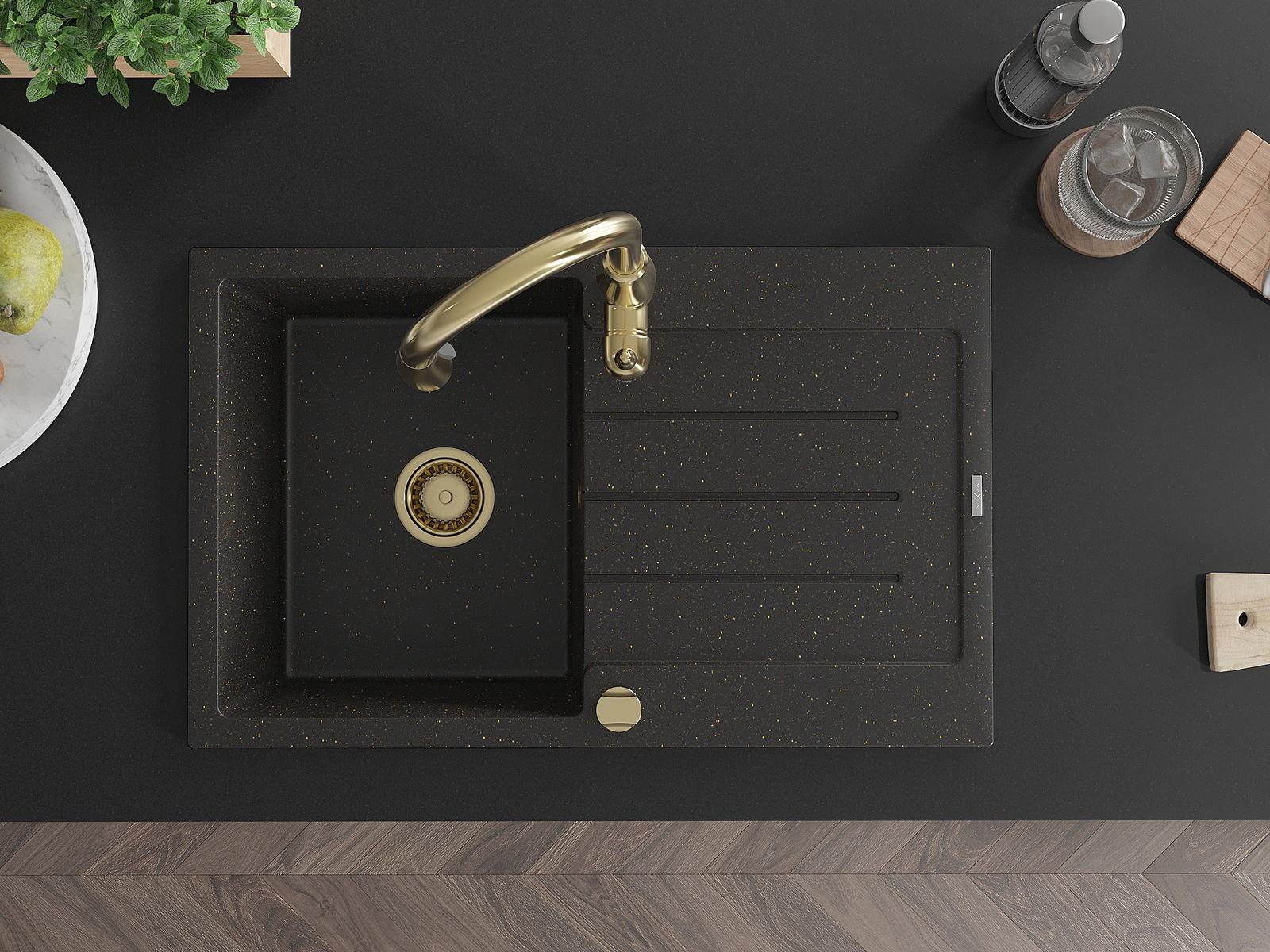 Mexen Bruno granitinė vieno dubens plautuvė su nusausintuvu ir virtuviniu kranu Savita, juoda/auksinė metalizuota