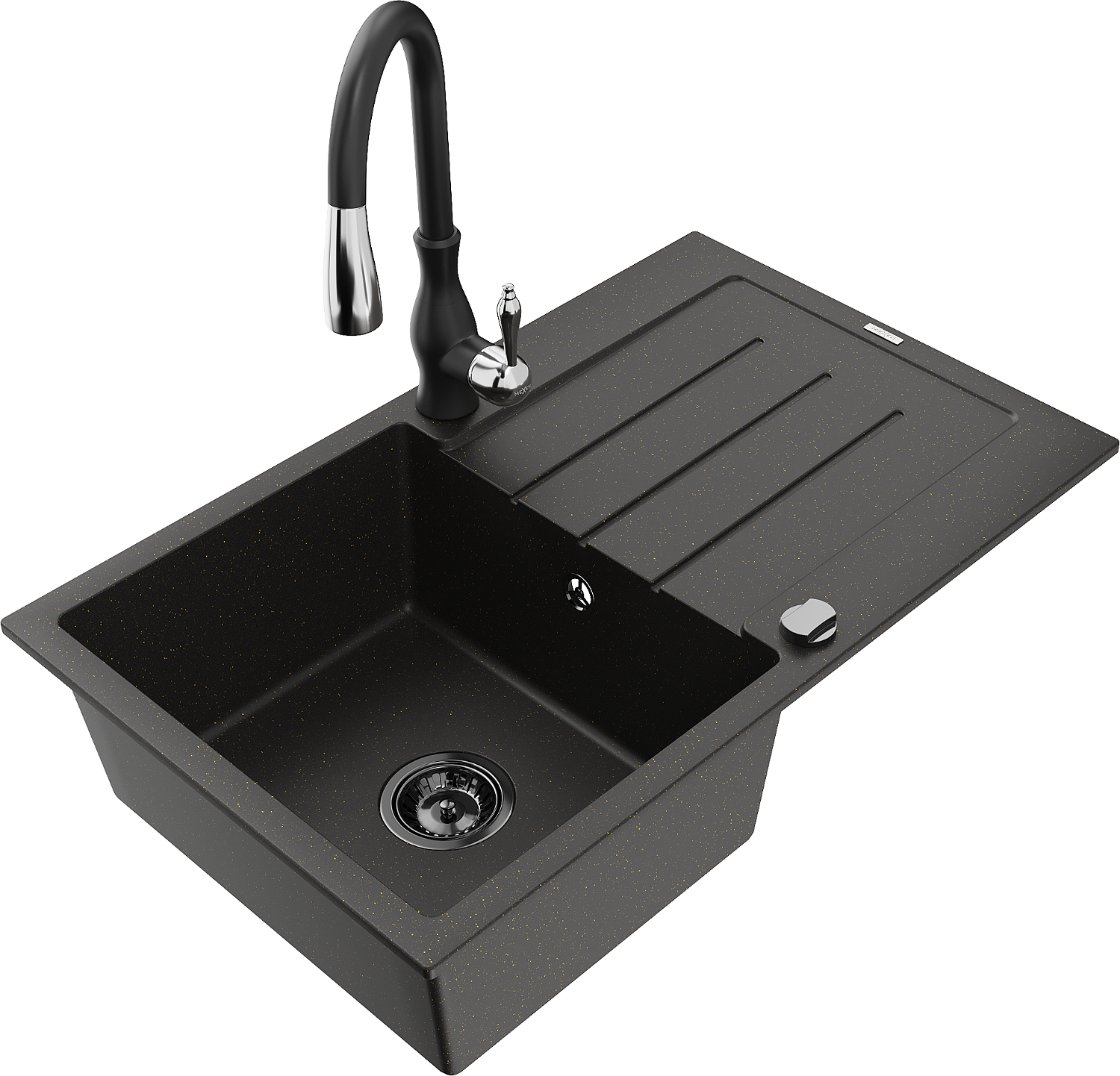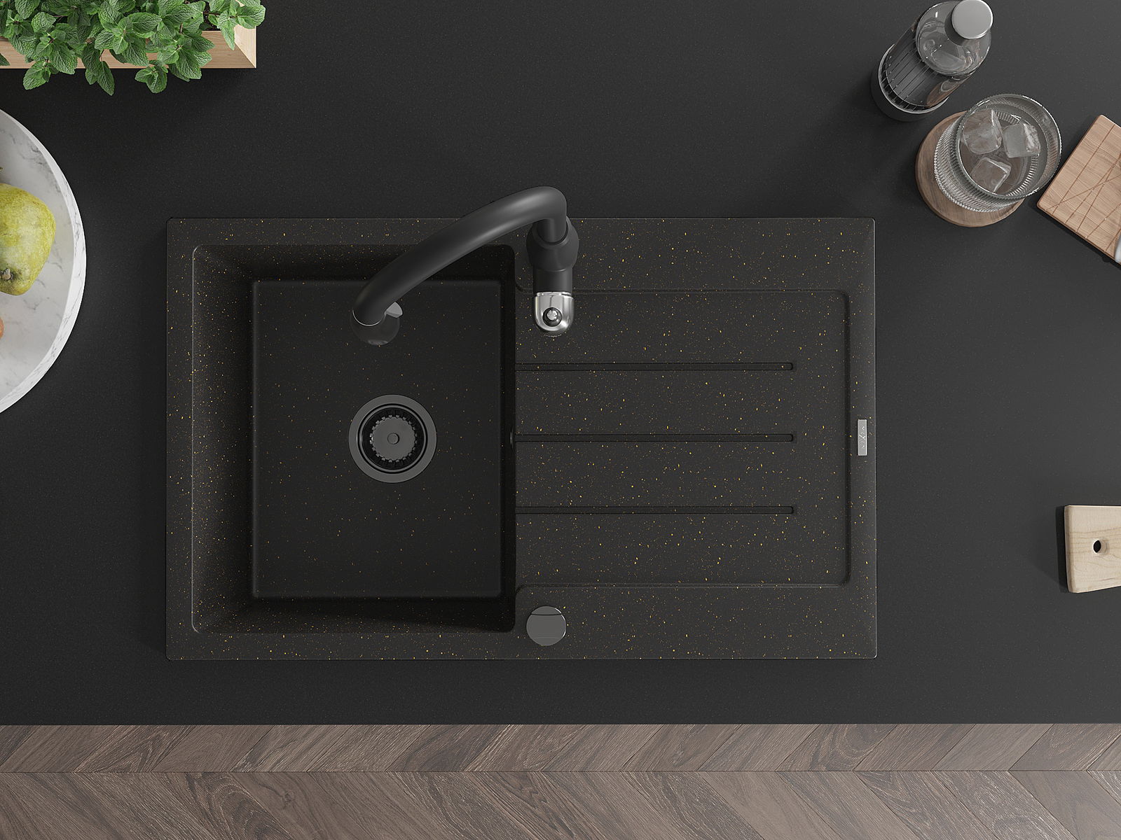 Mexen Bruno granitinė vienos kameros plautuvė su lašintuvu ir virtuviniu maišytuvu Savita, juoda/auksinė metalika