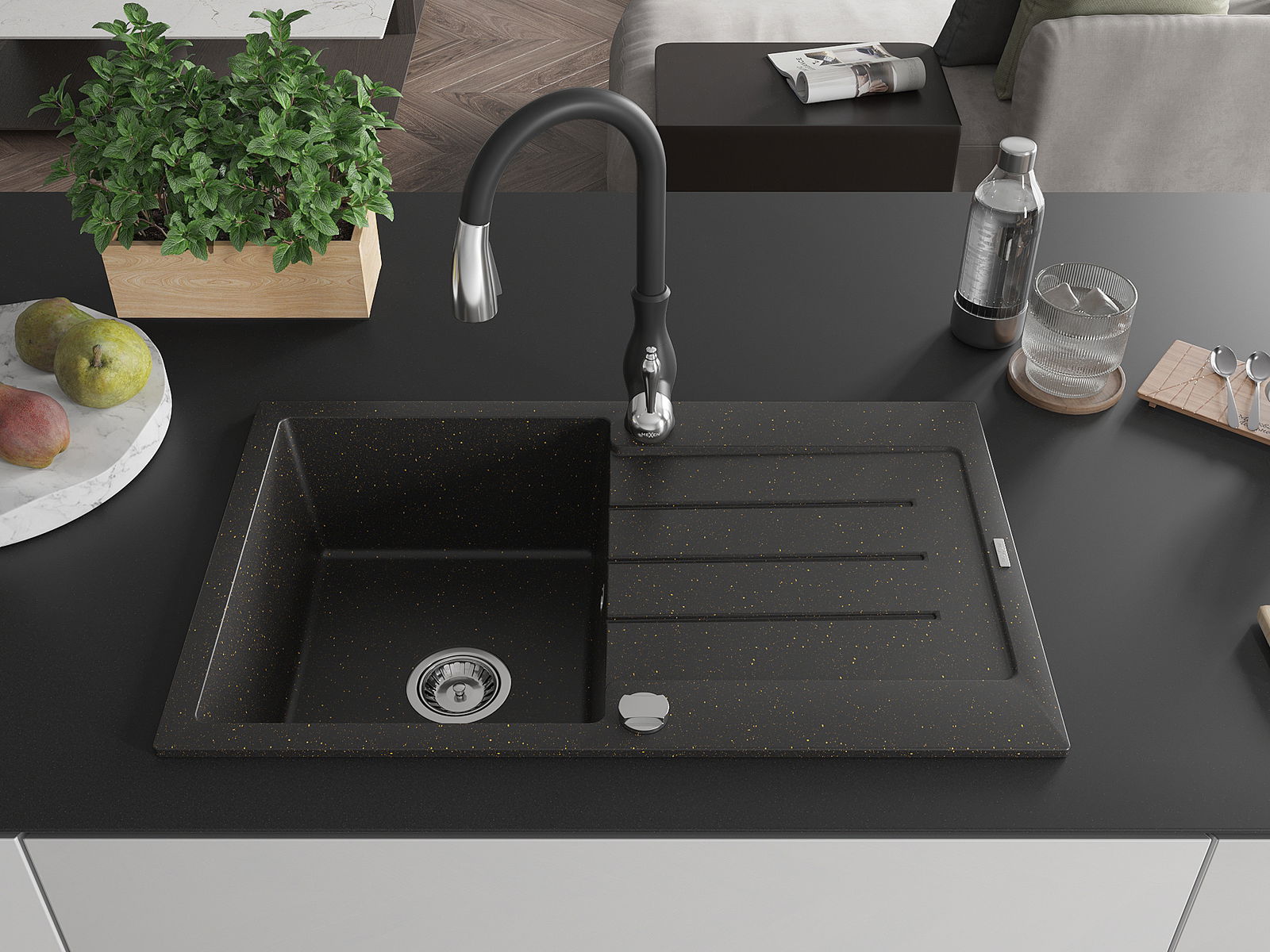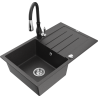 Mexen Bruno granitinė vienos kameros kriauklė su nusausintuvu ir virtuvės maišytuvu Savita, juoda/aukso metalo spalvos