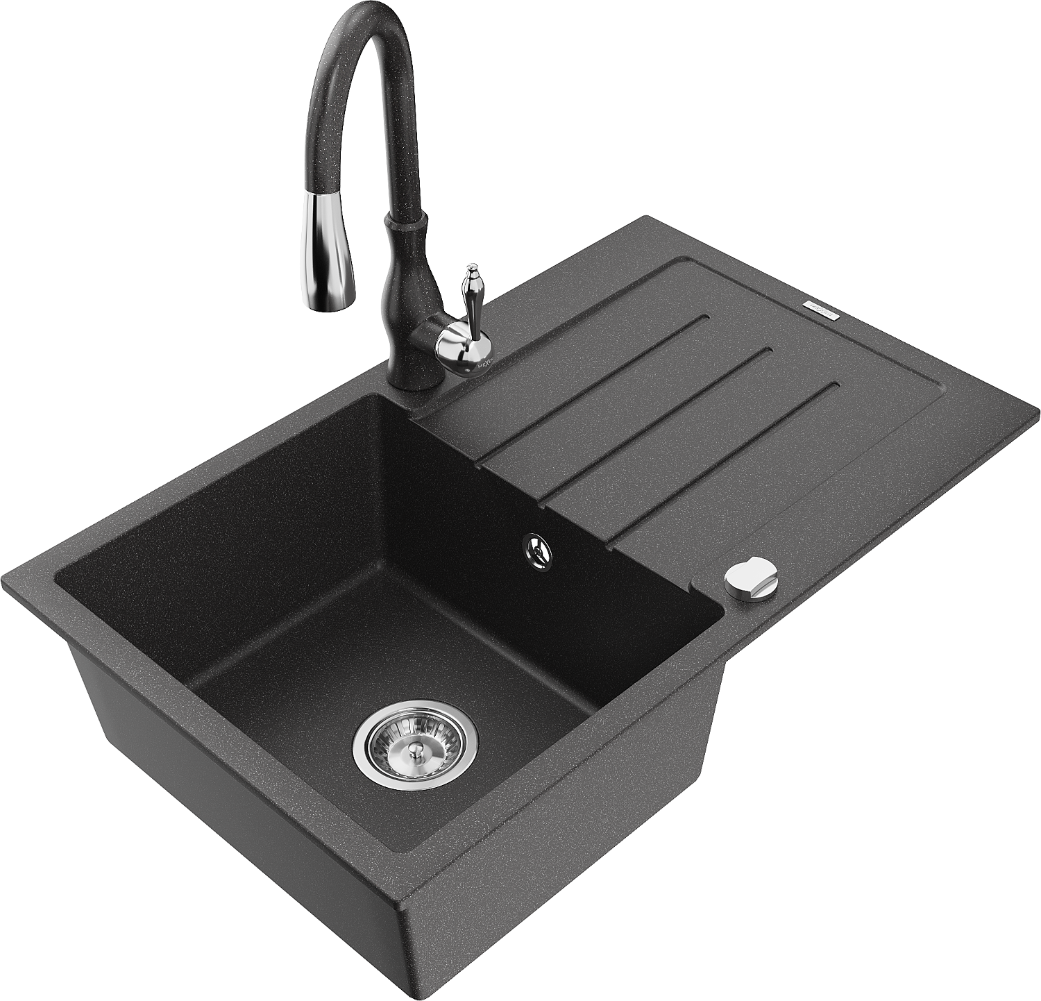 Mexen Bruno granito kriauklė vienos sekcijos su nutekėjimu ir virtuvės maišytuvu Savita, juoda taškuota - 6513-76-672601-76