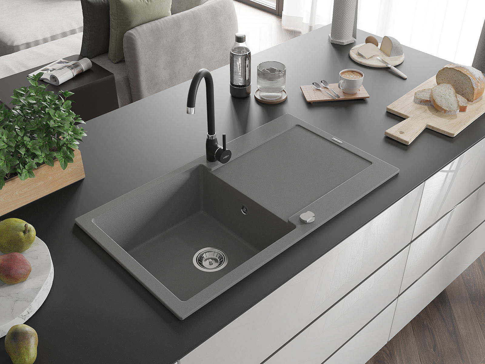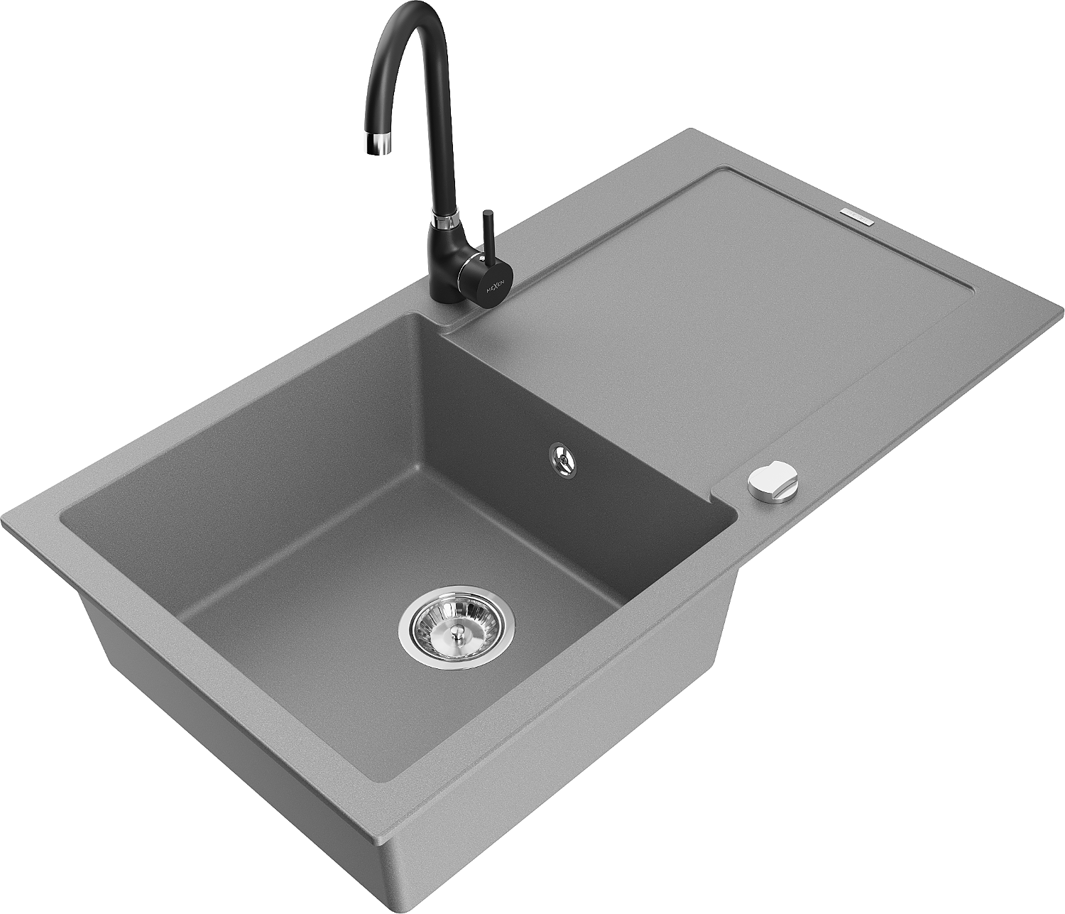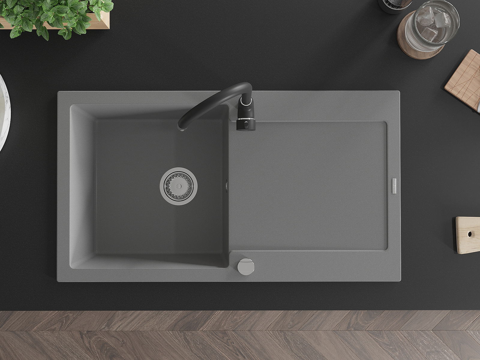 Mexen Leo granitinis vienos plautuvės kriauklė su nusausintuvu ir virtuviniu maišytuvu Telma, pilkas - 6501-71-670200-70