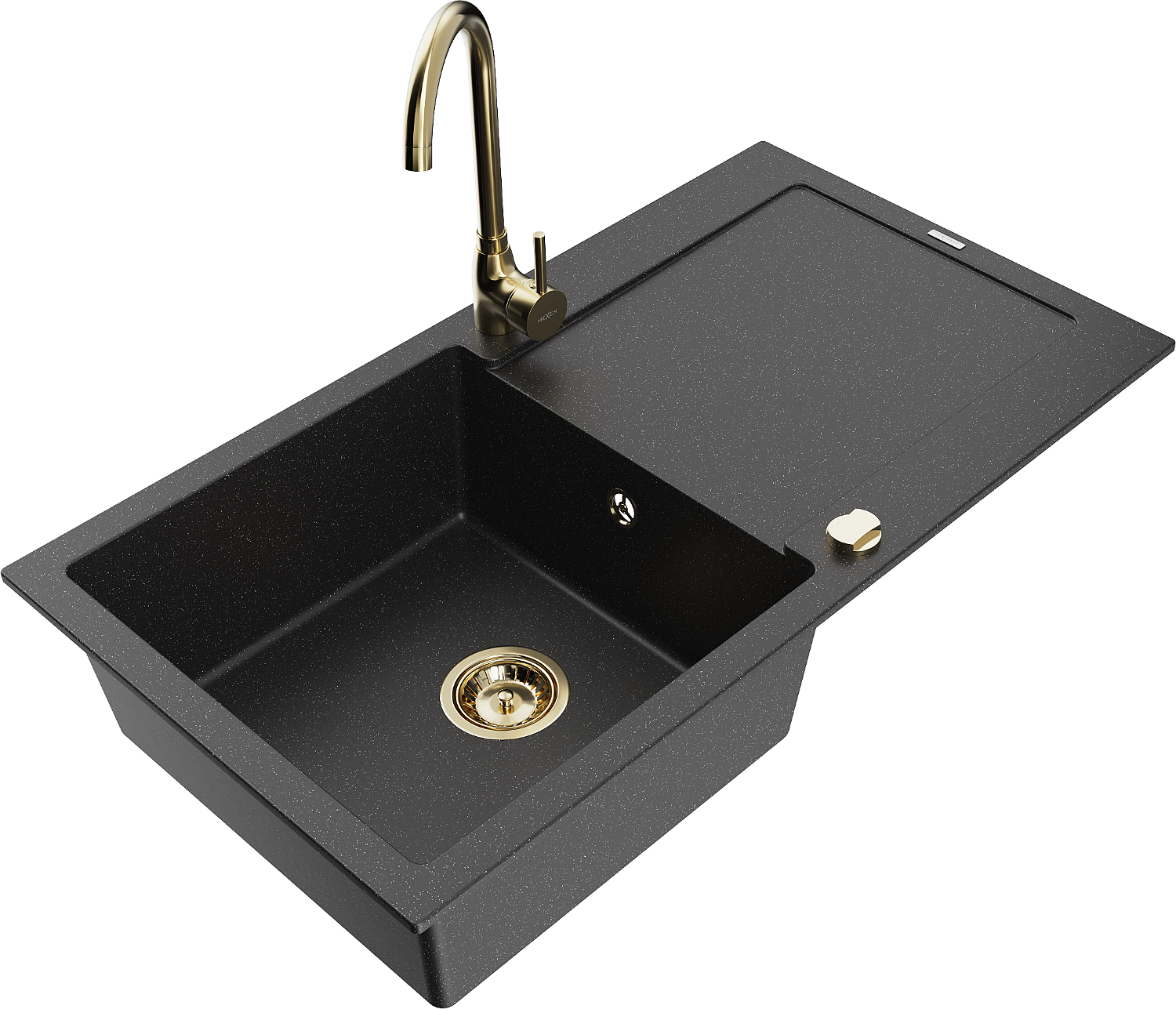 Mexen Leo 1 kamerų granitinė kriauklė su drenažu ir virtuviniu maišytuvu Telma, juoda/sidabro metalikas - 6501-73-670200-50