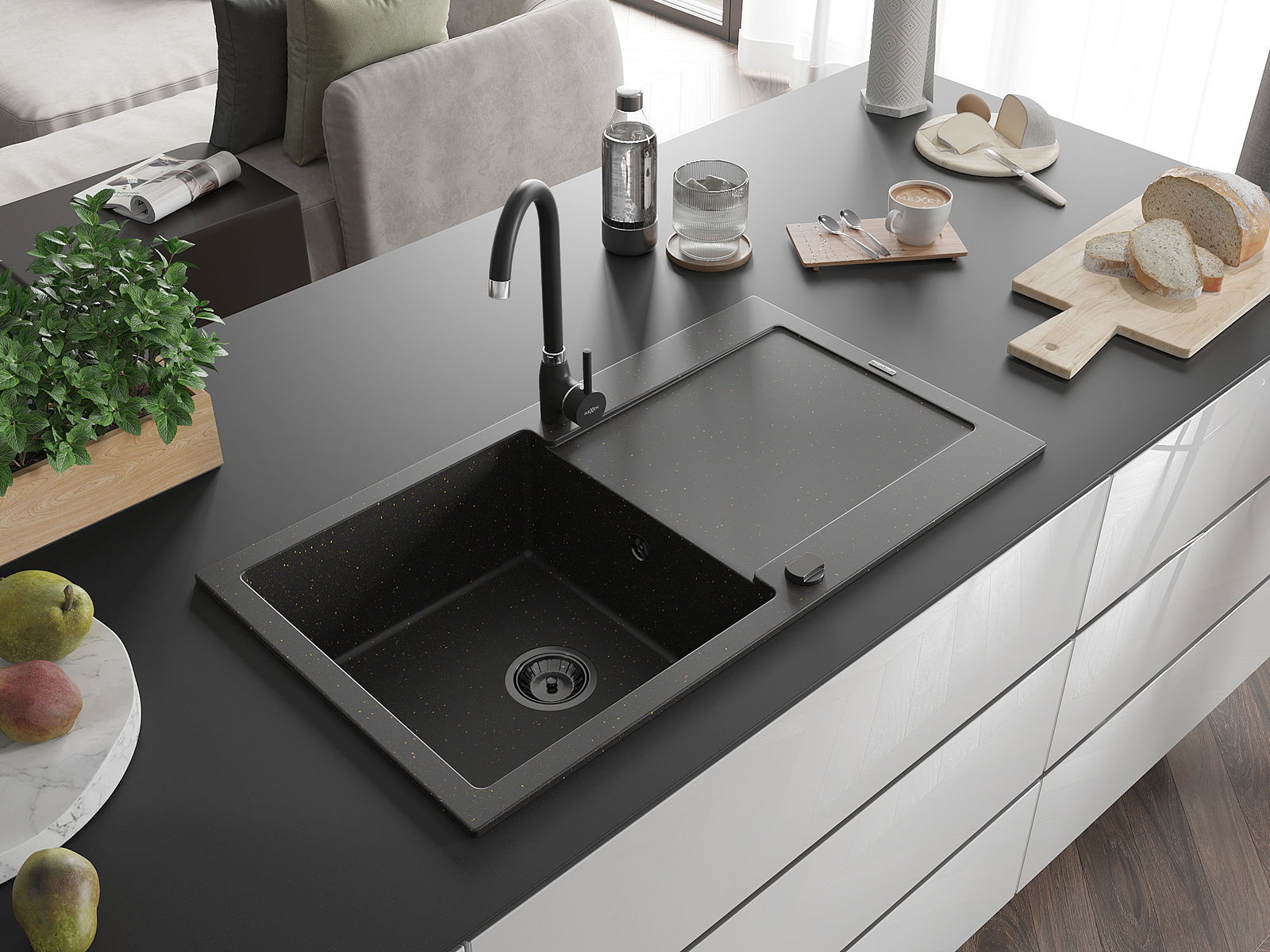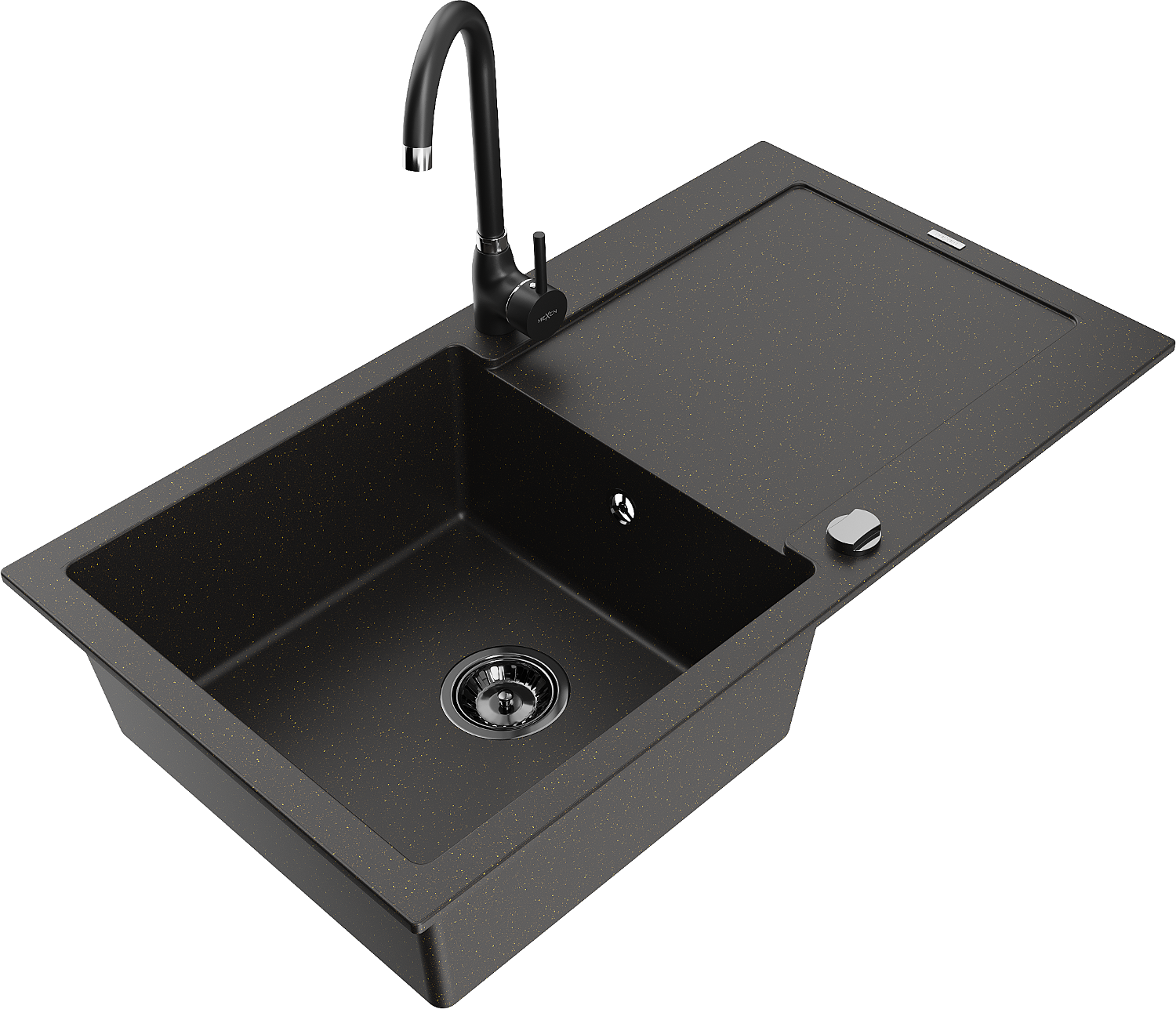 Mexen Leo granitinė vienos kameros plautuvė su nutekėjimo ir virtuviniu maišytuvu Telma, juodas/auksinis metalikas