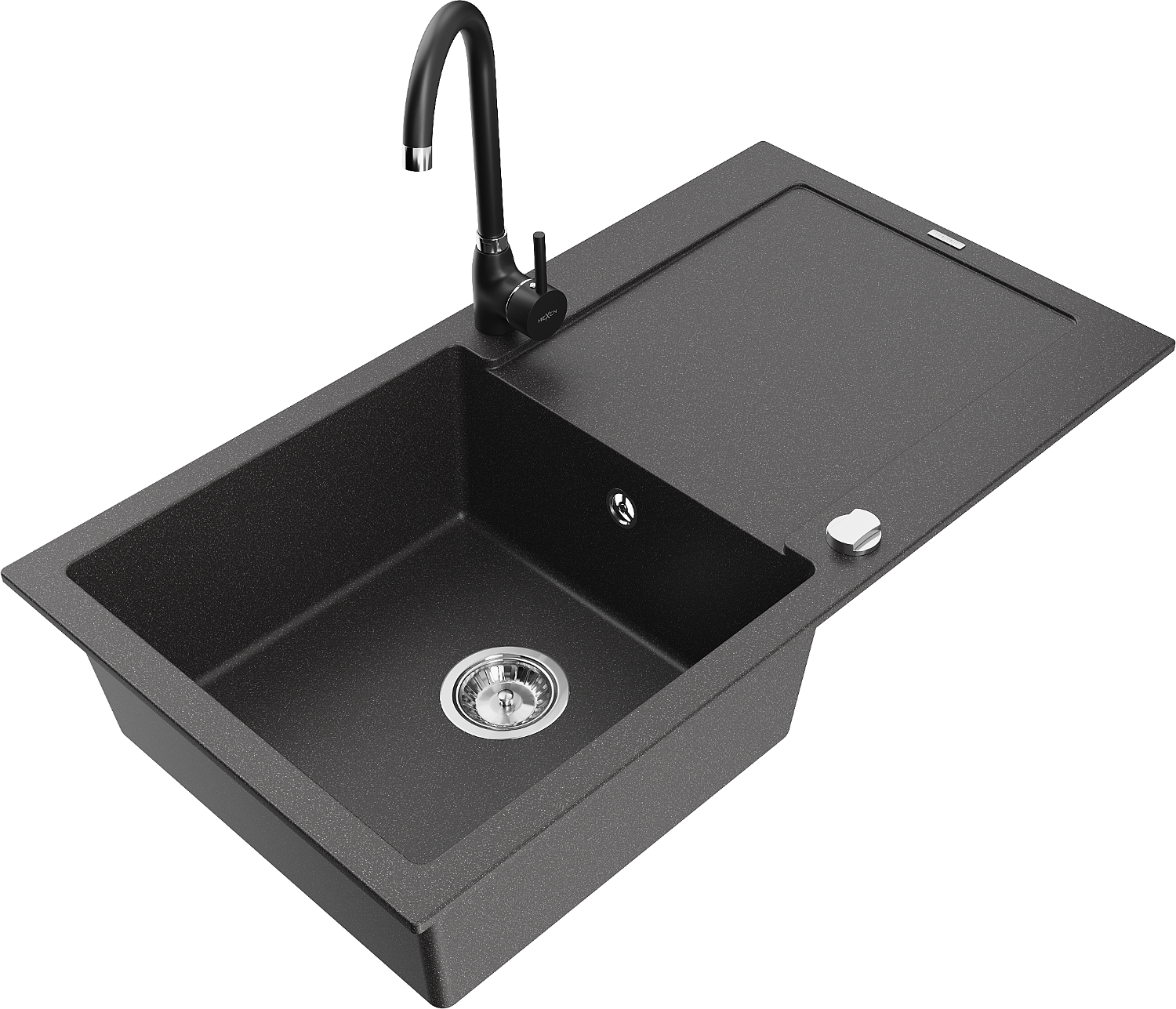 Mexen Leo granitinė vienos kameros plautuvė su nutekėjimu ir virtuviniu maišytuvu Telma, juoda su dekoratyviniais taškais