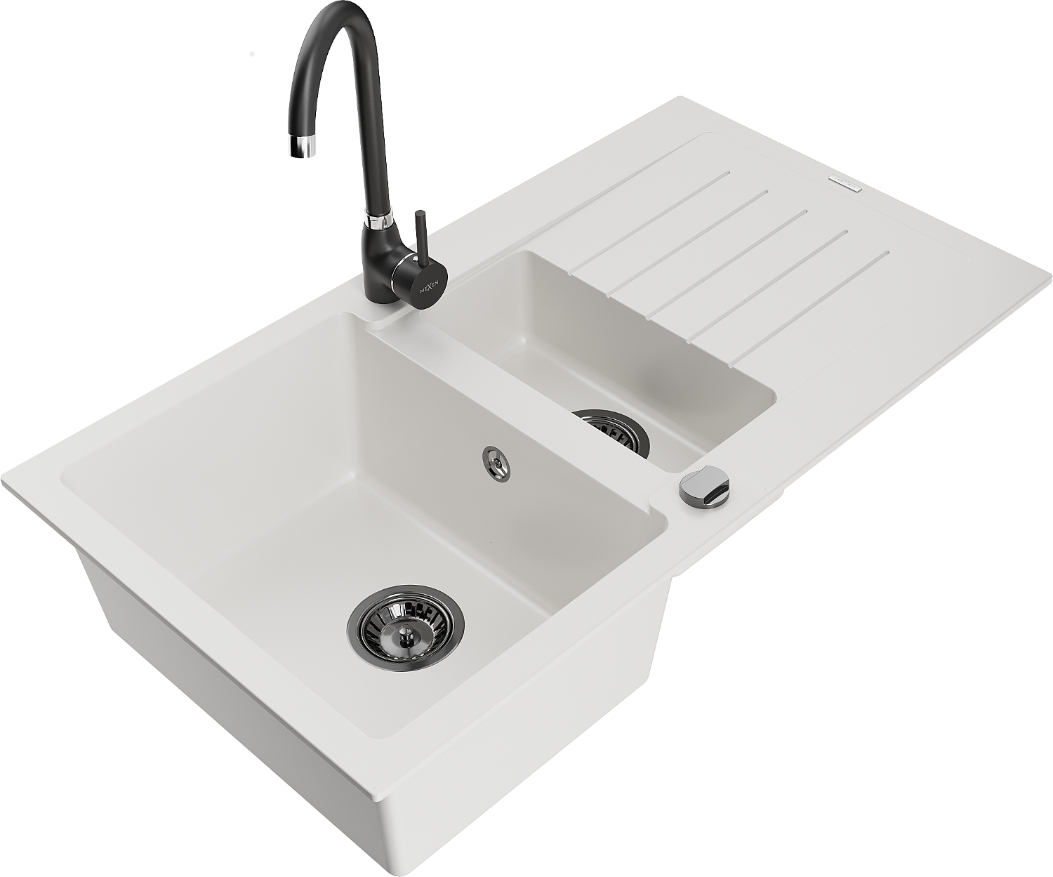 Mexen Matias granito plautuvė su 1,5 skyrelio su nutekamu vandeniui bei virtuvės maišytuvu Telma, balta - 6502-20-670200-70