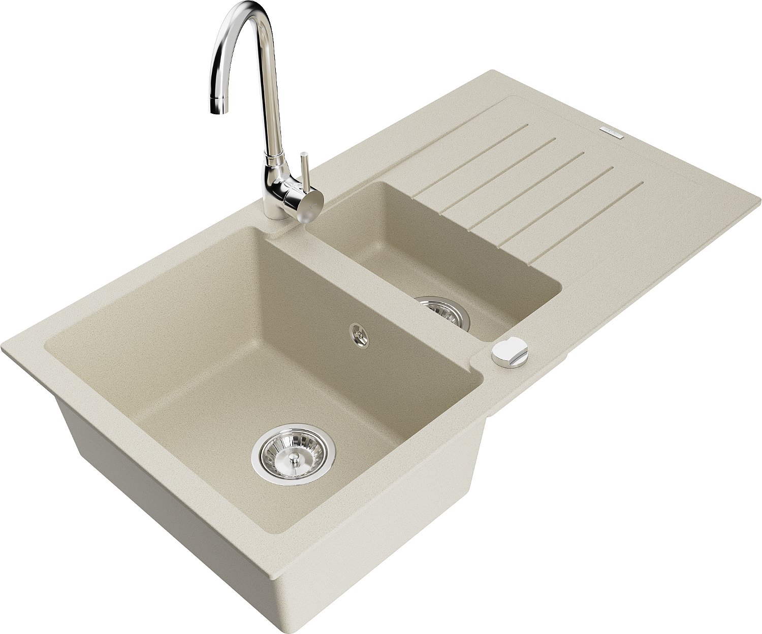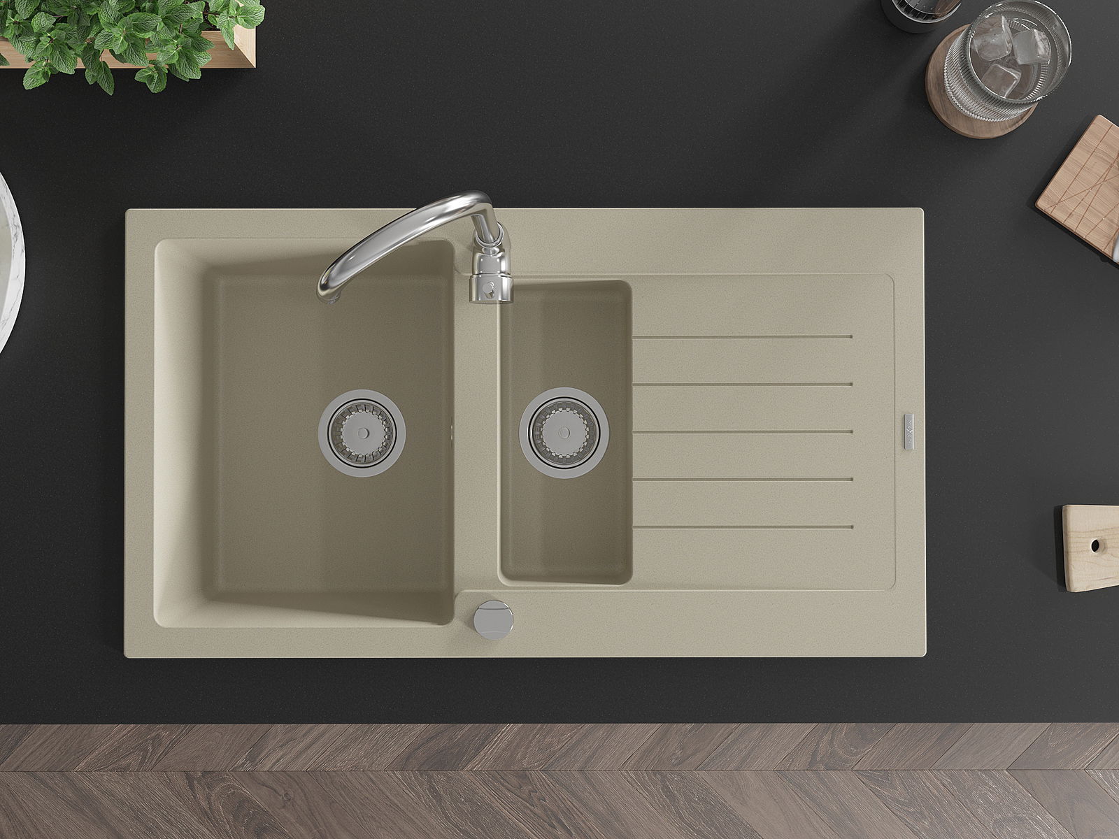 Mexen Matias granitinė virtuvės plautuvė 1,5 sekcijų su nusausintuvu ir virtuviniu čiaupu Telma, smėlio spalvos