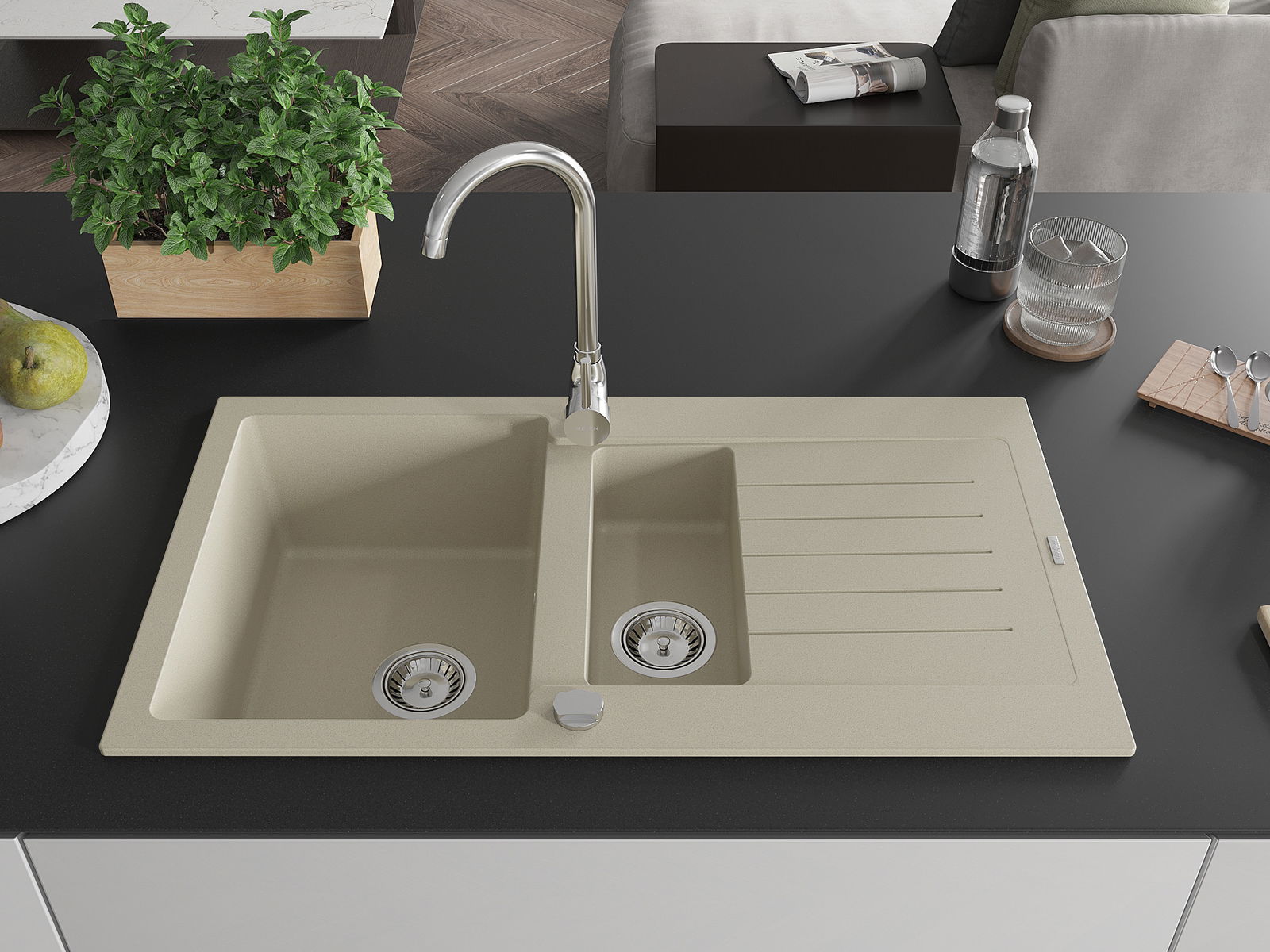 Mexen Matias granitinis 1,5 kamerų kriauklė su nusausinimo lentyna ir Telma virtuvės maišytuvu, smėlio spalvos - 6502-69-670200?
