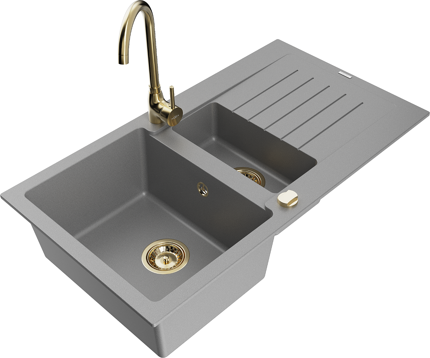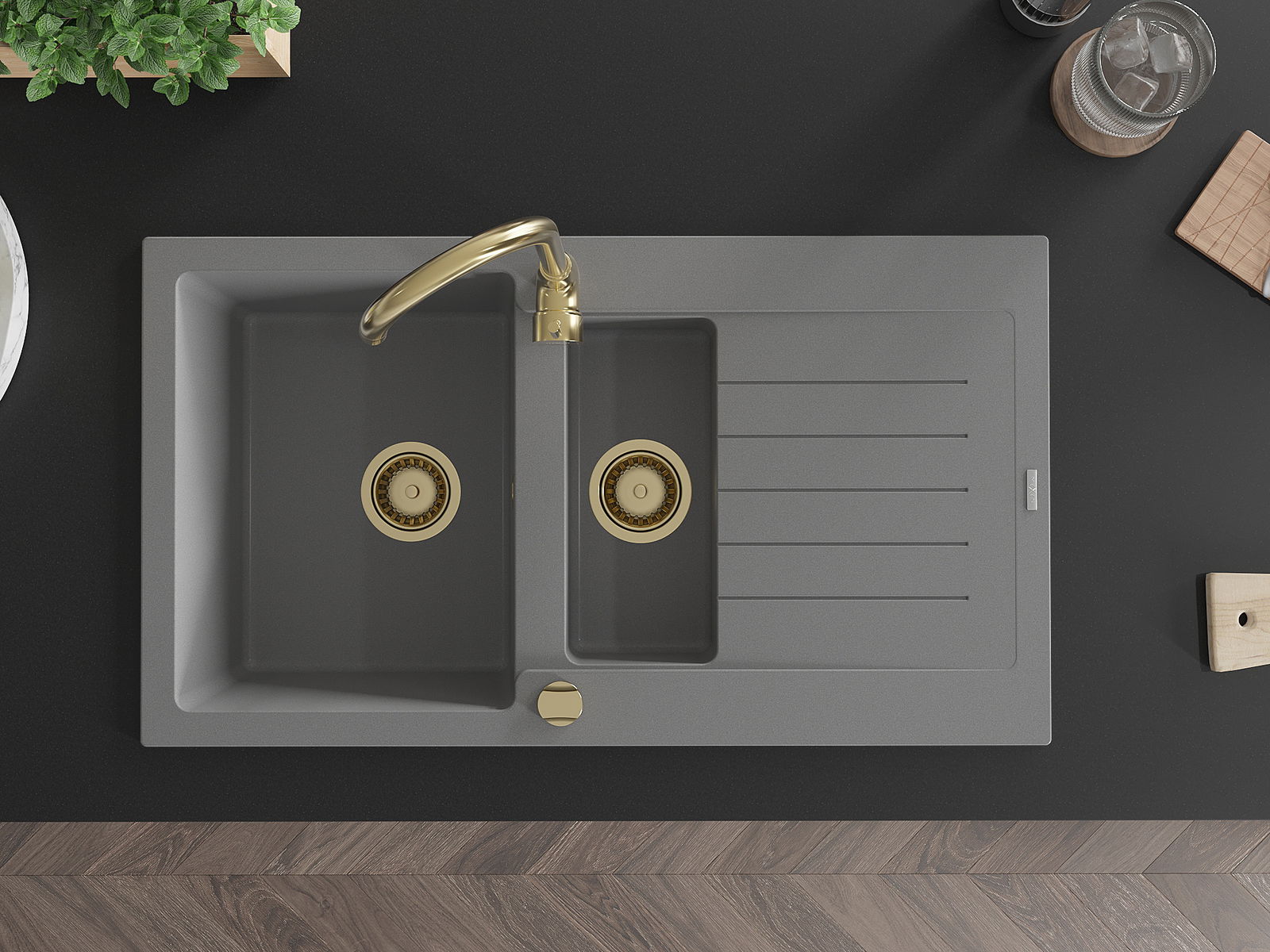 Mexen Matias granitinė 1,5 kamerų plautuvė su nuvarvėjimu ir virtuvės maišytuvu Telma, pilka - 6502-71-670200-50