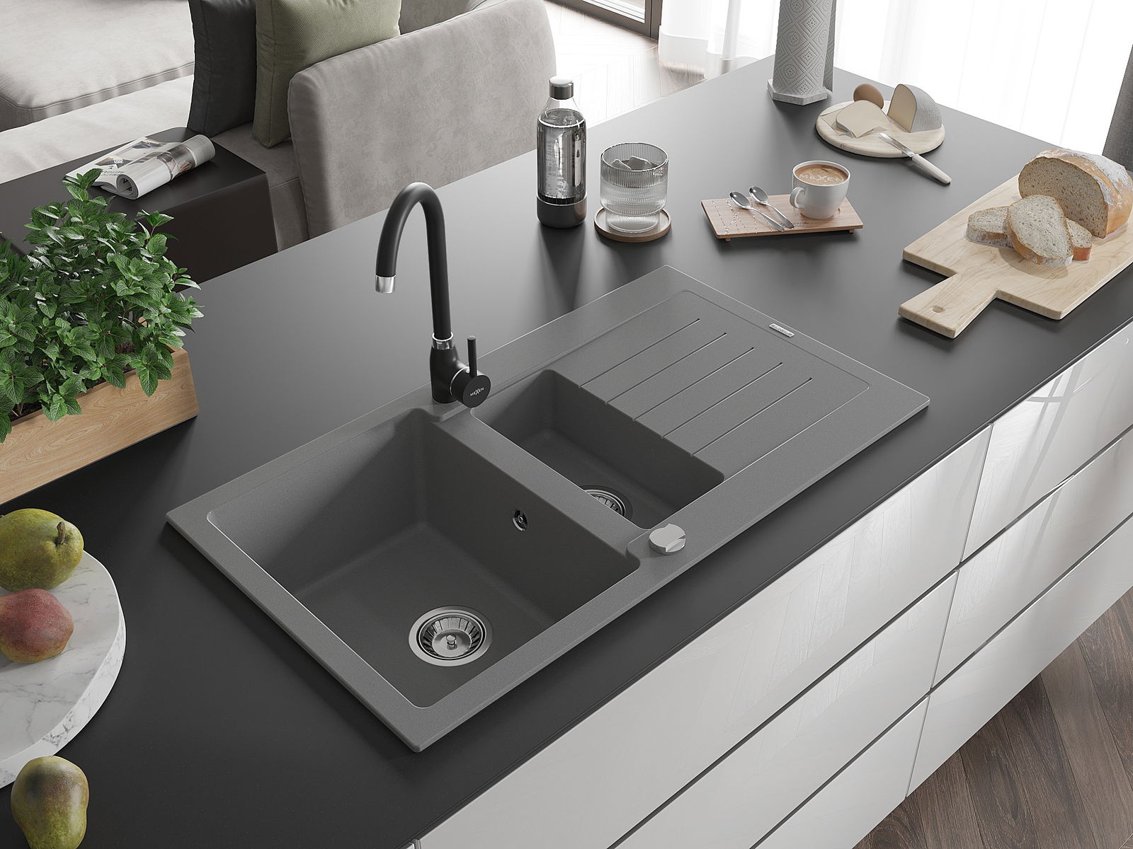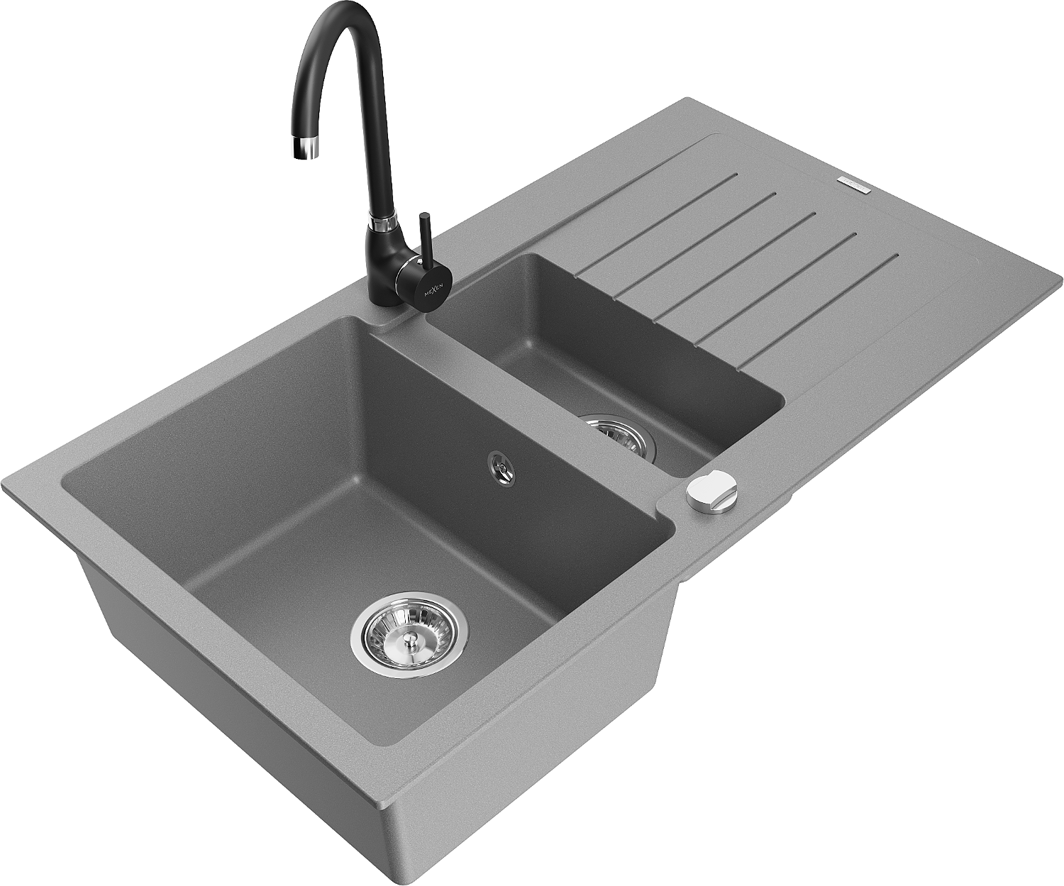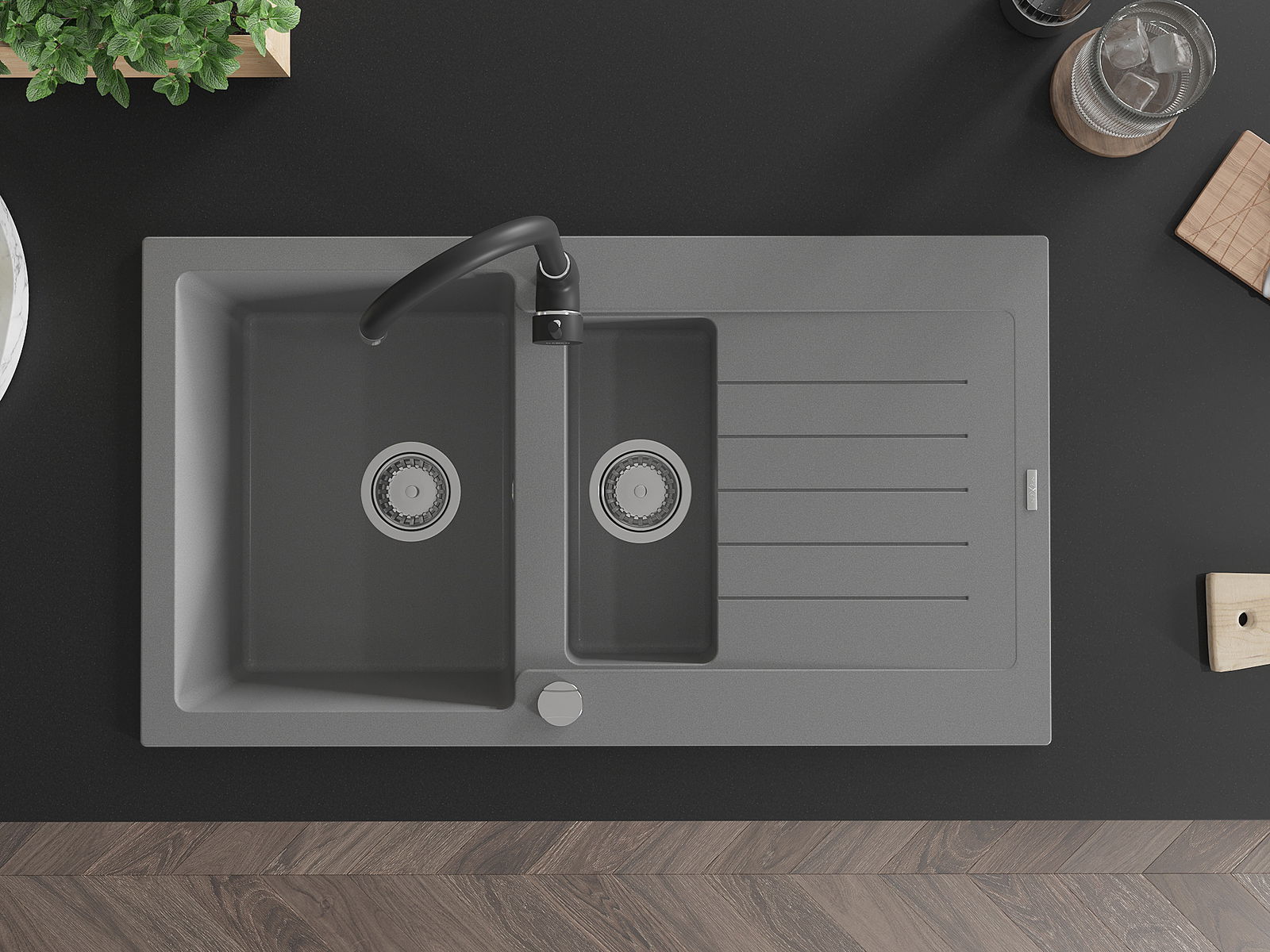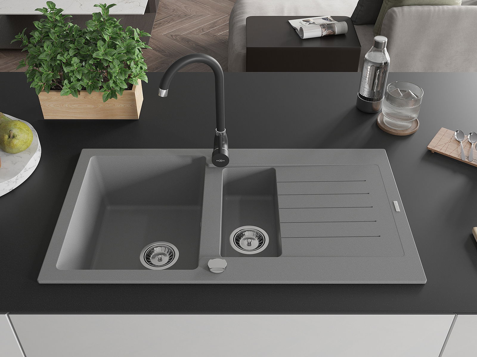 Mexen Matias granito kriauklė 1,5-dubenų su nutekėjimu ir virtuvės maišytuvu Telma, pilka - 6502-71-670200-70