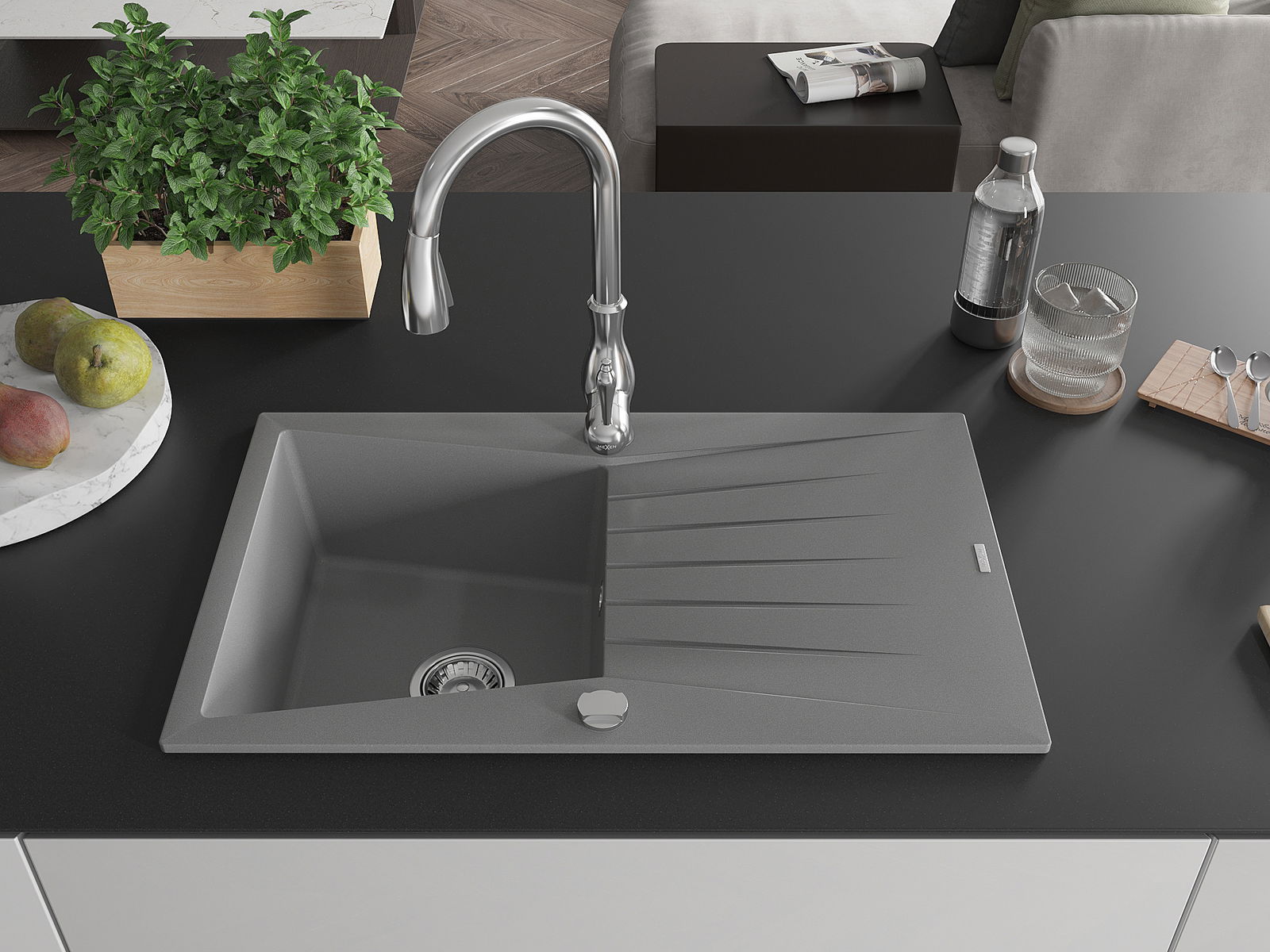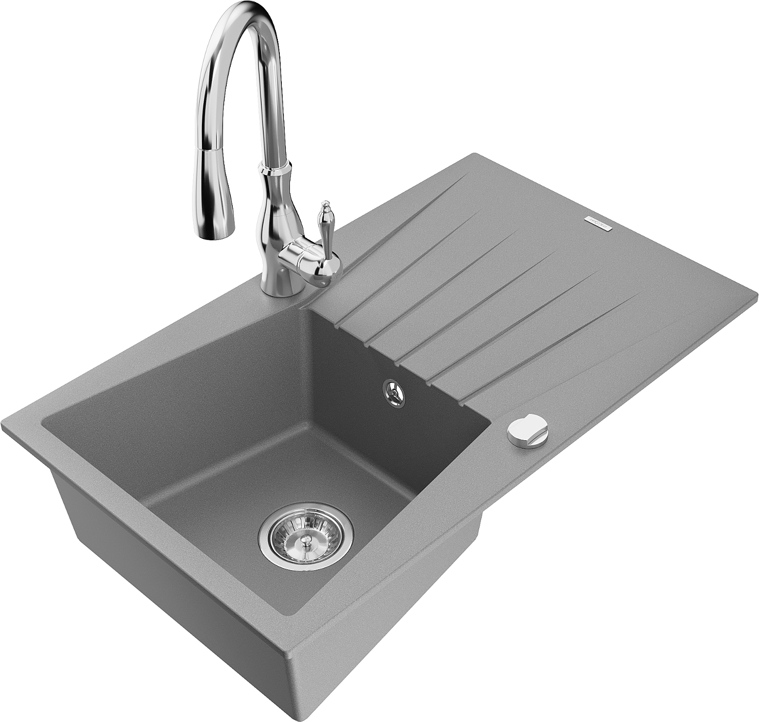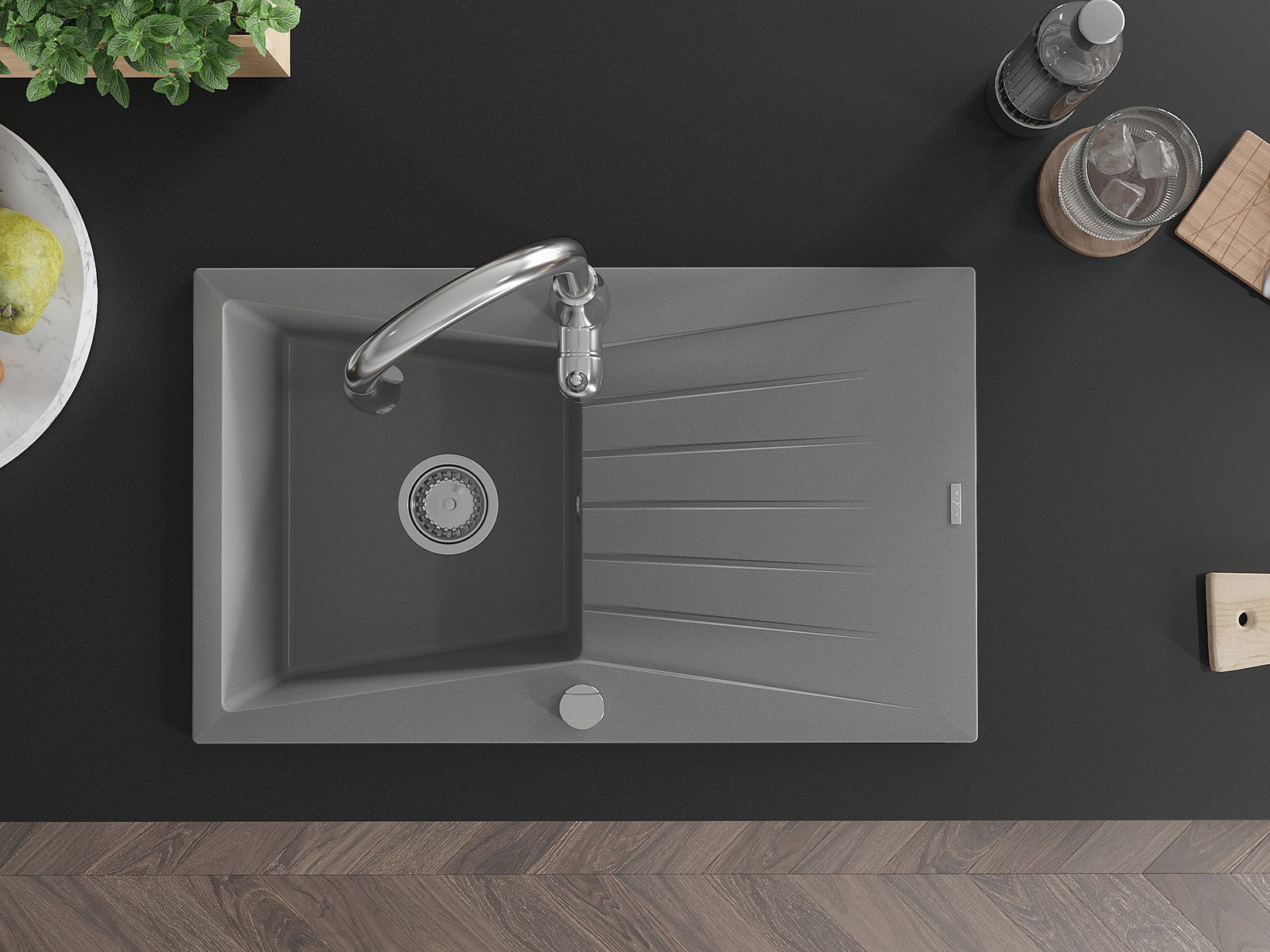 Mexen Cesar granitinis vienos sekcijos plautuvė su nusausinimo vieta ir virtuviniu maišytuvu Savita, pilkas - 6514-71-672601-00