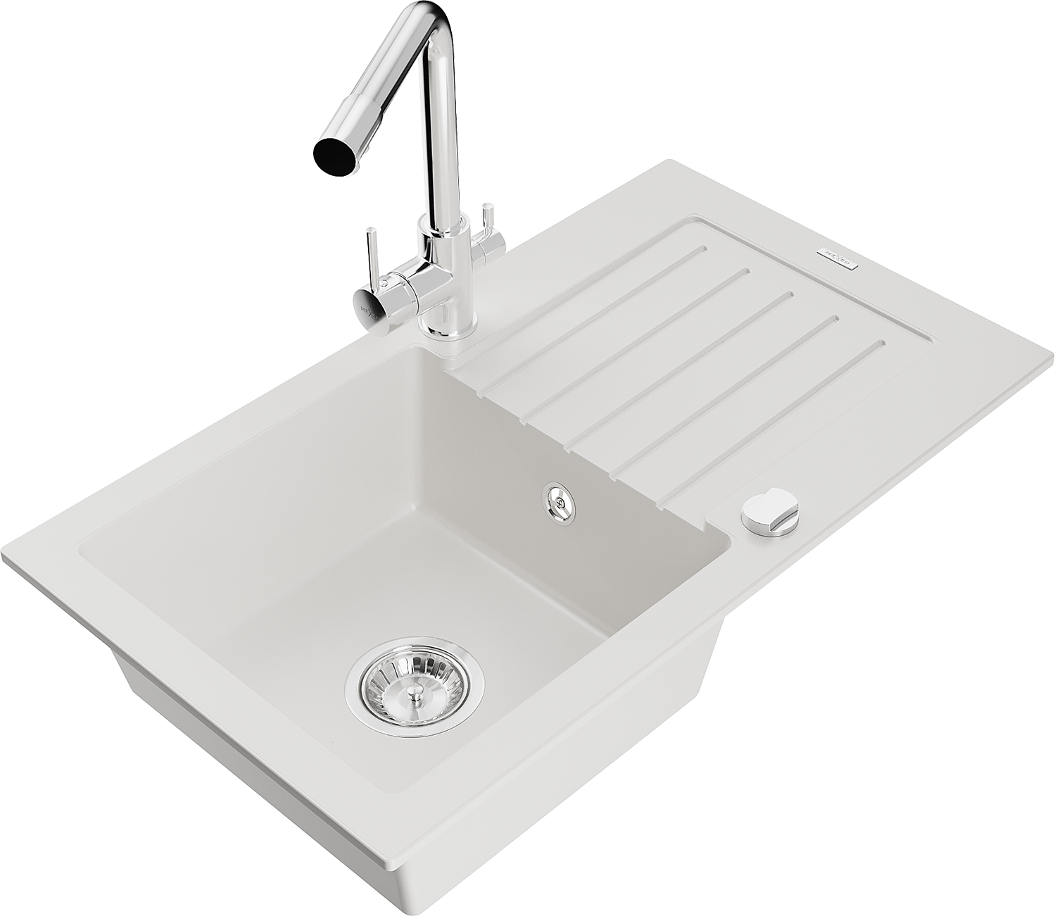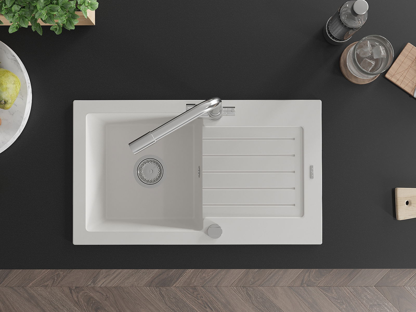 Mexen Pablo 1 skyriuje granitinė kriauklė su išleidimu ir virtuvės čiaupu Duero, balta - 6510-20-671600-00