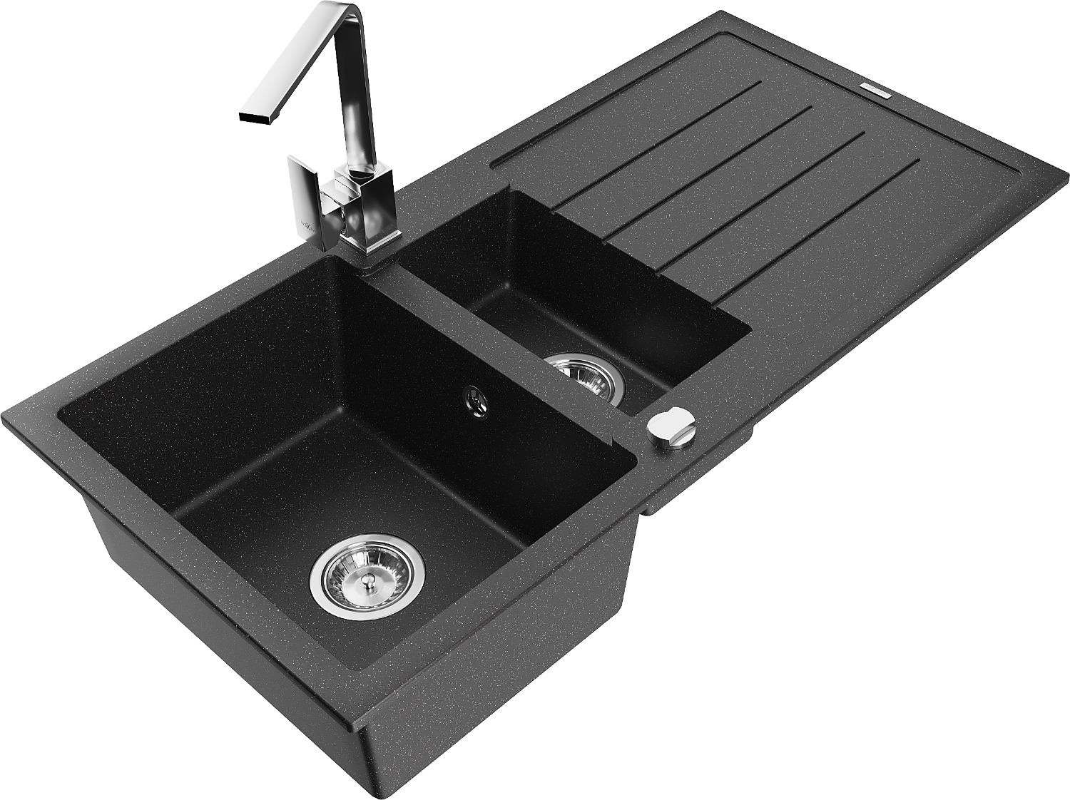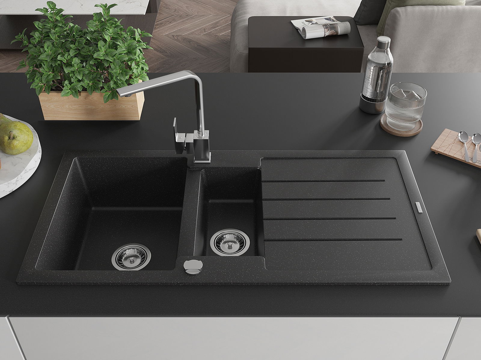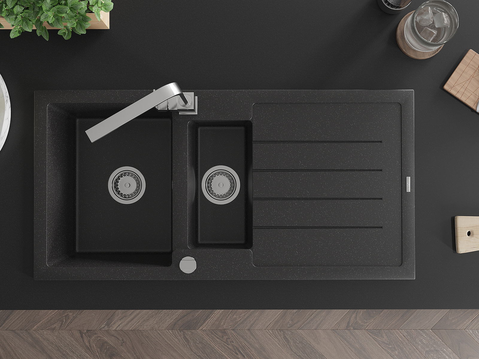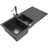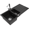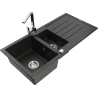 Mexen Andres 1,5 kamerų granitinė kriauklė su nusausinimo lentyna ir virtuviniu maišytuvu Rita, juoda/sidabrinis metalikas
