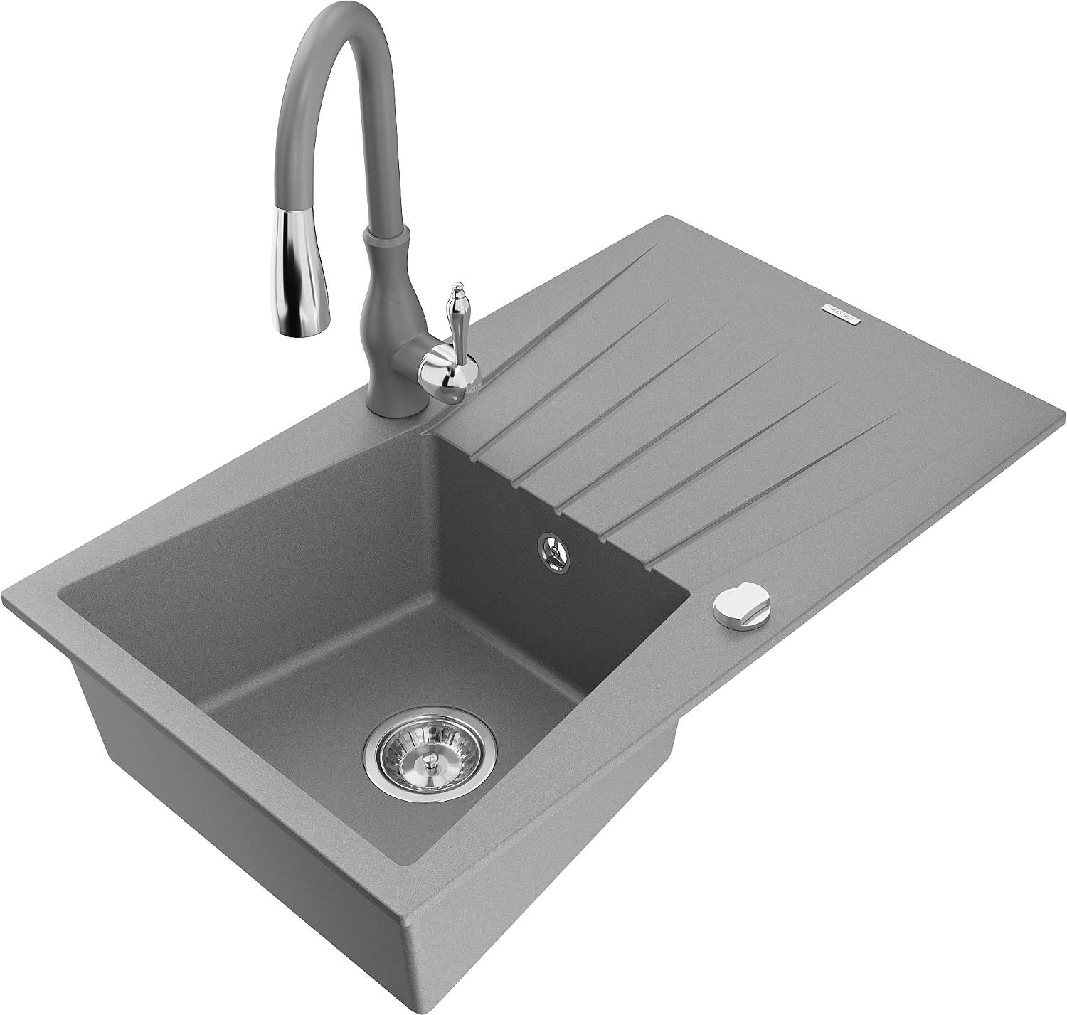 Mexen Cesar granito kriauklė su viena kamera bei nusausinimo lentyna ir virtuviniu maišytuvu Savita, pilka - 6514-71-672601-71