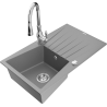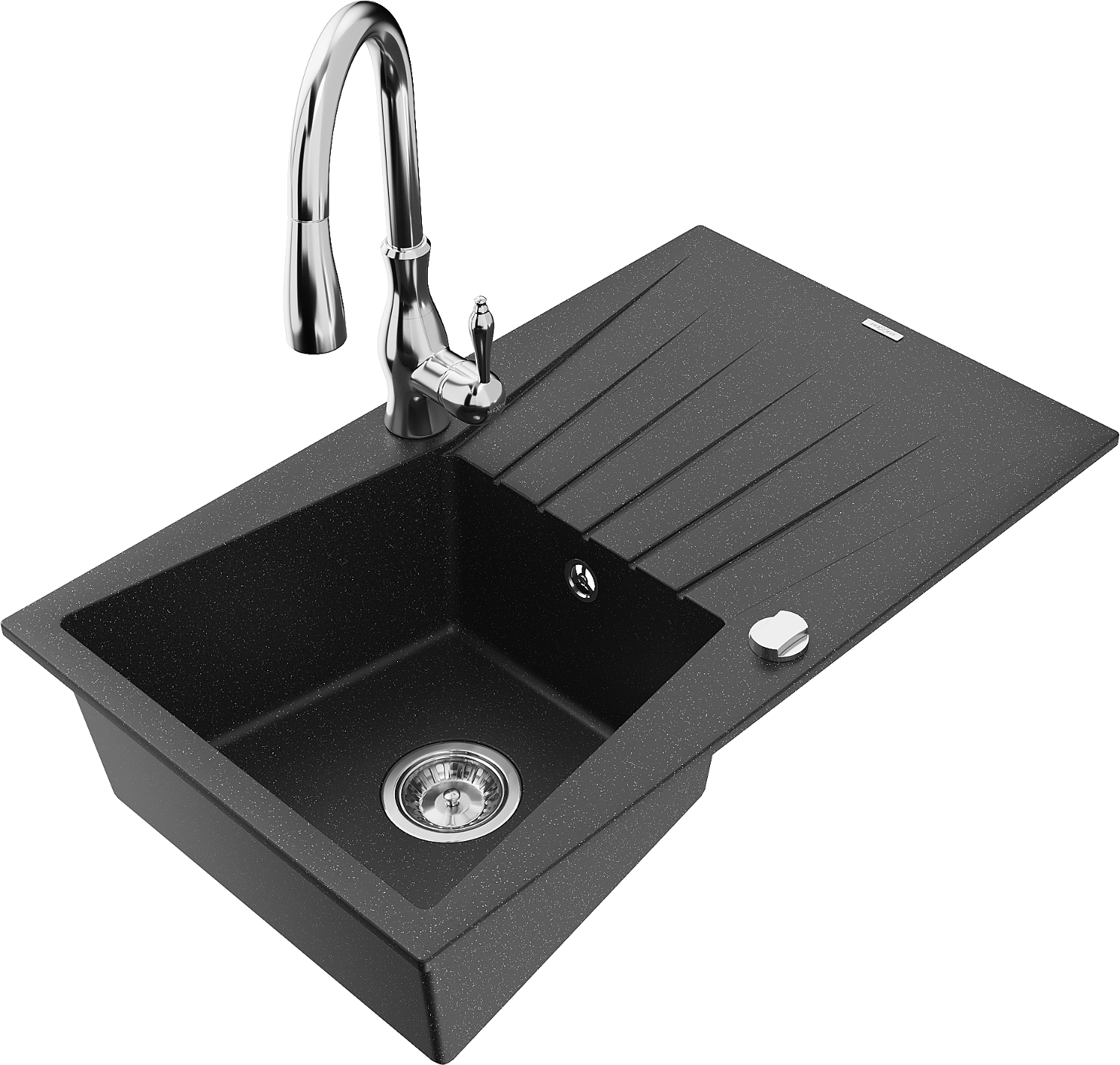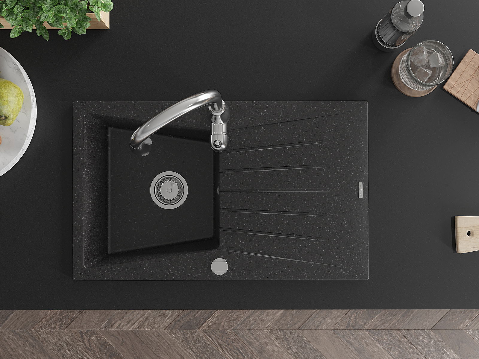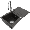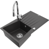 Mexen Cesar granitinė vienos kameros kriauklė su nutekėjimu ir virtuviniu maišytuvu Savita, juoda/sidabrinė metaliko spalva